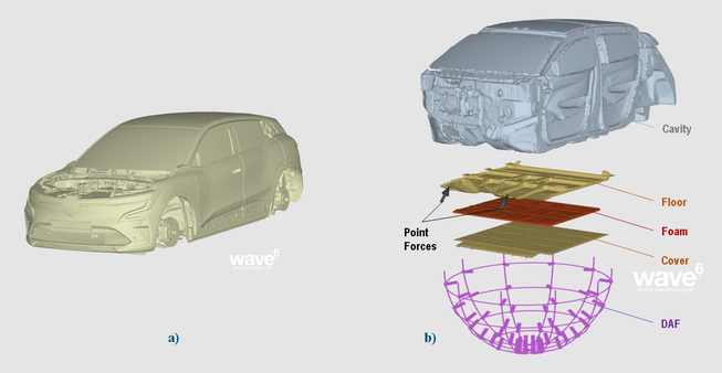 A A A RENAULT Smart Cocoon Technology vibro-acoustic simulation MORDILLAT Philippe 1 RENAULT Group 1 avenue du Golf, 78288 Guyancourt Cedex FRANCE ABSTRACT RENAULT was the first OEM to introduce mass production Battery Electric Vehicles in Europe with the ZOE in 2012. With the new MEGANE ETECH, RENAULT set the NVH comfort to higher level to match the customer expectation on BEV vehicles. One of the components of the silence of MEGANE is the “Smart Cocoon Technology”, a technology that transforms the battery into an acoustically active element. This innovative solution has been developed to integrate the battery mass in the Trans- mission Loss. It has drastically improved the floor transparency and damping, thanks to an insulation foam embedded between the body floor and the battery casing. To support the development of this technology, RENAULT and its CAE partner DASSAULT SYS- TEMES are developing simulation methodologies to predict the behavior of the smart cocoon tech- nology on the whole vehicle NVH performance, optimize the performance and weight of the insulation package, and to secure the assembly process. This paper presents in detail each step of this CAE process to assess the NVH performance of the “Smart Cocoon Technology”. Finally, to validate the accuracy of this process, CAE results will be compared with the test measurement from the MEGANE prototype worm 2022 1. INTRODUCTION With the development of electrical vehicles, OEMs (Original Equipment Manufacturers) are focusing their R&D resources and investments in the developments of new technologies to improve the quality and comfort of products. One of the keys is to take benefits from the specificity of Battery Electric Vehicles thanks to new concepts and designs, which could drastically change EVs architecture as conceived today. Such changes also translate into new constraints, new functional requirements, and material specifications for other systems or components. From an NVH perspective, for example, the battery mass has a potentially great acoustic benefit for the interior compartment. For the development of the New Megane Etech RENAULT has developed and patented a technol- ogy called “Smart Cocoon” that consist in a layer of highly damped foam placed between the bat- tery top cover and the whole surface of the central floor (Figure 1). Its gains can be felt from 30 km/h. The foam creates a cocoon effect in the passenger compartment worthy of premium vehicles in the benefits of the silence of the passenger compartment, music or passenger discussion. In addi- tion, the "Cocoon Effect Technology" has the advantage of improving lightness. It saves 3 kilos compared to a traditional acoustic insulation solution. 1 philippe.mordillat@renault.com Confidential C worm 2022 Figure 1: RENAULT Megane Etech – Smart Cocoon Technology However, anticipate this benefit is critical to guarantee the most pleasant NVH experience for pas- sengers. Then CAE is key to assess the benefits of the foam. DASSAULT SYSTEMES wave6 soft- ware [1] is used at RENAULT to simulate the energy propagation in soft trims for different compres- sion ratio, as well as the structure-borne response and the air-borne insulation effect in the vehicle from low to high frequencies. This paper will present the simulation procedure and the main results of the effect of the “Smart Cocoon” foam. 2. VIBRO-ACOUSTIC MODEL 2.1. Overview of the model The addition of the compressed foam between the floor and the cover has an effect on the noise inside the vehicle cavity. In order to assess the effect of the foam on the NVH performances, a vibro-acoustic model is built using the commercial software wave6 [1]. The full vehicle is initially modelled using finite elements (FE) (see Figure 2a). A subset including only the battery cover, the vehicle’s floor and the cavity is then extracted, in order to study simpler configurations (see Figure 2b). The floor is clamped at the position of the weld spots used to connect it to the rest of the car body, while the battery cover is clamped at screw’s holes. Two configurations are analyzed: a first one with an air-gap between the floor and the battery’s cover (initial configuration), and a second one with a block of foam placed in the air gap (Cocoon configuration). The foam and the air-gap meshes are generated in wave6 starting from the geometries of the floor’s base and the cover surface. A PEM (poro-elastic model) subsystem using the Biot’s model [2] is used to represent the foam. First, a polyurethane foam is used, then a comparison with a different foam materials is proposed. Confidential C 2.2. Loads Since the true loads are not yet known (they will be measured during a campaign that is planned before the conference), two different load types are considered. First, a diffuse acoustic field (DAF) is applied below the battery cover. Then, two point forces are applied close to the floor’s reinforce- ments on the engine side of the vehicle. Both loads are random with a constant amplitude spectrum in the whole frequency domain. The authors estimate these type of loads are representative of the ones present on the real car, although normalized and not frequency dependent. 2.3. Calculation of the Thickness Map of the Foam In the real vehicle, the foam is mounted on the cover and then compressed during the mounting of the floor. The compression of the foam can then locally reach high rates, with a non-negligible mod- ification of the foam’s physical properties. For this reason, a spatial modifier is used to account for the local change of properties of the foam. This is handled directly within the wave6 model as ex- plained below. worm 2022 Figure 2 : Finite Element Model : a) Full vehicle; b) Subset: Cavity, Floor, Foam, Cover and Loads (Acoustic: Diffuse Acoustic Field; Structural: Point Forces) The thickness map of the foam is calculated directly in wave6 using the floor and the cover as physical boundaries