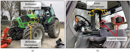 A A A Experimental tests of a multichannel active noise control system with single and multiple reference signal applied to the cabin of a tractor Francesco Mori 1 , Patrizio Fausti 2 , Francesco Pompoli 3 , Andrea Santoni 4 University of Ferrara, Engineering Department Via Saragat 1, 44122, Ferrara, FE, Italy Paolo Bonfiglio 5 Materiacustica s.r.l. Via C. Ravera 15/A, 44122, Ferrara, FE, Italy Pietro Nataletti 6 INAIL, National Institute for Insurance against Accidents at Work Via S. Gradi 55, 00413, Rome, RM, Italy ABSTRACT A feedforward active noise control system represents a valid solution whenever it is necessary to attenuate a disturbing noise at low frequencies. One example of application is the case of tractors, in which the agricultural operators are exposed for a prolonged time to loud low-frequency noise, mainly generated by the engine. Generally, the feedforward systems make use of one reference sensor to measure the noise produced by the main source. However, this way of proceeding could be inadequate to describe the disturbing noise, especially when the noise consists of both structure- borne and air-borne components. In this article, a comparison between the use of single and multiple reference signals, processed in a multichannel active noise control system applied to the cabin of a motionless tractor, is proposed. In particular, an accelerometer positioned on the turbocharger is used to sense the vibration generated by the engine, while a microphone placed near the cooling fan is used to sense the air-borne noise. The active system implements the filtered-X least mean squares (FXLMS) algorithm to produce the anti-noise signals. The results show that the use of two simultaneously acquired reference signals generates only small benefits in the performance of the active system. 1 francesco.mori@unife.it 2 patrizio.fausti@unife.it 3 francesco.pompoli@unife.it 4 andrea.santoni@unife.it 5 paolo.bonfiglio@materiacustica.it 6 p.nataletti@inail.it 1. INTRODUCTION The noise transmitted inside the cabin of the tractors generally has a predominance of low-frequency components associated with the engine orders, typically up to 1000 Hz. Passive treatments of the cabin for the attenuation of these components are not feasible due to the limited space inside the volume and due to the necessity of guaranteeing transparency of the windowed walls for visibility while maneuvering. Moreover, passive solutions are traditionally ineffective in the low-frequency range associated with the first orders of engine noise. On the other hand, active noise control (ANC) represents a valid solution to attenuate low-frequency noise levels. Such an approach can significantly reduce an undesired sound by exploiting the superposition with an opposite-phase signal, calculated starting from measured signals, which are processed in real-time. Due to the low sampling rate, necessary to process the signals in real-time, such a solution is suitable in the low-frequency range, where passive solutions cannot effectively reduce the disturbing noise. Furthermore, thanks to the use of an adaptive algorithm, the ANC system can dynamically track the variations of the disturbance source, instead of acting on a fixed frequency target as the traditional solutions. In the literature, only a few studies about ANC applications on tractors with a cabin can be found, implementing a feedback ANC system with two error microphones and two control sources, in which the reference signal is internally modeled [1, 2]. Feedforward ANC systems have been studied for applications on similar machines, endowed with a cabin, such as a fork-lift [3] or a harvesting machine [4], with one reference sensor, aimed to cancel the harmonic components of the engine noise. However, it is worth noticing that the engine is only one of the sources which affect the operator’s hearing inside the cabin and the noise propagation can be both air-borne or structure-borne. In this article, a multichannel feedforward ANC system applied to a tractor with a cabin is studied, comparing the effect of sensing one or two reference signals. In particular, one accelerometer detects the vibration, induced by the engine and propagating on a structural path, while a microphone identifies the air-borne component. The experimental tests are carried out on a motionless tractor, varying the number of rounds per minute of the engine, with the aim of canceling the first engine orders in the frequency range up to 1000 Hz at the driver’s head position. The ANC system uses a filtered-X least mean squares (FXLMS) algorithm with two error microphones and two control loudspeakers. The characteristics of the algorithm are described in Section 2, while the experimental setup involved in the ANC system is illustrated in Section 3. The results of the tests and the comparison between the use of one or two reference sensors are reported in Section 4. Finally, Section 5 illustrates the conclusions and the next steps of the development. 2. DESCRIPTION OF THE ALGORITHM The algorithm implemented in the feedforward ANC system is the classical FXLMS, for its simple scalability in the case of multiple sensors and actuators and for its robustness. Let’s consider a system composed by 𝑁 𝑟 reference sensors (in this case, microphones and/or accelerometers), 𝑁 𝑒 error microphones and 𝑁 𝑠 control sources. Moreover, we indicate with 𝐿 the length of the adaptive filters and with 𝑀 the length of the filters representing the secondary paths (i.e., the impulse responses from the 𝑗 -th control source to the 𝑖 -th microphone). Extending the algorithm operations illustrated in [5] to a more general case, the following real-time processing operations can be deduced. Firstly, the filtered reference signals 𝒙 𝒌,𝒋𝒊 ′ (𝑛) = [𝑥 𝑘,𝑗𝑖 ′ (𝑛) 𝑥 𝑘,𝑗𝑖 ′ (𝑛−1) … 𝑥 𝑘,𝑗𝑖 ′ (𝑛−𝐿+ 1)] are computed by convolving the e