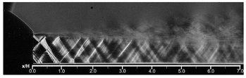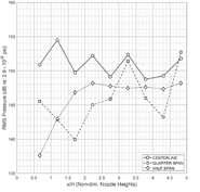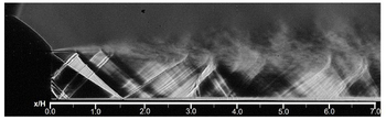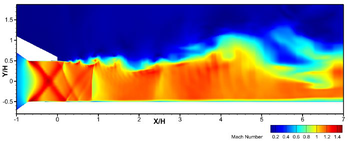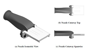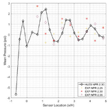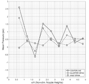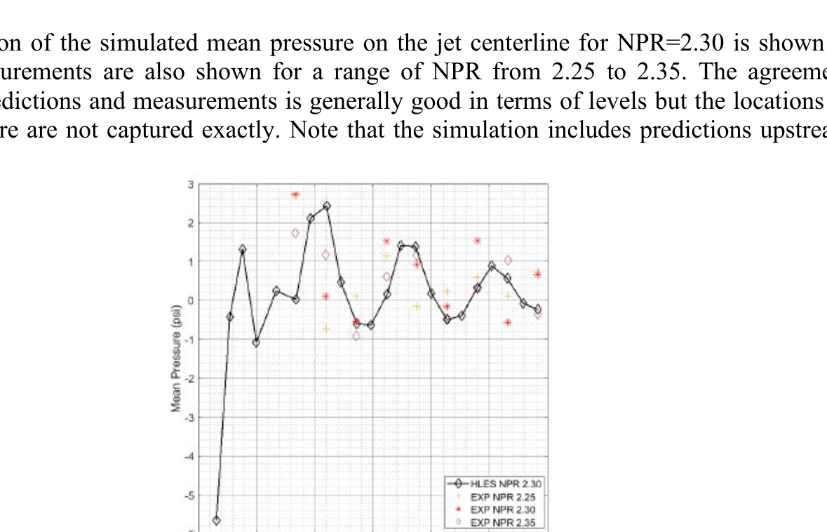 A A A Instructions for preparing the manuscript of the papers for Proceedings of INTER-NOISE 2022 GLASGOW Philip Morris 1 and Darryl Douglas 2 The Pennsylvania State University Department of Aerospace Engineering 229 Hammond Building University Park, PA 16802, USA ABSTRACT Aircraft designs may include an engine that exhausts over the upper fuselage of the aircraft. This design has many benefits including reduced noise below the aircraft. However, the scrubbing of the high-speed turbulent jet flow over the fuselage has the potential to cause structural fatigue. This paper describes an experimental/computational study of the surface pressure fluctuations induced by the supersonic jet flow. The model configuration consists of a rectangular convergent-divergent nozzle that exhausts over a flat plate. The plate is a continuation of the lower lip of the nozzle. Pressure measurements are made at several locations on the plate surface. In addition, schlieren visualization is used to identify the jet’s shock cell structure. Numerical simulations are performed using hybrid RANS/Large Eddy Simulation (LES). Results are compared between the simulations and the experiments. The importance of shock turbulent boundary layer interaction to the surface loading is identified. 1. INTRODUCTION Many recent designs for manned and unmanned aircraft feature an engine exhaust integrated into the upper surface of the fuselage. An example is the Northrop Grumman X-47B which is an unmanned combat aerial vehicle (UCAV). It is designed for carrier-based operations. The embedded exhaust results in low observability. However, the hot supersonic jet exhaust interacts with the fuselage aft-deck and may cause structural damage or fatigue. Due to the sharp throat on a typical combat aircraft vehicle, the jet exhaust will contain shocks, even when operating in a nominally on-design condition. It is hypothesized that the shock turbulent boundary layer interaction will generate unsteady surface pressure loading at frequencies with the potential to cause structural damage. Previous studies of the effect of an aft deck (and side walls) on the flow and acoustics of a supersonic rectangular jet include that by Tinney et al. [1]. They investigated the properties of an approximately 4:1 aspect ratio multistream nozzle with a design pressure ratio of 5.0. Core nozzle pressure ratios between 3.0 and 5.0 were considered. Aft deck surface pressures, schlieren visualization and far field pressures were acquired. Reynolds-Averaged Navier Stokes (RANS) simulations were performed and the agreement with the measured mean pressure on the deck and side walls was good. In a series of papers (Berry et al.[2], Magstadt et al.[3], Ruscher et al.[4]) 1 pjm@psu.edu 2 dad5668@psu.edu a Shea mar ce 21-24 AUGUST SCOTTISH BENT caso made near and far field acoustics measurements of an effectively two-stream rectangular nozzle flow exhausting over an aft deck. Far-field microphone and aft deck pressure measurements were made. Particle Image Velocimetry and high speed schlieren were also used. They observed a 34 kHz oscillation throughout the experimental domain which they attributed to Kelvin-Helmholtz instabilities inside the nozzle. The effects of heating one or both streams were also reported. The present paper reports on flow and surface pressure measurements for a 4:1 aspect ratio rectangular jet exhausting over an aft deck. The focus is on surface pressure fluctuations in the hundreds of Hertz, as relevant for structural response. In the interest of length only selected results from an ongoing research project are presented. Limited results from a hybrid RANS/LES are also presented. The next section describes the experimental facility, the instrumentation, and the numerical simulation approach. This is followed by averaged schlieren visualizations. Average and unsteady surface pressures are then presented. Following a brief description of the numerical approach, some preliminary unsteady flow simulations are given. Finally, conclusions based on the completed results are provided. 2. EXPERIMATAL FACILITIES, INSTRUMENTATION, AND NUMERICAL SIMULATIONS 2.1. Penn State Jet Aeroacoustics Facility The experiments were conducted in the Penn State Jet Aeroacoustics Facility. A schematic is shown in Figure 1. The facility is capable of simulating 1-inch equivalent diameter unheated or heat-simulated jets to a jet exit Mach number of 1.7. Heated jets are simulated using helium-air mixtures to match the heated jet acoustic Mach number. The jet temperature and pressure are controlled by means of a control panel and data are acquired and recorded using a LabVIEW workstation. Further details about the history of the facility, its design and operation can be found in Doty [5], Doty and McLaughlin [6], and Veltin [7]. Figure 1. Schematic of the Penn State Jet Aeroacoustics Facility. 2.2. Nozzle and aft deck model The rectangular jet nozzle has a 4:1 aspect ratio with a height of 0.443 in. and a width of 1.76 in. Downstream of the throat, the top and bottom walls are parallel, and the sidewalls diverge. The design Mach number equals 1.26, based on quasi one-dimensional isentropic flow relations. A previous model design had a separate aft deck section (see Lurie [8]) that was aligned with the lower lip of the nozzle. However, it was found that this generated either a forward or backward facing step at the lower jet exit which, in turn, generated spurious shocks and expansions. The new nozzle and aft deck design is shown in Figure 2. The deck is integrated into the lower wall of the nozzle, which eliminates any step at the jet exit. Also shown in Figure 2 are the locations of holes for the pressure transducers along axial lines at the jet center and quarter span and in line with the nozzle exit sidewall. Figure 2. Sketch of nozzle design: (a) isometric view, (b) CAD vertical centerline cutaway and, (c) CAD spanwise nozzle centerline cutaway. 2.3 Pressure measurement