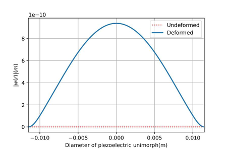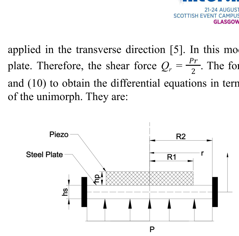 A A A A fully-coupled vibro-acoustic model of an electronic stethoscope Snehashis Mukherjee 1 Department of Mechanical Engineering Indian Institution of Technology Palakkad India 678557 Dr. Anoop Akkoorath Mana 2 Department of Mechanical Engineering Indian Institution of Technology Palakkad India 678557 ABSTRACT A piezoelectric based stethoscope picks pressure fluctuations originating from the patient and the physician sides. This may include unwanted acoustic signals from the patient and the doctor sides of the stethoscope, which needs to be filtered either electronically or mechanically by appropriately designing the vibro-acoustic elements of the electronic stethoscope. This work intends to establish a mathematical model of the piezoelectric stethoscope. Initially, a multi-degrees of freedom vibration model of the electronic stethoscope is developed. The model is used to compute the response of the piezoelectric plate due to the pressure excitations on the input side and that due to the displacements of the connected mechanical elements in the stethoscope. Further, a two-port lumped parameter model of the piezoelectric composite plate is developed to compute the output voltage created by the displacement of the piezoceramic disc. Here, an axisymmetric plate model is used to find the displacement of the piezoelectric composite plate. Subsequently, the vibration and the lumped parameter piezoelectric models are combined to represent the fully-coupled vibro-acoustic characteristics of the piezoelectric stethoscope. The model is further used to predict the voltage output from the piezoelectric stethoscope for certain pressure excitation at the patient side. 1. INTRODUCTION A stethoscope is the most common and crucial medical instrument that physicians use to primarily identify a prevailing medical condition of a patient. The design of an acoustic stethoscope is simple and effective [1]. There are two parts to an electronic stethoscope- (a) the chest piece, which works as a diaphragm and receives the signal, generated by the heart, (b) the bin-aural tube, which amplifies and transmits the sound to the physician’s ears. The noise cancellation and sensitivity of the chest piece are not very effective in the acoustic stethoscopes. A piezoelectric-based electronic stethoscope comes in handy here. The electronic signals generated by a piezoelectric stethoscope may be filtered or amplified appropriately to the specific requirement of a medical condition. 1 snehashismukherjee1999@gmail.com / 131801028@smail.iitpkd.ac.in 2 akkoorath@iitpkd.ac.in 21-24 AUGUST SCOTTISH EVENT CAMPUS ? 02 ? GLASGOW 21-24 AUGUST SCOTTISH EVENT CAMPUS ? 02 ? GLASGOW The current work aims to develop a mathematical model of the piezoelectric stethoscope. The mathematical model has two components- (a) a multi-degrees of freedom vibration model of the stethoscope and (b) a two-port lumped parameter model of the piezoelectric composite plate (unimorph). Subsequently, the vibration and the lumped parameter piezoelectric models are combined to represent the fully-coupled vibro-acoustic characteristics of the piezoelectric stethoscope. The model is further used to predict the voltage output from the piezoelectric stethoscope for certain pressure excitation at the patient side. L,=a J] - Vv 2. THE MULTI-DEGREES OF FREEDOM VIBRATION MODEL The electronic stethoscope consists of five parts: piezoceramic disc ( m 2 ) , steel plate ( m 1 ), transducer housing ( m 3 ), the foot ( m 4 ) and chest piece ( m 5 ). The mechanical model of the electronic stethoscope is established by creating a multi-degrees of freedom vibration model. The model (see Figure 1) deals with five discrete masses which are connected with one another via the spring-mass-damper system. This model is derived to study the response of the piezoceramic plate due to given excitation on the steel plate. Next, we derive the forced vibration equation of motion of this model. Figure 1: The multi-degrees of freedom vibration model. The Lagrange's equation [2]: . (1) , (2) where T = kinetic energy, V = Potential energy, Q = Work done. Further, the T , V and Q are derived and substituted in Eq. (1) to obtain the equation of motion of the system: , (3) where, , , x5 xa x x . Wwf m x . } AW tw m co ka m3 : @ ks ma 7 ms 6% G 21-24 AUGUST SCOTTISH EVENT CAMPUS ? 02 ? GLASGOW , , , k 5 is the stiffness coefficient between chest piece housing and foot, k 4 is the stiffness coefficient between foot and transducer housing, k 3 is the stiffness co-eff. between transducer housing and steel plate, k 2 is the stiffness coefficient between transducer housing and piezo, and k 1 is the stiffness coefficient between piezo and steel plate [3]. For starting the analysis, the equation of motion of the vibrational model should be represented as a state-space model. In this case, the vibrational model state is: Tr iy ay li WwW F=| #, IF Pp | JP medic p . (4) The state-space representation of the differential equation (Eq. (3)) related to the vibrational model is given as follows: , (5) where, , , . 3. THE LUMPED PARAMETER PIEZOELECTRIC MODEL 3.1 Two-port Electro-acoustic Model of the Piezoelectric Device To convert the pressure pulses into voltage signals we consider a piezoceramic devices. The output voltage from the piezo is proportional to the strain due to bending. The Lumped Element Model (LEM) of piezoelectric material has been discussed in [4] but in the LEM the z-dependence of the material properties has been omitted. In this article, we focused on studying the system including the z-dependence of the material properties. The specific piezo element within this stethoscope is taken as an axisymmetric piezo unimorph. To construct the output equation of the piezoelectric model, we assumed that the piezo is a LEM. This LEM gives us the freedom to construct an equivalent two-port electrical circuit (see Figure 2) and to provide a simple method to calculate the voltage output of the piezo for
