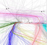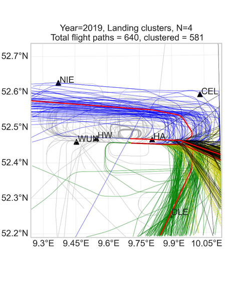 A A A A quantitative approach to density–based clustering of flight trajectories for e ffi cient air tra ffi c noise simulations Shreyas M. Guruprasad 1 , Gil Felix Greco 2 , Tobias P. Ring 3 and Sabine C. Langer 4 Institute for Acoustics (InA), Technische Universität Braunschweig Langer Kamp 19, D-38106 Braunschweig, Germany ABSTRACT The increased availability of air tra ffi c data has enabled the application of data–driven approaches to support the simulation of noise contours around airports. Aiming at e ffi cient aircraft noise simulations, this contribution proposes a framework for the probabilistic description of the air tra ffi c around an airport. The methodology is based on flight trajectory clustering using the density–based algorithm OPTICS. The clustered trajectories serve as a basis for the creation of backbone and dispersion tracks, which, together with a prescribed number of flight operations per aircraft type, provide a probabilistic description of the air tra ffi c to the noise simulations. A major focus is given to quantitatively assess the sensitivity of the OPTICS algorithm to di ff erent hyper–parameters to reduce the dimensionality of the problem. This framework is demonstrated utilizing a dataset of ADS–B flight trajectories associated with flights approaching the Hannover airport. Noise simulations based on the ECAC Doc. 29 best–practice method are conducted using the software SoundPLAN. A good agreement between noise contours is obtained when comparing simulations performed using the proposed framework and the full dataset while the computational time required is decreased. Furthermore, this approach identifies most of the trajectory patterns with the least amount of outliers. inter.noise % 2022 1. INTRODUCTION The expansion of Automatic Dependent Surveillance-Broadcast (ADS–B) technology has enabled open–source flight tracking data to become publicly available, supporting the analyses of aircraft operations at a large scale. This technology helps to track the position of an aircraft, along with other relevant parameters, by sending periodic messages to ground receivers and other aircraft. Recently, ADS–B data has been used in the context of many data–driven applications, such as the identification of air tra ffi c flows [1], to improve time of arrival estimations [2], and for the prediction of aircraft emissions [3], to name a few. Flight trajectory data provided by ADS–B sensors can be used for the study of aircraft noise in many di ff erent ways. Concerning aircraft noise simulations based on best–practice methods, such 1 s.guruprasad@tu-braunschweig.de 2 g.felix-greco@tu-braunschweig.de 3 t.ring@tu-braunschweig.de 4 s.langer@tu-braunschweig.de as the Doc. 29 from the European Civil Aviation Conference (ECAC) [4], ADS–B data is suitable to provide input information describing the aircraft’s trajectory in terms of geographical position, altitude and velocity. Moreover, the ADS–B data can be used indirectly for best–practice aircraft noise simulations based on a probabilistic representation of the air tra ffi c. This is achieved by identifying air tra ffi c flows around an airport, which are then individually described in the noise simulations as flight corridors by so–called backbone– and side–tracks along with its corresponding number of flight movements. Therefore, in this case the noise simulations are performed based on the probabilistic description of flight movements along a flight route instead of considering all individual flight movements occurring at the same route. The probabilistic approach is specially useful for the noise forecast of future air tra ffi c scenarios, when data concerning single flight trajectories explicitly is not yet available. Moreover, this approach has been previously demonstrated to be more e ffi cient in terms of computational cost when compared to the use of a full dataset of flight trajectories for the noise simulation of large air tra ffi c scenarios [5]. The identification of air tra ffi c routes around an airport requires a large dataset of flight trajectories and is typically performed using density–based clustering algorithms [6, 7] to automatically extract main air tra ffi c flows from a sample of flight track data in the region of interest. In this context, a flow can be defined as a pattern in which 1) entities move along the similar paths / routes in a spatial dimension and 2) the movements starts / ends within the same time interval. Moreover, the identification of air tra ffi c flows from aircraft tracking data can be framed as a problem of discovering spatial and temporal trends in the collective movement of aircraft through space and time [8]. Aiming at e ffi cient noise simulations, this contribution proposes a framework for the probabilistic description of the air tra ffi c around a medium–size airport based on density–based flight trajectory clustering. Traditional clustering algorithms are very sensitive to values of input parameters, often producing very di ff erent partitioning of the data set even for slightly di ff erent parameter settings [9]. Therefore, we quantify the influence of the input hyper–parameters on the clustering performance using local and global sensitivity analysis. Thereafter, an optimal input parameter setting for trajectory clustering is used for deriving a probabilistic description of the air tra ffi c. Finally, aircraft noise simulations are performed and the results obtained using the probabilistic model are compared to the results obtained using the full flight trajectory dataset, where each flight trajectory is individually simulated. This work is structured as follows: the methodology used for this purpose is introduced in Section 2, which includes the description of the steps involved in the pre–processing of the flight trajectories, evaluation of the performance of the clustering algorithm, and the details of the probabilistic