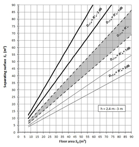 A A A Acoustic classification with the descriptor of the weighted standard- ized level difference D nT,w with use of the weighted apparent sound re- duction index R ’ w Reinhard O. Neubauer 1 IBN Bauphysik GmbH & Co. KG Theresienstraße 28, 85049 Ingolstadt, Germany ABSTRACT Buildings must ensure sound insulation appropriate to their use. This sound insulation is regulated by building regulations. In many Europe countries this is by use of the weighted apparent sound reduction index R’ w or the weighted standardized level difference D nT,w . This paper shows that a direct assignment of the quantities R’ w and D nT,w is only possible for certain geometric ratios of room volume to separating area (V/S). If a permissible deviation between R’ w and D nT,w is accepted, a classification of sound insulation values (R’ w ) with fixed class limits can be made. This makes it possible to classify the sound insulation with reference to the descriptive parameter D nT,w using the weighted apparent sound reduction index R’ w . 1. INTRODUCTION The classification of soundproofing represents a certain challenge in terms of ranking airborne sound insulation in classes. Soundproofing as a conceptual quantity has a subjective meaning, namely the perceived protection against disturbing noise immissions [1]. Instead of a physical quantity the pro- tection is described by a perceptual quantity. On the other hand, sound insulation represents a physical quantity and can be seen as the equivalent to an electrical resistance or a thermal insulation resistance, as it is found in the term thermal insulation [2]. Various European countries have established classi- fication systems, partly as parameters of soundproofing (e.g. D nT,w ) and partly as parameters of sound insulation (e.g. R ' w ). In this article it will be shown how a classification of soundproofing, with refer- ence to the descriptive parameter D nT and backed by the parameter of the sound insulation R ', is possible. 2. CHARACTERISTICS OF SOUNDPROOFING AND AIRBORNE SOUND INSULATION In this context a distinction must be made concerning soundproofing and airborne sound insulation. The biggest difference between soundproofing and airborne sound insulation is that soundproofing is a process of a heard sound while airborne sound insulation is related to the process of blocking air- borne sound by entering a room. Sound Insulation is the ability of building elements or structures to reduce sound transmission. The sound pressure level in the receiving room of both quantities is de- pending on the sound absorption properties of the receiving room. Basically, the sound absorption and reverberation time are mathematically related. Thus, the reverberation time is a measure of the sound absorption of the room. 1 dr.neubauer@ibn.de a 2022 2.1. Sound insulation measure R ‘, R ‘ w The sound insulation value R is defined by ten times the decadal logarithm of the ratio of the sound power that hits a separating component in the transmission chamber and radiates from the separation component in the receiving room. If all transmission paths involved in the sound transmission are included, apparent sound reduction index R ' results. It is calculated according to Equation 1: 𝐴 𝐴 ቁ [𝑑𝑑𝑑𝑑] , (1) 𝑅𝑅’ = 𝐿𝐿 1 −𝐿𝐿 2 + 10 𝑙𝑙𝑙𝑙𝑙𝑙ቀ 𝑆 with L 1 and L 2 denoting the energy-average sound pressure levels measured in the source and receiv- ing room, in dB. S is the area of the partition between the sending and receiving rooms, in m², and A is the equivalent sound absorption area in the receiving room, in m². The calculation of the equivalent sound absorption area A in the receiving room is based on the measured reverberation time T using Sabine's equation assuming a diffuse sound field [3]. The for- mula for the equivalent sound absorption area A is given in Equation 2: 𝑇 [𝑚𝑚²] , (2) 𝐴𝐴 = 0,16 𝑉 where V is the volume of the receiving room, in m³, and T is the reverberation time in the receiving room, in s. The results obtained for the sound insulation value R ' strictly depend on the application of Sabine's formula, i.e., the applicability of the Equation 2. Therefore, two important requirements must be ful- filled when determining the sound insulation value R ': On the one hand, the validity of the statistical reverberation time theory according to the formular of Sabine and, on the other hand, the correct measurement of the reverberation time in the receiving room. Introducing Equation 2 in Equation 1, yield: 𝑉 𝑉 ቁ+ 10 log(𝑇𝑇) + 8 𝑑𝑑𝑑𝑑 [𝑑𝑑𝑑𝑑] , (3) 𝑅𝑅’ = ∆ 𝐿𝐿+ 10 𝑙𝑙𝑙𝑙𝑙𝑙ቀ 𝑆 with ∆ L denoting the level difference of L 1 and L 2 of the energy-average sound pressure levels meas- ured in the source and receiving room, in dB. The reciprocal value of the ratio ( S / V ) reflects the room height ( h ) for ceilings and either the room width or the room length for partition walls. When examining partition walls, the assignment of the spatial dimension is therefore not determined. The numerical value of 8 dB results from the applica- tion of Sabine's equation from the ratio (24 ln10/ c 0 ), where c 0 represents the speed of sound in air. For the ratio assumed at 0.16, the speed of sound is assumed to be 345.6 m/s [4]. R ' is frequency dependent. To obtain a single number, the weighted apparent sound reduction index R ' w is determined with the help of a reference curve according to ISO 717-1 [5]. ISO 16283-1 [6] describes the fact that the sound reduction index R ' has a weaker connection to the subjective impression of airborne sound insulation compared to the standardized sound level difference D nT . 2.2. Standardized level difference D nT , D nT,w The standardized sound level difference D nT is defined by the sound pressure level difference between the transmitting and receiving rooms using a reference reverberation
