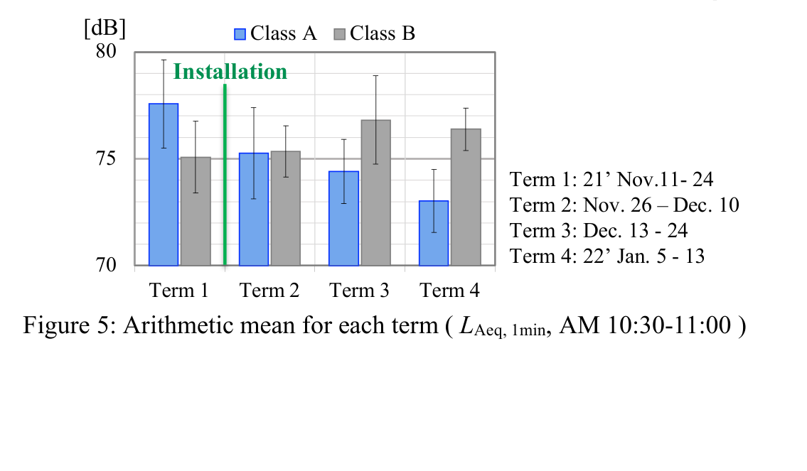 A A A The meaning of sound environment for children with special needs: Action research on room acoustics in child development support center Saki Noguchi 1 Acoustic Design for Children / Meiji University Hamamatsu City, Shizuoka, Japan Minami Arai 2 Kanako Ueno 3 Meiji University 1-1-1, Higashimita, Kawasaki City, Kanagawa, Japan Hisao Funaba 4 Acoustic Design for Children / Yokohama National University Ota-ku, Tokyo, Japan Tomoko Matsumoto 5 Nearai Gakuen 667-1, Nearaicho, Kita-ku, Hamamatsu City, Shizuoka, Japan Ryoko Watanabe 6 Nearai Gakuen / Hamamatsu Gakuin University 667-1, Nearaicho, Kita-ku, Hamamatsu City, Shizuoka, Japan ABSTRACT This study aimed to investigate the meaning of a sound environment for children with special needs through conducting action research on room acoustics in a child development support center. First, the actual conditions were investigated through acoustic measurement, behavioral observation, and interviews with teachers. Results revealed that daily sounds comprised of loud voices, crying, and screaming voices. The teachers were aware of the problems with the sound environment. Second, an experiment to improve the sound absorption performance in the classroom was conducted. The effects of the alleviation of noisiness and enhancement of calmness were confirmed in the sound environment. This change had supported a child with hyperacusis for decreasing to blocking his ears or speaking actively. In addition, the interviews found that experiencing an environment with different reverberations presented an opportunity for teachers to become aware of their own voices. 1 noguchi.saki@kodomo-oto.org 2 uenoken@meiji.ac.jp 3 uenok@meiji.ac.jp 4 funaba.hisao@kodomo-oto.org 5 nearai@ruby.ocn.ne.jp 6 ryoko.onodera@gmail.com Sia inter noine 21-24 AUGUST SCOTTISH EVENT CAMPUS GLASGOW 1. INTRODUCTION At the child development support center, teachers with various specialities help children with special needs to work on various skills namely, communication, social, and language skills. Children and parents can use these facilities from any stage they become concerned about the children’s development. Among them, some children with special needs such as the autism spectrum have been either hypersensitive or insensitive to sensory stimulation [1,2]. In the context of the sound environment, children with hyperacusis experience intolerable pain in various aspects of their daily lives as a result of the sounds in their surroundings [3]. Thus, it is pertinent to secure a sound environment that is calm in which children with these characteristics can spend their time and have a stable relationship with people around. In collaboration with the child development support center, researchers in this study worked to create a sound environment for children with special needs. This paper reports the results of experiments focusing on the sound absorption performance of the classroom. In 2020, the Japanese architectural standard for sound absorption in the facilities of day-care center or kindergarten was established [4]. Many facilities still lack sound absorption. Adequate sound absorption is crucial from an educational point of view for children with significant development of language or communication, as underscored by the standards outlined by other countries [5, 6]. This is increasingly important for children with special needs, which is the focus of this study. According to the Japanese standard [4] mentioned above, the recommended value of sound absorption performance is underscored in three major stages: school classroom, nursery room, and hearing-impaired classroom. Previous studies in day-care center or kindergarten have shown that sound absorption has a positive effect on children and teachers [7-9]. Thus, the effect of sound absorption was verified, and the meaning of the sound environment for children with special needs was examined in this study. 2. METHOD 2.1. Images of the child development support center Table 1 outlines the details of the child development support center and Figure 1 shows the facility environment. The center offers day care programs for 0 to 12-year-old children, namely, a day-care program for children aged 2 to 6-years old on weekdays, a dual enrolment program combined with day care or kindergarten for children 3 to 6 years, a family support program, and afterschool activities for elementary school children. Various professional services are provided to support children’s development as well as their families. Table 1: Details of the child development support center Social welfare corporation, Public-build and private operate, established in 1974 Location : Shizuoka prefecture, Japan / Suburban residential area Architecture: Reinforced concrete construction, Single-story building, Lot area: 6,381 ㎡ , Total floor area: 1,257 ㎡ Number of staff (Teachers): 69 (45) Qualifications: Certified kindergarten teachers, Certified nursery teachers, Certified primary school teachers, Speech therapists, Occupational therapists, Certified public psychologists, Clinical psychologists, Nurses, Public health nurses, Certified social workers, etc. Number of children / Programs: Day care program on weekdays (2-to-6-year-old children): 80 (two or three classes per grade) Dual enrolment program along with a day-care center or kindergarten: 120 (one day a week or two days a month) Others: Family support program, afterschool activities for elementary school children (c) Sensory integration therapy room (b) Playroom (a) Classroom Figure 1: Facility environment 2.2. Research outline Since August 2021, this study has been conducting action research to create an environment for children in collaboration with staff from the center. The sound absorption performance improvement experiment was conducted for two classes of 4-year-old children (Table 2 and 3). The teachers requested to install sound-absorbing material in the room because Class A was noisier; hence, this stu