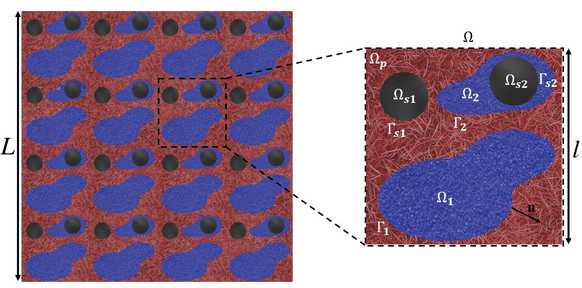 A A A Sound absorption of porous composites with heated impervious inclusions Gabriel Núñez 1 Universidad Austral de Chile (UACh) Instituto de Acústica, Valdivia, Chile Rodolfo Venegas 2 Universidad Austral de Chile (UACh) Instituto de Acústica, Valdivia, Chile Claude Boutin 3 Université de Lyon Ecole Nationale des Travaux Publics de l’Etat (ENTPE), Lyon, France ABSTRACT This paper investigates the sound absorption properties of porous composites with solid impervious heated inclusions, i.e. heat sources, which allow the temperature tuning of the porous constituents. By means of the two-scale asymptotic method of homogenisation, the wave equation in the composites with heated impervious inclusions is derived, allowing the material to be modelled as an equivalent fluid with e ff ective density and compressibility. Analytical and semi-analytical models for the acoustical properties of porous composites with inclusions of di ff erent geometries are developed, which are also numerically validated using the finite element method. This work demonstrates that adjusting the temperature of the porous constituents can provide an alternative way of controlling the absorptive properties of hard-backed porous composite layers, and highlights the dependence of the pressure di ff usion phenomenon on temperature. 1 gabriel.nunez@alumnos.uach.cl 2 rodolfo.venegas@uach.cl 3 claude.boutin@entpe.fr a slaty. inter.noise 21-24 AUGUST SCOTTISH EVENT CAMPUS O ¥, ? GLASGOW 1. INTRODUCTION Sound absorption of porous composites with solid impervious heated inclusions, i.e. heat sources, is investigated in this paper. These materials are constituted by a matrix made of a permeable material that contains one or more inclusions that can be made of either resistive or impervious materials, and can have di ff erent geometry or shape. Using the two-scale method of homogenisation [1], which allows to model heterogeneous media as equivalent fluids with atypical e ff ective parameters, a macroscopic description of sound propagation through these materials is derived. Analytical models for the e ff ective parameters of these composites are developed, which are also employed to exemplify the temperature-dependence of both the e ff ective properties of these materials, as well on the sound absorption coe ffi cient of hard-backed rigid-frame porous composites. Conventional permeable materials take an important role in the field of acoustics due to their capability of dissipating acoustic energy. If the solid frame of a conventional permeable material is considered rigid because it is either much heavier or sti ff er than the fluid saturating the pores, this capability exists due to the viscosity of the fluid and the thermal exchanges occurring between the fluid and the solid frame. Moreover, these e ff ects are quantified by modelling these materials as equivalent fluids with frequency-dependant complex-valued e ff ective properties such as dynamic viscous permeability [2] and compressibility [3], respectively. Since the acoustical properties of these materials have been extensively studied [4], their limitations are also accounted for. An alternative to these materials are porous composites which, due to the permeability contrast in their constituents, present two or more local acoustic pressure fields, where the pressure field in the matrix is constant at the local scale while the pressure in the inclusions fluctuates locally. The acoustic properties of porous composites have been thoroughly studied [5,6], including the development of a macroscopic description of acoustic wave propagation derived through homogenisation for composites with a single resistive inclusion per unit cell [5], and polydisperse heterogeneous porous composites [6]. These works, however, have not considered the influence of the temperature of the saturating fluid on the sound absorption properties of rigid-frame porous composites. Moreover, the dependence of the pressure di ff usion phenomenon on the temperature of the air inside the inclusions has not been investigated. Consequently, in this paper a rigorous description of sound propagation through porous composites with solid impervious heated inclusions is developed through the two-scale asymptotic method of homogenisation. The key contribution of this paper is to demonstrate the e ff ect of temperature in both the sound absorption properties of the composites, as well as in the pressure di ff usion phenomena occurring locally. 2. THEORY 2.1. Geometry and local description A generic geometry of a periodic rigid-frame porous composite with heated impervious inclusions saturated by air is shown in Figure 1, where L represents the macroscopic characteristic length and l the period of the material. The representative elementary volume (REV) of the composite is denoted by Ω and comprises a permeable matrix, indicated by Ω p , with N r highly resistive porous inclusions Ω i , indexed by i = 1 , ..., N r , and N s totally impervious solid inclusions Ω s j , where j = 1 , ..., N s , which act as slowly varying, with respect to the acoustic characteristic time, heat sources in the material. Moreover, all the inclusions can have di ff erent shape or size, and each of the resistive inclusions can have an impervious inclusion, i.e. a heat source, embedded inside of them. Then, the volume fraction of the matrix is given by ϕ p = Ω p / Ω while those of the i -th resistive inclusion and j -th impervious inclusion are ϕ i = Ω i / Ω and ϕ sj = Ω sj / Ω , respectively. The inclusions are completely surrounded by the matrix and their boundaries are denoted by Γ i for the resistive inclusions and Γ s j for the impervious inclusions. For the propagation of sound in the material, a long wavelength condition is assumed (i.e. λ ≫ l , Figure 1: Sketch of the scales and representative elementary volume (REV) of a generic porous composite with solid impervious heated inclusions. where λ is the sound