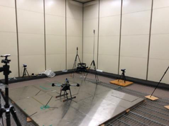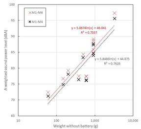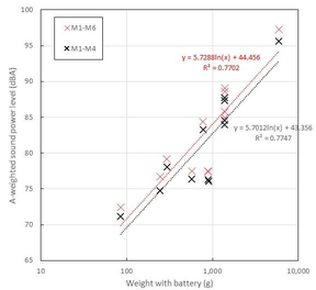 A A A Sound power level properties of hovering UAVs (drones) in a semi- anechoic room Gu-In Oh 1 Bon-Su Koo 2 Jang-Won Lee 3 Dae-Gwan Won 4 Yong-Hee Kim 5 Y’sU Youngsan University 288 Junam-ro, Yangsan, Kyeongnam, South Korea Seung-Soo Lee 6 Korea Conformity Laboratories 7 Nambusunhwan-ro, Seocho-gu, Seoul, South Korea Sang-Ho Kim 7 Konkuk University 120 Neungdong-ro, Gwangjin-gu, Seoul, South Korea ABSTRACT This paper investigated sound power level characteristics of various unmanned aerial vehicles (UAVs, drones) hovering at 0.5 m in a semi-anechoic room as a preliminary experiment to develop a standardized noise level measurement procedure. Eight types of quadcopter drones were used in the experiment, and its weight with battery ranged 85 g to 5.91 kg. In addition, effects of optional safety guards or low-noise type propeller were evaluated. Firstly, the measurement methods from ISO 3744 and ISO 3746 were considered, however it was not applied due to interference between top microphones and flying UAVs. Therefore, in the experiments, a measurement radius of 3 m and six essential measurement points were selected based on Directive 2000/14/EC for the noise radiation characteristics of equipment used outdoors. A-weighted sound power levels of the tested UAVs were calculated using energy-averaged surface sound pressure levels. As a result, the sound power levels of the tested UAVs ranged 72.8 to 97.5 dBW. The correlation coefficient between the sound power levels and the logarithmic value of the body weights with battery was 0.88. Additionally, the influence of optional parts on noise characteristics of the UAVs were discussed. 1. INTRODUCTION The unmanned aerial vehicle (UAV, drone) industry, which has begun to be developed for military purposes, is currently the most promising technical field and is widely used to meet private demand 1 gioh@gm.ysu.ac.kr 2 kbs@gm.ysu.ac.kr 3 jwlee@gm.ysu.ac.kr 4 dgwon@gm.ysu.ac.kr 5 yhkim@ysu.ac.kr 6 tmdtnwww@kcl.re.kr 7 woodnol2@korea.kr for industrial and leisure purposes [1-2]. Unmanned aircraft used in the private sector are collectively referred to as drones. It can be easily found in famous electronic shopping malls and local markets. It is reported that buzzing sounds from drones make people more annoy than the ground vehicles [3]. Although several researchers tried to figure out noise characteristics of drones in various approaches [4-6], there is no relevant standardized procedure to quantify drone noise. Therefore, it is urgent to establish performance standards and management measures to safely manufacture and operate it because it is a small aircraft subject to aviation law and has hazards such as safety accidents, noise from operation, and privacy [1]. ISO/TC20/SC16 deals with the unmanned aircraft systems, and WG5, which was opened in October 2019, is standardizing on testing and evaluation of UAV systems. There were several studies to examine noise characteristics of drones [7-8]. However, no test procedures for noise have yet been established. Since complaints about privacy violations or noise caused by drones are still occurring, standardization of measurement methods and evaluation standards for noise performance needs to be preceded first to revitalize the drone industry. In this study, sound power level characteristics of UAVs (drones) are investigated in a semi- anechoic chamber with various drone models in terms of a body weight. In addition, survey methods to measure sound pressure levels using sound level meter are suggested for in-situ testing of UAVs. Effects of optional parts such as safeguard, or low noise propeller are discussed. 2. MATERIALS AND METHOD ® 2.1. UAV Specimen Eight types of quadcopter drones were used in the experiment, and its weight with battery ranged 85 g to 5.91 kg. In addition, effects of optional safety guards or low-noise type propeller were evaluated. Figure 1 shows the pictures of the eight quadcopter drones tested in the semi-anechoic condition. (a) (b) (c) (d) (e) (f) (g) (h) Figure 1: Pictures of the eight quadcopter drones tested in the semi-anechoic condition with its weight including battery. (a) Tello; (b) Mavic Mini; (c) Mavic Air; (d) Skydio 2; (e) Mavic 2 Enterprise; (f) Mavic 2 Pro; (g) Phantom 4 Pro V2.0; (h) Custom-made quadcopter with axis distance of 730 mm. 2.2. Test Methods and Equipment The measurement methods of ISO 3744 and ISO 3746 were considered for deriving sound power level [9]. However, it was not applied due to interference between top microphones and flying UAVs. Therefore, in the experiments, measurement radius of 3 m and 6 essential measurement points were selected based on Directive 2000/14/EC for the noise radiation characteristics of equipment used outdoors [10]. A-weighted sound power levels of the tested UAVs were calculated using energy-averaged surface sound pressure levels. Commission Delegated Regulation (EU) 2019/945 specifies noise test code for the hovering drones at 0.5 m high on reflecting ground in a semi-anechoic room [11]. This procedure follows the requirements on ISO 3744 [9] with ten microphones as shown in Figure 2(a). However, there were some possibilities of physical interference between some unstably hovering drones and the tenth microphone on the top of the measuring hemisphere in a laboratory condition. Accordingly, this study followed the noise test code for measuring airborne noise emitted by equipment for use outdoors with six microphones based on the Directive 2000/14/EC as shown in Figure 2(b) [10]. In addition, survey testing method of sound pressure level using sound level meter was additionally considered for in-situ measurement as shown in Figure 2(c). Basically, hovering height was set to 0.5 m from a reflective ground for laboratory condition. Measurement radius was set to 3 m. All measurement results were expressed in terms of A-weighted sound power levels. As for measurement equipment, real-time FFT analyzer with six condenser micr