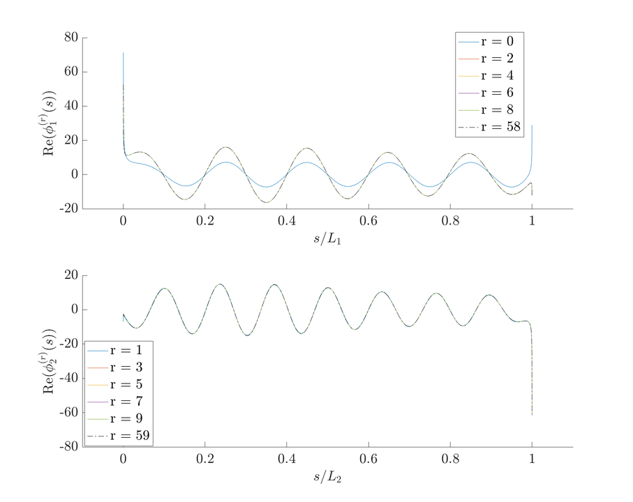 A A A Towards high frequency boundary element methods for multiple scattering Oliver Phillips 1 University of Reading Department of Mathematics and Statistics, University of Reading, Reading, UK Simon Chandler-Wilde 2 University of Reading Department of Mathematics and Statistics, University of Reading, Reading, UK Stephen Langdon 3 Brunel University London Department of Mathematics, Brunel University London, London, UK ABSTRACT Standard Boundary Element Methods (BEM) for time-harmonic acoustics, using piecewise polynomial finite-element type approximation spaces, have a computational cost that grows rapidly with frequency, to ensure at least a fixed number of degrees of freedom per wavelength. Hybrid Numerical-Asymptotic (HNA) BEMs, based on enriched approximation spaces consisting of the products of piecewise polynomials with carefully chosen oscillatory functions, have a computational cost that is almost frequency-independent for some problem classes, but the technology is largely undeveloped for problems where multiple scattering is important. In this paper we present a computational method, supported by mathematical analysis, which suggests that multiple scattering configurations may be within reach. Specifically, we propose an algorithm to solve, by a HNA BEM, scattering by a pair of screens in an arbitrary configuration, which we anticipate may serve as a building block towards general multiple scattering problems with computational cost independent of frequency. The specific configuration considered, as we discuss, is relevant to the simulation of multiple outdoor noise barriers. 1. INTRODUCTION It has been shown that noise pollution in highly populated areas can have a negative e ff ect on people’s health [1]. One potential method to reduce noise pollution from motorways or high-speed train lines is the use of noise barriers designed to di ff ract, reflect and / or absorb unwanted noise, leading to 1 o.j.phillips@pgr.reading.ac.uk 2 s.n.chandler-wilde@reading.ac.uk 3 stephen.langdon@brunel.ac.uk a slaty. inter.noise 21-24 AUGUST SCOTTISH EVENT CAMPUS O ¥, ? GLASGOW Figure 1: A cross-section through an infinite line source between parallel noise barriers on a hard ground surface (left). By simple method of images arguments this is equivalent to the di ff raction of the original source plus an image source in the ground surface by two noise barriers in free space (right). significant sound level reductions in the shielded areas [2,3]. In this paper we describe a method that e ffi ciently computes the scattered field in 2D due to the interaction of an incident coherent line source of sound interacting with two screens in free space, which (see Figure 1 and [3]) can be used to model parallel noise barriers sitting on a ground surface. Our time-harmonic acoustics approach is to use a so-called hybrid-numerical-asymptotic (HNA) boundary element method (see, e.g., [4,5]), i.e. a BEM with enriched basis functions derived from consideration of the high-frequency asymptotic behaviour of the solution. These enriched basis functions are designed to capture e ffi ciently the oscillatory acoustic field with a number of degrees of freedom which is essentially independent of the frequency. This contrasts with the need, in standard BEM based on piecewise-polynomial approximation, to increase the number of degrees of freedom in proportion to the frequency, e.g. using “10 degrees of freedom per wavelength”, to maintain accuracy as the frequency increases. For simplicity we focus in our description on the idealised case when the screen surfaces are sound soft (i.e., the acoustic pressure vanishes), but the method should extend straightforwardly to sound hard or impedance boundary conditions (cf., e.g., [6]). 2. PROBLEM STATEMENT We consider the scattering of a time-harmonic incident wave u i (e − i ω t time dependence), that could be either one or m ore poi nt sources or a plane wave, by the union of two disjoint 1 D screens, Γ = Γ 1 S Γ 2 , in D = R 2 \ Γ , where Γ denotes the closure of Γ . The two screens can be in any orientation so long as they are not touching (examples are Figure 2 or the right hand side of Figure 1). The scattering problem we are looking to solve is to find the total field u ∈ C 2 ( D ) ∩ W 1 loc ( D ) (our standard function space notations are those of, e.g., [7]) such that ∆ u + k 2 u 0 in D , (1) u 0 on Γ , (2) where k > 0 is the wavenumber and the scattered field u s = u − u i satisfies the standard Sommerfeld radiation condition. It follows from Green’s 2nd identity (see, e.g., [4,5]) that Z u ( x ) = u i ( x ) − i H (1) 0 ( k | x − y | ) φ ( y ) ds ( y ) , x ∈ D , (3) 4 where φ ∈ e H − 1 / 2 ( Γ ) is the jump in the normal derivative of u across the boundary and H (1) 0 is the Hankel function of the first kind of order zero, see [5] for details. Further, φ satisfies the boundary integral equation Z u i ( x ) = i H (1) 0 ( k | x − y | ) φ ( y ) ds ( y ) , x ∈ Γ . (4) 4 Our solution method will be to solve Equation 4 for the unknown function φ on Γ by a HNA BEM, following which the solution in the domain D is given as an integral over Γ by Equation 3. 3. MULTIPLE SCATTERING ITERATIVE METHOD For simplicity we consider the case where u i is the incident plane wave u i ( x ) : = e i kx · d , where d is a unit vector in the direction of the plane wave. For ease of notation, define φ j : = φ | Γ j ∈ e H − 1 / 2 ( Γ j ), and let S ℓ, j : e H − 1 / 2 ( Γ j ) → H 1 / 2 ( Γ ℓ ) be defined by S ℓ, j ψ ( x ) : = Z Γ j H (1) 0 ( k | x − y | ) ψ ( y ) ds ( y ) , x ∈ Γ ℓ , (5) for ψ ∈ e H − 1 / 2 ( Γ j ) and ℓ, j = 1 , 2. Equation 4 can then be written as S 11 φ 1 + S 12 φ 2 u i | Γ 1 , (6) S 21 φ 1 + S 22 φ 2 u i | Γ 2 . (7) Figure 2: Re( u ) in D , with the screens Γ 1 on the left and Γ 2 on the right. The incident wave is a plane wave with direction d indicated by the arrow, and k = 5.