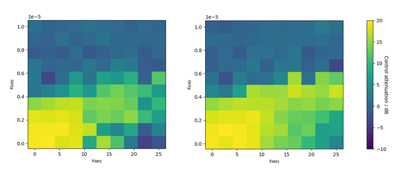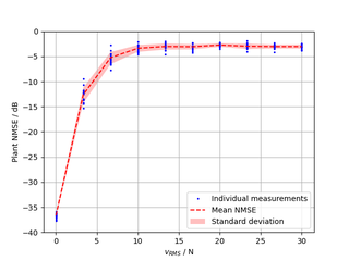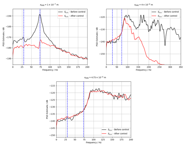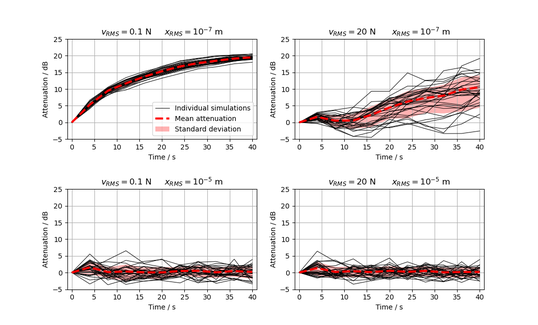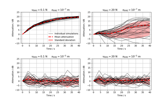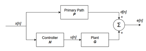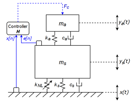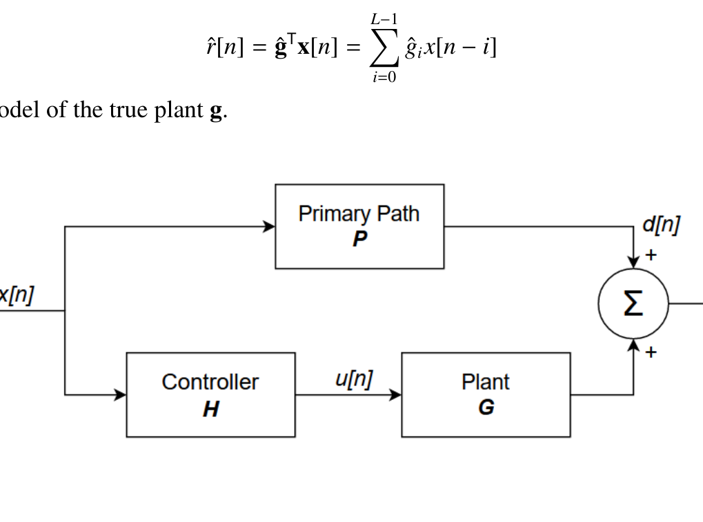 A A A Limitations of FxLMS in feedforward active vibration control of a nonlinear two degree of freedom system Xander Pike 1 , Jordan Cheer 2 Institute of Sound and Vibration Research, University of Southampton University Road, Southampton, SO17 1BJ, United Kingdom ABSTRACT Active control systems are often used to surmount the challenges associated with passive noise and vibration control measures to control low frequency disturbances, since they achieve control without the application of large or heavy control treatments. Historically, linear active control strategies have been used in feedforward control systems to drive the control source to minimise the signal measured at the error sensor. Amongst the various control algorithms available, the Filtered-reference Least Means Squares (FxLMS) algorithm has become extremely popular in the last few decades due to its relatively good performance and high level of robustness, as well as simplicity in both design and application. However, when the system under control contains nonlinearities, either in the primary or secondary paths, the performance of the FxLMS algorithm can degrade dramatically. This paper explores the performance limitations of the FxLMS algorithm when applied to the control of a two degree of freedom mass-spring-damper system with linear and cubic nonlinear sti ff ness terms. The aim of this study is to improve understanding of and inspire better design of nonlinear control systems. The e ff ect of the nonlinearity on the statistical uncertainty in the plant model is discussed, as well as the e ff ect on reliable control performance. 1. INTRODUCTION Sources of noise and vibration can be problematic in engineering applications, as well as in daily life. Exposure to loud or unpleasant noise can have a detrimental e ff ect on both the quality of life and health of individuals. Unwanted vibration within engineering systems can result in reduced performance in, or damage to, the systems over time. It is therefore desirable to minimise such noise and vibration where possible. Passive control solutions can help to minimise such noise and vibration, but may become overly large or heavy when required to control low frequencies. To overcome these limitations, active noise and vibration control systems may be implemented, which can have greater performance at low frequencies under these constraints. Active control systems, in general, aim to produce an ‘anti-noise’ signal at the measurement point, so as to minimise a measured error signal. This error signal may be an acoustic disturbance, 1 ap1u20@soton.ac.uk 2 j.cheer@soton.ac.uk a slaty. inter.noise 21-24 AUGUST SCOTTISH EVENT CAMPUS O ¥, ? GLASGOW displacement of an oscillating system, or some other time-dependent metric which it is desirable to minimise. Since its early development in the late 20 th century [1], the Filtered-reference Least Mean Square (FxLMS) algorithm has become extremely popular and well-known due to its simple application, low computational load and robustness. This algorithm uses a model of the system plant to adaptively produce a Finite Impulse Response (FIR) control filter. FxLMS has been well studied for linear systems and causes of low performance or failure of the algorithm are well understood [2–4]. However, nonlinearities, either in the primary or secondary path, can have a significant impact on the results of the algorithm [5–7]. A number of papers have investigated the performance of the FxLMS algorithm in control of nonlinear systems [5,8,9]. However, the focus of such work has tended to be on nonlinearities within the plant of acoustic control systems [10,11]. This is well justified, as a typical source of nonlinearities is saturation in the control loudspeakers or actuators. However, nonlinearities may also arise within the primary path of a system [12] and, in the case of a vibration control system, such a nonlinearity may be coupled to the plant. In this paper, a simple model of a nonlinear vibration control system is simulated and studied. In Section 2, a theoretical overview of the FxLMS algorithm is given. In Section 3, the vibration system under control and the method of simulation are described. In Section 4, the e ff ect of the nonlinearity on adaptive plant modelling is discussed. In Section 5, the e ff ect of the nonlinearity on control performance is explored. Section 6 presents conclusions from the work. 2. THEORY 2.1. FxLMS Overview A typical block diagram of a feedforward active control system is given in Figure 1. In the time domain, this system may be described as e [ n ] = d [ n ] + h T [ n ] r [ n ] (1) where h T [ n ] is a row vector of the I FIR control filter coe ffi cients of value h i [ n ] at time index n , and r [ n ] is a column vector of the last I samples of r [ n ], being the the reference signal x [ n ] filtered by the plant of the system L − 1 X r [ n ] = g T x [ n ] = i = 0 g i x [ n − i ] (2) where g T is a row vector of length L describing the impulse response of the system plant with individual coe ffi cients g i . A cost function J is defined as the expectation of the square error signal in the time domain J = E [ e 2 [ n ]] (3) and, assuming a purely linear and time invariant noiseless system, it can be shown that this cost function can be written in Hermitian quadratic form as a quadratic function of the controller coe ffi cients h [ n ]. This cost function is guaranteed to have a global minimum if the autocorrelation matrix R = E [ r [ n ] r T [ n ]] is positive definite. This minimum can be approached iteratively by updating the controller coe ffi cients h [ n ] according to the FxLMS algorithm h [ n + 1] = h [ n ] − α ˆ r [ n ] e [ n ] (4) where ˆ r [ n ] is a column vector of the previous L samples of the reference signal x [ n ], filtered by an appropriate model of the plant, which in the time domain can be expressed as L − 1 X ˆ r [ n ] = ˆ g T x [ n ] = i = 0 ˆ g i x [ n − i ]