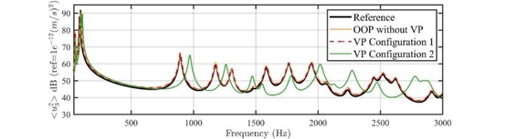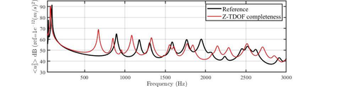 A A A Numerical investigation of the effects of model uncertainties on com- ponent-based transfer path analysis method with dynamic substruc- turing applied to aircraft-like components. Simon Prenant 1 , Thomas Padois, Thomas Dupont and Olivier Doutres Department of Mechanical Engineering, École de technologie supérieure, 1100 rue Notre-Dame Ouest, Montréal, Québec, H3C 1K3, Canada ABSTRACT The hydraulic pumps are considered to have a major contribution to the structure borne noise gen- erated inside aircrafts. Methods such as Component-Based Transfer Path Analysis (CB-TPA) are promising tools for aircraft manufacturers to build internal processes for the specification, design and validation of the impact of vibrating systems on new aircrafts. However, the experimental ap- plicability of these methods remains limited due to some experimental difficulties. CB-TPA’ formu- lation is based on dynamical quantities, which require the determination of terms related to rotational degrees of freedom. Indirect methods such as Virtual Point (VP) are commonly employed for this purpose, but it results in more cumbersome experimental set-ups and increased measurement uncer- tainties. The implementation of these methods can also be difficult in the case of a flat and thin re- ceiving structure as commonly encountered in aircraft applications, since in-plane translational ex- citations have to be applied and the access to the vibrating system/structure interface points is lim- ited. In this work, a decoupling procedure is used to overcome these issues. A numerical model is used to investigate the influence of model uncertainties on the CB-TPA’ predictions, when the dy- namical quantities are provided by VP method including the decoupling procedure. Keywords: Dynamic Substructuring, Component-Based Transfer Path Analysis, model uncertainty 1. INTRODUCTION The Structure Borne Noise (SBN) induced by the hydraulic pumps contributes to annoying acoustic level in the cabin of aircrafts [1]. The work sharing rules are such as the hydraulic pump is designed by a supplier according to the aircraft manufacturer specification. Component-Based Transfer Path Analysis (CB-TPA) encompasses a set of methods potentially useful for the aircraft manufacturers to build internal processes for the specification, design and validation of the impact of hydraulic pumps on new aircrafts. CB-TPA formulation requires an intrinsic active dynamic quantity of the vibrating system (i.e., equivalent forces) and a passive dynamic quantity of the assembly (i.e., mobility matrix) for estimating the dynamic response of this latter [2]. The mobility could be directly measured on the assembly or estimated using Dynamic Substructuring (DS) procedure [3]. The joint use of CB-TPA and DS, referred to as CB-TPA-DS hereafter, is the only CB-TPA method well suited for the design phase since requires only intrinsic dynamic quantities of the source (i.e., hydraulic pump) and receiv- ing structure (i.e., aircraft structure). The applicability of CB-TPA-DS is restrained by multiple experimental difficulties, such as the de- termination of terms related to Rotational Degrees of Freedoms (RDOFs). The omission of these terms is generally considered as an important source of inaccuracies for the estimations provided by 1 simon.prenant.1@ens.etsmtl.ca worm 2022 CB-TPA-DS [4], [5]. These investigations were generally conducted on automotive structures but similar conclusions were drawn recently for aircraft-like structures [6]. The determination of the terms related to RDOFs requires indirect methods, such as the Virtual Point method (VP) [7]. This method allows an explicit determination of the terms related to the RDOFs at an interface point by multiple non-aligned and non-coaxial Translational DOFs (TDOFs), distributed on a surface considered as having a rigid body behavior. Consequently, the excitations and sensors at the interface point have to be located close to each other in practice, otherwise model uncertainty are induced by the breach of the rigid behavior assumption [8], [9]. Furthermore, aircraft structures are typically made of beams and plates. The latter structures are thin and flat, which complexifies the application of in-plane excitations and hence of the VP method to assess their FULL mobility matrix (6 DOFs); yet required for an accurate application of the CB-TPA-DS method on such structure. This paper aims to evaluate numerically the robustness of three approaches for determining the mo- bility of a flat receiving structure, in order to determine the dynamic response of an aircraft-like as- sembly by a CB-TPA-DS method. Numerical investigations are carried out on assembly made of an aluminum plate and a rigid cubic source having four interface points, and designed in order to mimic the assembly of a hydraulic pump with an aircraft structure. The dynamic behavior of the source (i.e., mobility and equivalent forces) is characterized using a separate test rig. The mobility of the (thin and flat) receiving structure is determined according to 3 approaches, each leading to a different mo- bility matrix completeness. The first approach consists in a direct measurement (i.e., without VP method) accounting for only one Z-axis TDOF at each interface point. Although a significant part of the DOFs are omitted, this approach is easily and commonly implemented on industrial structures (see discussion in reference [6]). For the second approach, the VP method is used in order to assess the Z-axis TDOF and both the X- and Y-axis RDOFs at each interface point. This approach is also simple to implement experimentally (the X- and Y-axis RDOFs being determining by multiple Z- TDOFs normal to the surface of the receiving structure). However, here again, several DOFs are omitted, due to the impossibility to apply in-plane excitations on the receiving structure alone. For the third approach, a decoupling procedure based on the use of a dummy source is 