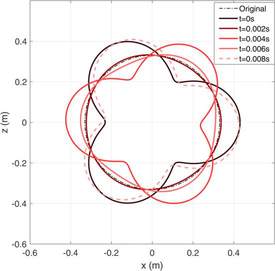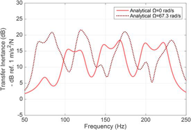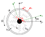 A A A An in-plane flexible ring model for the analysis of the free and forced response of a rolling tyre Ivano La Paglia 1 Politecnico di Milano Department of Mechanical Engineering, Via La Masa 1, Milan 20156, Italy Luca Rapino 2 Politecnico di Milano Department of Mechanical Engineering, Via La Masa 1, Milan 20156, Italy Francesco Ripamonti 3 Politecnico di Milano Department of Mechanical Engineering, Via La Masa 1, Milan 20156, Italy Roberto Corradi 4 Politecnico di Milano Department of Mechanical Engineering, Via La Masa 1, Milan 20156, Italy Simone Baro 5 Pirelli Tyres S.p.A. Viale Piero e Alberto Pirelli 25, Milan 20156, Italy ABSTRACT The increased demand for vibroacoustic comfort as well as regulations on noise and vibration levels made the NVH performances of a vehicle one of the fundamental design criteria. Therefore, predictive models for the analysis of noise and vibration transmission mechanisms represent interesting tools to support the R&D department of the automotive companies. Focusing the attention on passenger’s comfort, the vibrations induced by the tyre/road interaction propagate from the contact area to the hub and finally inside the cockpit through structure-borne transmission paths. This can be regarded as one of the major contributors to car cabin interior noise at low frequencies (20-500 Hz). Simplified models able to interpret the waves propagating inside the tyre structure and influenced by the angular speed may support the studies in this research field. To this end, an analytical model based on the theory of the flexible ring on elastic foundation was developed. It allows analysing the tyre dynamics in both static and rotating conditions. Model parameters were calibrated based on an Experimental Modal Analysis of the static tyre. The free response of the tyre 1 ivano.lapaglia@polimi.it 2 luca.rapino@ polimi.it 3 francesco.ripamonti@ polimi.it 4 roberto.corradi@ polimi.it 5 simone.baro@pirelli.com shows the bifurcation effect at different rotating speeds, while a cleat test simulation allows investigating the forced response of the tyre. 1. INTRODUCTION The NVH (Noise, Vibration, Harshness) performances of a vehicle are nowadays one of the fundamental design criteria due to the increased demand for vibroacoustic comfort. Both experimental and numerical investigations can be considered to address airborne and structure- borne noise [1,2]. Predictive models for the analysis of noise and vibration transmission mechanisms represent interesting tools. In this regard, structure-borne transmission path can be identified as the major contributor to the car cabin interior noise at the low frequency (up to 500 Hz). The most promising strategy to reduce its influence consists in acting directly on the source [3,4]. To this end, the R&D department of the automotive companies have been involved in the design of several predictive models [5-8], that can be grouped into Finite Element Models (FEM) and analytical ones. The former is typically adopted in case highly accurate results are required. Examples of FEM models adopted to study the free response of a rolling tyre are provided in [9,10]. However, although they provide a lower degree of complexity and consequently of accuracy, analytical model may provide useful guidelines to interpret the physics of the phenomena involved in the tyre dynamics. Moreover, being model complexity reduced, they are generally fast to execute. In this regard, different analytical models have been proposed in the literature, to analyse the case of a thin rotating ring [11-15]. These studies have been adapted to the specific field of interest, such as tyre dynamics [8,16-18]. In this paper, an analytical model of a flexible ring is proposed, aimed at reproducing the in- plane vibration of a tyre, in both static and rotating conditions (at constant speed). Differently from other previous work, the nonlinear equations of motions are derived at first to better account for the peculiarities of a tyre (such as the pretensioning of the ring due to the inflation pressure and centrifugal loads). Attention is paid to the bifurcation effect of the natural frequencies, which governs the rotating case. Model parameters have been tuned based on an Experimental Modal Analysis of a static tyre, and then adopted to simulate the tyre free and forced response. 2. THE IN-PLANE FLEXIBLE RING MODEL To investigate the dynamics of a rotating tyre, an in-plane model based on the theory of the flexible ring on an elastic foundation is proposed, showed in Figure 1. Figure 1: Model of the thin flexible ring on elastic foundation. Coordinates adopted, reference systems and model parameters. The physical system is composed of the tread, the sidewalls, and the wheel. From a modelling point of view, the first component is treated as a circular, thin flexible ring made of homogenous isotropic material. The ring is described by a mean radius a and a thickness h , and by an axial and bending stiffness ( 𝐾 and 𝐷 respectively). The wheel is introduced as an infinitely rigid and symmetric component with mass and inertia moment. The tread and the wheel are linked by the Dy @) sidewalls, modelled as a massless elastic foundation composed by radial and circumferential springs ( 𝑘 𝑟 and 𝑘 𝜃 ) distributed along the ring circumference. To account for the tyre rotation, the angular speed Ω is considered. Two reference systems are shown in Figure 1: the absolute reference frame (fixed) is reported as black lines (x*-z*), while the green one (x-z) represents a frame rotating at the same speed Ω of the tyre. The independent coordinates of the system are highlighted in red. The modelling strategy adopted leads to the introduction of and infinite number of degrees of freedom (DOFs) for the flexible ring. In addition, three DOFs are also considered, accounting for the displacements and rotation of the wheel. As a result, two Partial Differential Equations (PDE) describe t