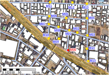 A A A Validation of calculation method of road traffic noise behind building complex in ASJ RTN-Model 2018 by field measurements Shinichi Sakamoto 1 Institute of Industrial Science, The University of Tokyo 4-6-1 Komaba, Meguro-ku, Tokyo 153-8505, Japan Wenrui Xu 2 Graduate school of Engineering, The University of Tokyo 7-3-1 Hongo, Bunkyo-ku, Tokyo 113-8654, Japan Taiki Fukuda 3 West Nippon Expressway Company Limited 1-6-20 Dojima, Kita-ku, Osaka 530-0003, Japan Miki Yonemura 4 Institute of Industrial Science, The University of Tokyo 4-6-1 Komaba, Meguro-ku, Tokyo 153-8505, Japan ABSTRACT Road traffic noise calculation method behind building complex included in the ASJ RTN-Model 2018 is an empirical model formula based on experimental results of a scale model. Therefore, the scope of the calculation method is formally limited in terms of building height, density, and distance from the road, dependent on the range of the experimental conditions. However, the roadside conditions in Japanese urban and suburban areas are diverse, and it is necessary to quantitatively investigate the validity of the calculation in such various conditions in order to widely expand the applicability of the calculation method. In this study, we examine the validity of the road traffic noise calculation method in building complex by comparing the actual measurement results in some build-up areas. 1. INTRODUCTION The authors have been studying an efficient estimation method of road traffic conditions in a view- point of noise emission from the roads[1]. In order to create accurate noise maps, continuing from the study, it is necessary to investigate an accurate estimation method of noise propagation in various build-up areas. In Japan, noise mapping for entire city is not obliged, but rates for meeting environ- mental quality standard are collected nationwide. For road traffic noise, which is the most familiar 1 sakamo@iis.u-tokyo.ac.jp 2 xu-wr7@iis.u-tokyo.ac.jp 3 tikfkd@gmail.com 4 m-yone@iis.u-tokyo.ac.jp 21-24 AUGUST SCOTTISH EVENT CAMPUS. ? O? ? GLASGOW noise source to citizens, the ASJ RTN-Model[2] has been periodically updated and has been referred in environmental noise assessment and monitoring as representative noise prediction method. The ASJ RTN-Model includes calculation method of noise in building complex, which was proposed by Fujimoto et. al [3.4]. (they have named the prediction method of insertion loss of detached houses “F2012, and its simplified version, F2012*”). The calculation methods, F2012 and F2012*, are basi- cally an empirical method based on scale model experiments, and therefore it is necessary to further investigate the applicability of the method to various siting conditions of detached houses in order to utilize the calculation method to create noise maps in Japan. In the presenting paper, the authors applied the calculation method to two areas which have different features regarding the siting condi- tions and examined the applicability of the calculation method by comparing the calculation results with measurement results of the road traffic noise in the areas. 2. CALCULATION METHOD According to the ASJ RTN-Model 2018[2], A-weighted sound pressure level at a prediction point P generated by a point source, i , (discrete sound source located on a driving lane), L A, i , is calculated as, A, A, 10 B, 8 20log i W i i L L r L (1) where, L W A, i is A-weighted sound power level of the source i , r is a distance from the source to the prediction point P, L B, i is a correction value due to the buildings along the propagation path from the point source i to the prediction point P. The ASJ RTN-Model 2018[2] gives the correction value L B, i as follows. i i L p L q B, BB, (2) p H h 0.017 8.8 1 p q H h 0.063 8.8 p where, H is the height of the buildings [m] and h p is the height of the prediction point [m]. L BB, i is the correction value [dB] when H and h p are 10 m and 1.2 m, respectively, and is given by (3) SP, 0.0904 BB, 0 1 2 10lg 10 i i d i i i L b b b where, b 0 = 0.046, b 1 = 1.01, b 2 = 0.554 and these values were determined based on scale model experiments by Fujimoto et. al.[2,3]. i , i , i and d SP, i are defined as shown in Figs. 1 (a) and 1 (b). 7.5 m 7.5 m 5 m 5 m Area P P Area + (a) Perspective angle (b) Building density Figure 1: Definition of the parameters in Eq. (3). 21-24 AUGUST SCOTTISH EVENT CAMPUS. ? O? ? GLASGOW Here, all of the parameter values of i / i , i and d SP, i which are needed to obtain the insertion loss due to the buildings can be explicitly obtained by the plane coordinates of the buildings, the sound source i and the prediction point P, and the computational load is comparably light. On the other hand, basic equation regarding sound propagation includes correction term(s) related to various attenuation factors in sound propagation as follows. A, A, 10 cor, 8 20log i W i i L L r L . (4) Δ L cor, i includes correction terms for sound diffraction Δ L dif, i , ground effect Δ L grnd, i and air ab- sorption Δ L air, i as follows. cor, dif , grnd, air, i i i i L L L L (5) In this study, correction terms by air absorption and ground effect were also taken into con- sideration other than Δ L B, i in E.(1), because the distances from source points to prediction points tended to be very large in order to create noise map regarding road traffic noise. 3. SITES UNDER INVESTIGATION Two sites which are located in and around Tokyo were chosen to validate the calculation method. In the two sites, houses and buildings are spreading along arterial roads which have heavy traffic vol- ume. 3.1 Site A Figure 2 (A) and 2 (B) show a situation of buildings and measurement points of the Site A, which is located along an arterial road in Tokyo. Along the road (Tokyo Metropolitan Road No. 318, Kannana- Dori Route 7), apartment houses, office buildings and educational facilities line up as buffer buildings with a height of three stories or more and many detached houses 