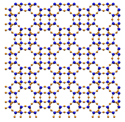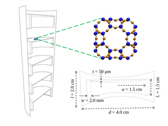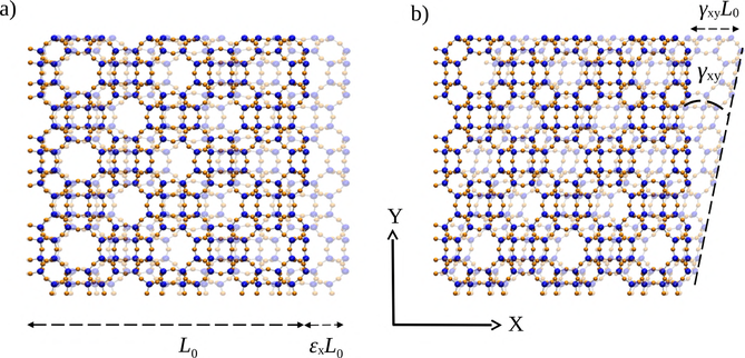 A A A Towards bridging nanoscale and macroscale acoustics of porous solids Alan Sam 1 Université Grenoble Alpes Laboratoire Interdisciplinaire de Physique (LIPhy), Grenoble, France Benoit Coasne 2 Université Grenoble Alpes Laboratoire Interdisciplinaire de Physique (LIPhy), Grenoble, France Rodolfo Venegas 3 Universidad Austral de Chile (UACh) Instituto de Acústica, Valdivia, Chile ABSTRACT This work presents results towards the bridging of nanoscale and macroscale acoustics of porous solids. We use molecular dynamics (MD) simulations to estimate the mechanical parameters as well as the acoustic properties of a nanoporous solid. These simulations consist in applying tensile and shear deformation to a prototypical nanoporous material (i.e. pure silica zeolite) and calculating the mechanical properties from the linear regime of the stress-strain curve. The specific outcomes of the simulations are phase velocities and mechanical parameters that can be used as inputs in meso / macroscopic models. To further exemplify the proposed nano-macro modelling strategy, wave propagation in a tube with an array of zeolite-made plates is studied, thereby providing a first approach to the acoustic modelling of multiscale metamaterials. 1. INTRODUCTION Over the past few decades, the advancements in nanoscience and nanotechnologies have fostered overwhelming research on nanoporous materials – especially to decipher mechanisms to adsorb and transport fluid with a plethora of novel phenomena specific to the nanometer scale [1–3]. From a practical viewpoint, such research e ff orts are motivated by the ultralow density, high surface area and high strength-to-weight ratio of these nanoporous materials which make them suitable candidates for catalytic, gas-sensing, filtration and separation applications [4–6]. E ff ective utilization of such nanoscale confinement for various applications, however, is largely influenced by their mechanical performance. Despite numerous unique properties exhibited by nanoporous materials, their low-dense structure may cause mechanical deformation that could become highly significant 1 alan.sam@univ-grenoble-alpes.fr 2 benoit.coasne@univ-grenoble-alpes.fr 3 rodolfo.venegas@uach.cl when guest molecules are adsorbed within their porosity at the solid / fluid interface. In recent years, experimental and theoretical studies have shown significant progress toward explaining the mechanics of deformation in nanoporous media [7–10]. On the other hand, despite the intrinsic link between acoustic and mechanical properties, understanding acoustic wave propagation in nanoporous materials remains to be fully explored. Considering the intrinsic molecular, i.e. nanoscopic lengthscale, inherent to physical phenomena in these nanostructures, many questions remain unanswered regarding the acoustic properties of this class of materials. In this context, a fundamental understanding of acoustic wave propagation in these nanoporous media is highly interesting with many potential applications in the field of acoustics and nanofluidics. A major challenge in conducting experiments for determining mechanical and acoustic properties of nanoporous materials is the di ffi culty in synthesizing predetermined architectures with well- controlled microstructures. Moreover, when compared to mechanical tests for bulk i.e. dense materials, conducting precise measurements with solids involving an intrinsic nanoscopic lengthscale is rather complex. In this regard, molecular dynamics (MD) simulations have proved to be a powerful and e ffi cient tool for understanding the physical mechanisms at the nanoscale. In the present study, we demonstrate how the mechanical properties of a nanoporous material with a prescribed atomic structure can be calculated by using molecular dynamics simulation. Then, we extend this study by showing how all information obtained at this vanishing lengthscale (i.e. molecular scale) can be upscaled to predict the acoustic behavior of mesoscopic architectures built from nanoporous material. As a prototypical nanoporous material, we use a pure zeolite solid which consists of a crystalline phase of silica (SiO 2 ) having a very small porosity at the nanometer scale (pore size of the order of a few Å to 1-2 nm) [4, 11]. In more detail, we used a crystalline cubic zeolite material, i.e. RHO zeolite, with a 3-dimensional tetrahedral framework in which each oxygen atom is shared by two tetrahedra consisting of silicon (Si) atoms connected to 4 oxygen atoms. RHO zeolite possesses very small apertures with pore sizes of 3-4 Å enabling them to selectively adsorb molecules and exclude the large-sized molecules based on size exclusion and shape-selective basis. Besides its suitability for many applications involving adsorption, the cubic structure of RHO zeolite considerably reduces the complexity of the present study – especially from an acoustic point of view. For a material like RHO zeolite with a cubic structure, the total number of independent elastic constants reduce from 21 to just 3. Here, by applying uniaxial tensile and shear strain, the three independent elastic sti ff nesses of RHO zeolite are predicted from molecular simulation. With the knowledge of mechanical constants obtained from MD, we calculated the longitudinal and transverse speeds of sound in di ff erent directions of acoustic wave propagation by applying Kelvin-Christo ff el’s equation. As illustrated in the last part of this paper, the outcomes of the molecular simulation study can be used as inputs for an upscaled model of wave propagation in a metamaterial, thereby exemplifying our nano-macro modelling strategy. 2. METHODS A series of full atomistic calculations of mechanical test cases are implemented via classical molecular dynamics (MD). This allows us to derive a simplified set of parameters to describe the RHO zeolite behavior from mechanical and, hence, acoustic viewpoints. In this section, we introduce the