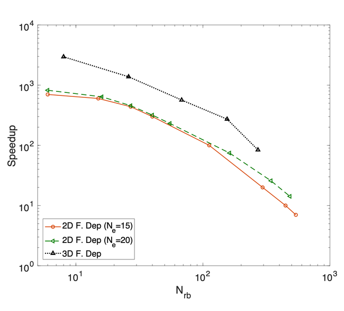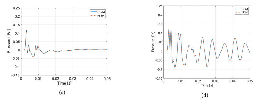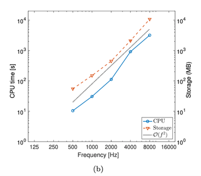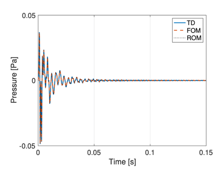 A A A Reduced basis method with parameterized boundary conditions for room acoustics Hermes Sampedro Llopis 1 Rambøll Denmark Hannemanns Allé 53, 2300 Copenhagen, Denmark Allan P. Engsig-Karup Department of Applied Mathematics and Computer Science, Technical University of Denmark Matematiktorvet, 303b/r108, 2800 Kongens Lyngby, Denmark Cheol-Ho Jeong Acoustic Technology, Department of Electrical and Photonics Engineering, Technical University of Denmark Ørsteds Plads, 352, 2800 Kongens Lyngby, Denmark Finnur Pind Treble Technologies Bjargargata 1, 102 Reykjavik, Iceland Jan S. Hesthaven Chair of Comp. Math. and Simulation Science, Ecole polytechnique federale de Lausanne Rte Cantonale, 1015 Lausanne, Switzerland ABSTRACT Room acoustic simulations can be performed by means of numerical methods, which typically solve the wave equation in an enclosure through discretization techniques. These methods provide high- fidelity solvers that include all the wave phenomena but are computationally costly. This paper in- vestigates the potential of a reduced basis method for simulating room acoustics when the boundary properties are changed iteratively, e.g., for the investigation of effects of design changes in rooms where different boundary properties are simulated. Such studies increase the computational cost when using traditional high-fidelity solvers. The presented framework allows reducing the computational burden by applying reduced basis methods and solving the problem in a low-dimensional subspace where the absorption properties of complex boundary conditions are parameterized, e.g., the thick- ness of a porous material. The potential of the proposed framework is analyzed in terms of computa- tional efficiency, accuracy and storage requirements. A computational speedup of two orders of mag- nitude is demonstated for a 2D case with an upper frequency of 2 kHz, and impressive three orders of magnitude for a 3D case with an upper frequency of 1 kHz showing a potential of having an in- crease in terms of speedup when increasing the size of the domain. The storage requirement for a 2D case with an upper frequency of 8 kHz is 10.8GB while for a 3D case with an upper frequency of 1 kHz is 8 GB. 1 hsllo@elektro.dtu.dk 21-24 AUGUST SCOTTISH EVENT CAMPUS ? O? ? GLASGOW 1. INTRODUCTION Historically, room acoustic simulations have been carried out by means of geometrical acoustics (GA) methods [1] , which approximate the propagation of the sound to achieve manageable computational cost but fails to simulate the right wave nature of sound causing certain level of degradation in the accuracy of the simulations. Solving the governing equations using numerical discretization methods is a different approach that includes all the wave phenomena such as diffraction and interference in low frequencies. The finite element method (FEM) [2], spectral element method (SEM) [3] and the finite difference method (FDTD) [4] are some examples numerical methods, which in principle are more accurate than GA. However, the main drawback is the high computational cost, specially for large domains at high frequencies, where the system of equations becomes large and computationally expensive to solve due to the mesh resolution needed. This makes difficult to apply numerical meth- ods in building design or engineering applications, where a room is typically simulated multiple times and different surface materials are tested to identify desired acoustic conditions. We propose a computational framework to reduce the computational burden in such scenarios using a reduced basis method (RBM) [5]. This method allows to solve efficiently parametrized problems where a large number of model-based simulations are solved for different parameter values. The RBM has shown successful results in different fields, e.g., electromagnetics [6], computational fluid dynamics [7], heat transfer [8] and wave equation [9]. It consists of two stages. First, in an offline stage, the parameter space is explored by solving using a high-fidelity model that is referred to as the full order model (FOM). Then, a problem-dependent basis is generated using the proper orthogonal decomposition (POD) method. A Galerkin projection is used to reduce the dimensionality of the orig- inal problem using and truncating the generated basis. Second, in an online stage, the reduced problem is solved for a new parameter value at a much lower computational cost. A critical challenge in the RBM is to keep the stability in the time domain and different remedies have been proposed [10-12]. For the present study a SEM in the Laplace domain is chosen to fulfill the following requirements: a) geometric flexibility, b) high-order accuracy, c) transient response reconstruction, d) stable reduced order model (ROM) and e) applicability to large spaces and high frequencies. The contribution of this study is 1) derivation of a RBM framework in the Laplace domain for room acoustics with parameterized boundary conditions in 2D and 3D and 2) an analysis of the potential and drawbacks of the framework. 2. METHODS 2.1. Full order Model The acoustic wave propagation in a lossless steady medium is described by the second order wave equation, which can be written in the Laplace transform evaluated at a fixed complex frequency 𝑠= 𝜎+ 𝑖𝛾 , by multiplying the wave equation by 𝑒 !"# and integrating in time over the interval [0, ∞) 𝑠 $ 𝑝−𝑐 $ Δ𝑝 = 𝑠𝑝 % + 𝑝 #,% , , (1) where 𝑝(𝒙, 𝑠) is the sound pressure, 𝒙∈Ω is the position in the domain Ω , 𝑡 is the time in seconds, 𝑐= 343 m/s is the speed of the sound and 𝑝 % (𝒙, 𝑡), 𝑝 #,% (𝒙, 𝑡) corresponds to the initial condition and 21-24 AUGUST SCOTTISH EVENT CAMPUS ? O? ? GLASGOW the derivative at 𝑡= 0 𝑠 . For the present study, a Gaussian pulse is considered for the sound pressure initial condition. Using the SEM formulation [13, 14] to discretize (1) becomes 9𝑠 $ 𝑴