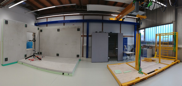 A A A Experiences with source characterization methods within and beyond the scope of EN 15657 Fabian Schöpfer 1 , Tobias Kruse, Johanna Weinzierl, Andreas Mayr, Ulrich Schanda Rosenheim Technical University of Applied Sciences Hochschulstr. 1, 83024 Rosenheim, Germany ABSTRACT Prediction of machinery noise in buildings requires knowledge about the airborne sound radiation and the structure-borne sound excitation from the source of interest. Laboratory methods to determine the airborne sound power of sources are well established since many years. However, standard methods for the characterization of structure-borne sound from building service equipment were first described in EN 15657-1:2009 which was then superseded by EN 15657:2017. In recent years the test methods described in this standard were applied in several research and development projects in the laboratory for sound measurement (LaSM) at Rosenheim Technical University of Applied Sciences. For this purpose the experimental equipment and the facilities of the laboratory were expanded which involves a variable reception plate test rig that was built in 2017. This paper describes the experience with test methods within and beyond the scope of the EN 15657:2017 using the available laboratory resources. 1. INTRODUCTION For the prediction of machinery noise according the installed power in the building is required. This requires the knowledge of the equivalent blocked force or the free velocity of the source and the equivalent source mobility. EN 15657 describes laboratory methods to determine these quantities. One possibility is an indirect measurement using the so-called reception plate method. The source is therefore connected to an isolated plate and driven in the desired stage. This plate is considered as an SEA subsystem that allows to set up the power equilibrium as follows W in = W d = E ωη = m 〈 ˜ v 2 〉 s ωη (1) Where W in is the unknown input power of the source, and W d the plate power that can be determined from the vibrational energy (i.e. the mass m and the spatial average root-mean-square velocity 〈 ˜ v 2 〉 s ) and the total loss factor η for the frequencies ω . In this paper the limitations of the reception plate test rig according to EN 15657 are discussed based on project experience with building service equipment at the LaSM from recent years. A new variable test-rig that can be adapted to the requirements of di ff erent sources is presented. On this test-rig a 3D scanning Laser Doppler Vibrometer (LDV) was used to measure the response at 1 fabian.schoepfer@th-rosenheim.de a slaty. inter.noise 21-24 AUGUST SCOTTISH EVENT CAMPUS O ¥, ? GLASGOW a huge number of positions across the plate for a known power input. This data is used to assess practical sampling strategies with drastically reduced set of measurement points. In addition the determination of the total loss factor is discussed and the application of the power injection method (PIM) to determine the loss factor is presented and comapred to the results with the decay method. 2. TEST-RIG In 2015 a reception plate test-rig based on the suggestions in the Annex of EN 15657:2009 was built in the facilities of the LaSM. However research and development projects mainly with manufacturers from the buildings service equipment sector showed, that this test rig has limiation for a couple of sources (Figure 1). For example there is the problem with roller shutters that are mounted on top of a window frame before it is installed. This source comprises the roller-shutter including the motor, the housing, the shield and the rails but also the window frame which is finally the element that is screwed into the building structure. Without a window opening in the reception plate such sources can not be characterised. An then there is also the question whether this source predominately excites bending waves [1]. Another example is a sanitary pre-wall installation as described in [2] for example. These installations cover a wide area of the surface of the reception plate which is problematic in terms of the positioning of accelerometers across the plate. However the use of three isolated plates gives the possibility to determine the power input into each coupled wall or floor separately. Other sources that can not be fully characterised with the described test rig are waste water pipes. Although the pipe clamps can be fixed to the reception plate and the power as well as the blocked force can be determined, it is not possible to characterize the pipe feed-through in floors with the typical mock-up. And because the horizontal plate is typically placed on the laboratory floor it is not possible to characterise the power input of horizontal pipe sections underneath a floor with fixing to the concrete ceiling. Figure 1: Limitations of a typical reception plate test-rig. So the main aspects to improve were: (a) a plate with an opening for windows or similar, (b) a bigger plate that allows enough space even for big service equipment (n.b. that a bigger plate also improves the modal density at low frequencies), (c) plates with opening for a pipe feed-through and Figure 2: Left: Variable reception plate test rig with crane and rack to store plates for di ff erent purposes. Right: Current mock-up with four plates and a lifted floor plate to characterise sanitary system including pipe feed-through and clamps fixings underneath the floor. (d) a horizontal plate that is lifted from the ground to attach source such as horizontal pipe sections from underneath. And there may be other requirements for other sources that were not considered yet. Hence it is required to develop a variable reception plate test rig to adjust the rig to the requirements of the source. In 2016 the founding of a new technology centre at the Rosenheim Technical University of Applied Sciences gave the possibility to realise these aspects in a new variable reception plate test rig. The so called roteg 