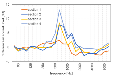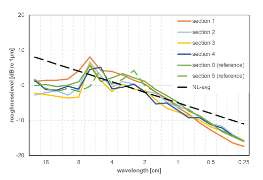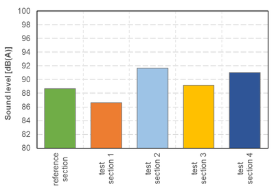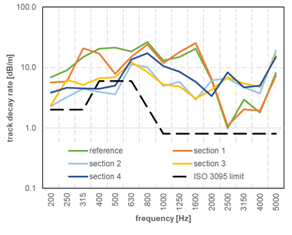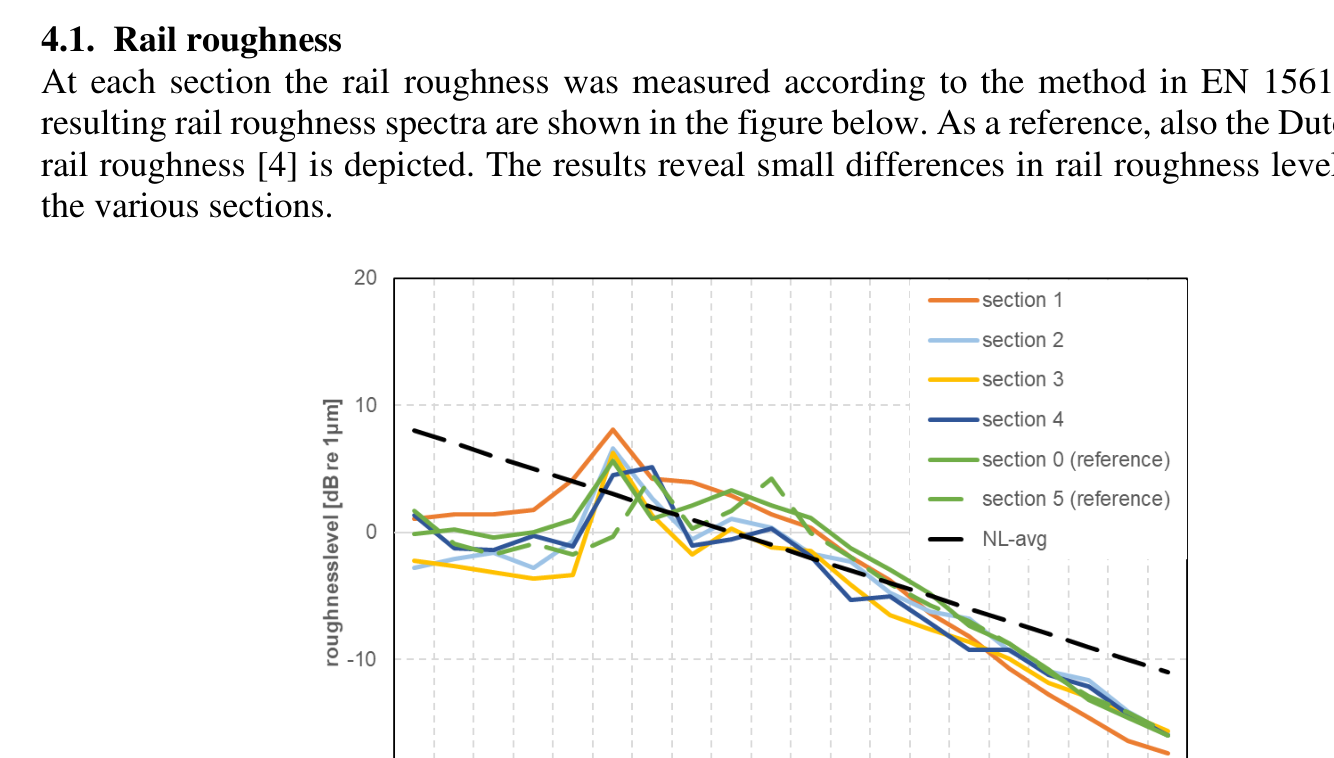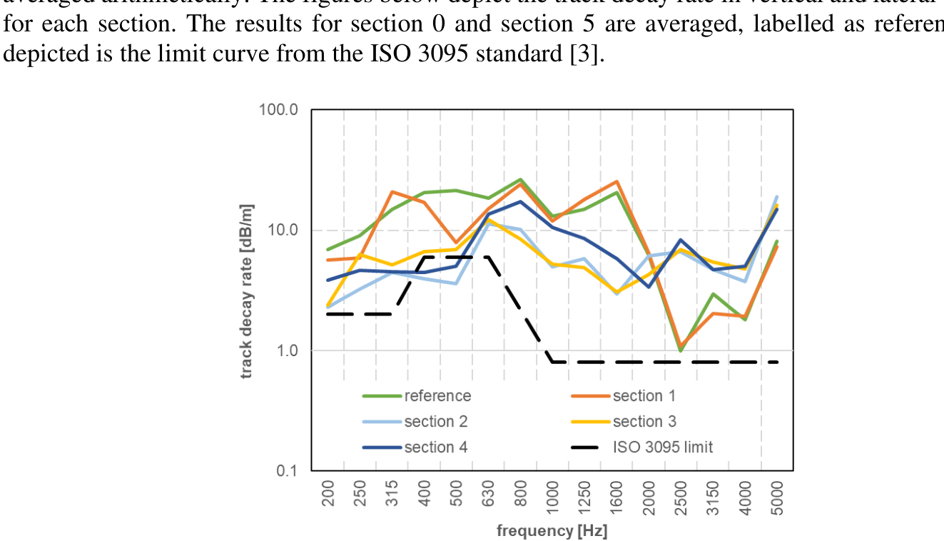 A A A Acoustical properties of alternative sleepers: experimental testing Wout Schwanen 1 M+P consulting engineers Vught, The Netherlands Nils Yntema 2 ProRail Utrecht, The Netherlands ABSTRACT ProRail, the Dutch infrastructure manager , started a project to test alternative, sustainable, sleepers. A test setup was achieved along the line from Zwolle to Heino in the Netherlands, where six test sections were constructed. Two reference sections with standard concrete sleepers and four sections with alternative sleepers. For one day we performed simultaneous sound pass-by measurements at the six test sections. In addition, we measured the rail roughness and the track decay rate of each test section. The results clearly show that an alternative sleeper influences the track decay rate of the track. This difference in track decay rate leads to different pass-by sound levels. This paper shows the results of the experiments. 1. INTRODUCTION ProRail, the Dutch infrastructure manager, started a project to test, alternative, sustainable sleepers. Therefore, a test set up was achieved with six test sections next to each other. The goal of the research is to gain insight in the performance of the alternative sleepers in comparison with the standard concrete sleepers with respect to CO 2 -emission, vibrations and sound emission. The goal of the current research is to determine the effect of the sleeper on the rolling noise. Therefore, pass-by measurements are performed simultaneously at all test sections. In addition, we measured the rail roughness and the track decay rate at each test section. 3. TEST LOCATION The test location is situated in the northeastern part of the Netherlands. The location has a single track, with trains running in both directions. The location consists of six test sections: two reference sections and four sections with the alternative sleepers. The reference sections consist of the standard concrete sleepers. The four other sections consist of alternative sleepers with different materials and/or different geometry. Each test section has a length of 100 meters. Pictures of the alternative sleepers are shown in figure 1. 1 WoutSchwanen@mp.nl 2 Nils.Yntema@prorail.nl Figure 1: The alternative sleepers under testing 4 TRACK PROPERTIES 4.1. Rail roughness At each section the rail roughness was measured according to the method in EN 15610 [1]. The resulting rail roughness spectra are shown in the figure below. As a reference, also the Dutch average rail roughness [4] is depicted. The results reveal small differences in rail roughness levels between the various sections. Figure 2: Rail roughness levels of the six sections. As a reference also the Dutch average rail roughness (‘NL-avg’) is depicted 20 roughnesslovel [4B re tym] section 1 —section 2 —seation 3 section 4 —section 0 (reference) — section 5 (reference) — Ntaw 16 8 4 2 wavelength fom] 1 0s 0.28 The results of the sound measurements will be corrected for the difference in roughness levels between the section according to the procedure in the Dutch calculation scheme. There is a direct spectral relationship between the combined wheel and rail roughness on one hand and the change in noise emission on the other hand. 𝛥𝐿 𝑝,𝑖 = (𝐿 𝑟,track,𝑖 ⊕𝐿 𝑟,vehicle,𝑖 ) −(𝐿 𝑟,track,average,𝑖 ⊕𝐿 𝑟,vehicle,𝑖 ) , (1) with ΔL p as the noise emission change between test track and average track, L r ,vehicle as the wheel roughness level, L r ,track as the rail roughness level, ⊕ denoting energetic summation, and i denoting a certain frequency band. Since roughness is usually known as a function of wavelength λ and noise level difference is expressed as a function of frequency f , a spectral transformation f i = v/ λ is made, which depends on vehicle speed v . In this case the L r ,track,average is the Dutch average roughness. The assumed wheel roughness is taken from the national noise impact calculation method. 4.2. Track decay rate For each test section we determined the track decay rate in vertical and transversal direction according to EN 15461+A1:2011 [2]. The track decay rate was measured on both rails and the results were averaged arithmetically. The figures below depict the track decay rate in vertical and lateral direction for each section. The results for section 0 and section 5 are averaged, labelled as reference. Also depicted is the limit curve from the ISO 3095 standard [3]. Figure 3: Track decay rate in vertical direction for the alternative sleepers track decay rate [dB/m] 100.0 10.0 aaen aus eens tn ae ee a Soest 1 2288888888882 88 frequency [Hz] Figure 4: Track decay rate in lateral direction for the alternative sleepers In general, we can conclude that all sections are well damped as the track decay rate is above the ISO limit values for almost all sections. Only sections 2 and 4 have a track decay rate below the limit value in vertical direction for 400 and 500 Hz. However, the results also show clear differences in track decay rates for the various sleeper types in both directions. The track decay rate for section 1 is almost equal to the track decay rate of the reference. For sections 2 to 4 the track decay rate in vertical direction is lower than the track decay rate of the reference except for the higher frequencies. On the other hand, in lateral direction, we observe that the track decay rate of section 2 to 4 is higher than the track decay rate of the reference for the whole frequency range. 5. SOUND MEASUREMENTS 5.1. Test setup We performed pass-by measurements to determine the noise reduction of the alternative sleepers. Microphones were placed at 5m from the center of the track at a height of 1.2m. During each pass- by we recorded the A-weighted sound level in third octave bands, the vehicle speed, the vehicle type and the number of cars. A total of eleven pass-bys of passenger trains were recorded. The trains drove in both directions with measur