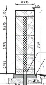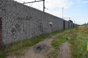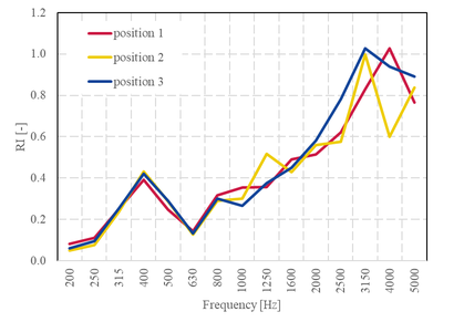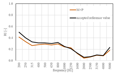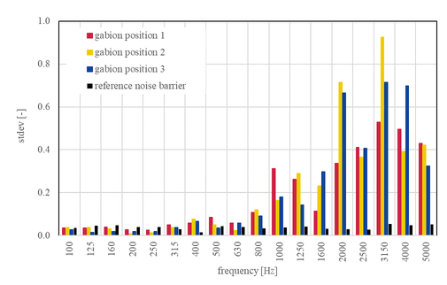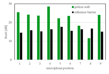 A A A Application of sound absorption measurements according to EN 1793-5 on gabion walls Wout Schwanen 1 M+P consulting engineers Vught, the Netherlands WillemJan van Vliet 2 Rijkswaterstaat Grote Projecten en Onderhoud Utrecht, the Netherlands ABSTRACT The standard EN 1793-5 describes a method to determine the sound reflection index of road traffic noise reducing devices under direct sound field conditions in-situ. The method is commonly used to assess the intrinsic characteristics of conventional, absorptive noise barriers and yields results with a limited measurement uncertainty. Recently, the sound reflection index of a gabion wall was determined by means of the in-situ measurement method leading to unexpected results. An in-depth analysis was made of the results of the in-situ measurements on a conventional noise barrier and on a gabion wall. The main conclusion of this comparison is that application of the in-situ method on a gabion wall has a much higher measurement uncertainty than to be expected. 1. INTRODUCTION The European standard EN 1793-5 describes a measurement method to determine the sound reflection of noise barriers in-situ. An array of nine microphones is used to measure incoming and reflected sound waves emitted by an external sound source. The amount of energy that is reflected from the barrier is a measure of the absorptive properties of a noise barrier. A filtering technique based on the expected path lengths of parasitic reflections (like ground reflections and reflections from other objects) in the impulse response domain is used to isolate the reflections from the barrier under test. For simple barrier geometries, the expected path lengths can be calculated easily. When measuring more complex geometries, like Gabion walls, these calculations become more complex. Gabion walls are typically composed of a solid concrete core, surrounded by a metal grid filled with stones of different sizes. In this case, the effective distance of the microphone array to the barrier can be largely frequency dependent. Low frequencies sound waves are expected to not be very much impacted by the stones, while higher frequencies waves are expected to scatter due to the stones. 2. CURRENT RESEARCH M+P has been using the EN 1793-5 method for over five years now to measure the absorptive properties of noise barriers [2], [3]. We have participated in the inter laboratory test in 2018, organized 1 WoutSchwanen@mp.nl 2 WillemJan.Van.Vliet@rws.nl; by the Austrian Institute of Technology (AIT). The current research compares the results of the various analysis steps of a simple absorptive barrier with a gabion wall and illustrate the difficulties that may arise when analyzing the results of measurements on a gabion wall. 3. DESCRIPTION OF THE NOISE BARRIERS 3.1. Gabion wall The gabion wall under testing is located along the railway track in the southwest of the Netherlands. It has a height of 3.5 meters and a thickness of approximately 1 meter. Inside the noise barrier a solid core of 20 cm thickness is present to improve the insulation of the gabion wall. The gabion is filled with rubble. Figure 1 shows several pictures of the gabion wall. Figure 1: Gabion wall under testing 2.2. Reference noise barrier The reference barrier was tested in an inter-laboratory test (ILT) on sound reflection and airborne sound insulation properties of noise barriers. It consists of 8x0.5 m high stacked aluminum cassettes with perforated metal plates at the front and inner absorber. A picture of the noise barrier is given in figure 2. The measured reflection index is given in figure 3. For comparison this graph also depicts the accepted reference value of the interlaboratory testing. We see a good agreement between both results. Figure 2: Reference noise barrier, that was tested in the ILT [4] Figure 3:Reflection index for the reference noise barrier [4] 4. SOUND REFLECTION INDEX MEASUREMENTS 4.1. General principle The EN 1793-5 standard describes the method how to determine the sound reflection index in-situ. A simplified version of the process is schematically represented in the figure below. ee os accepted reference value frequensy (12) Figure 4: Schematic representation of the method for in-situ determination of the reflection index according to EN 1793-5 A sound source emits a transient sound wave that travels past the measurement grid (microphone) position to the device under test and is then reflected. Each microphone that is placed between the sound source and the device under test receives both the direct sound pressure wave travelling from the sound source to the device under test and the sound pressure wave reflected (including scattering) by the device under test. The direct sound pressure wave can be better acquired with a separate free field measurement (reference measurement). The power spectra of the direct and the reflected components provides the basis for calculating the sound reflection index. 4.2. Calculation of impulse response The sound source emits an exponential sine sweep (e-sweep), which is later converted into an impulse response. Paragraph 5.4.2 of EN 1793-5 states that the sound source should have a smooth magnitude of the frequency response without sharp irregularities throughout the measurement frequency range, resulting in an impulse response under free-field conditions with a length not greater than 3 ms. Therefore, we calculated the amount of energy within 3 ms in comparison to the total amount of energy for microphone 5. For both the reference noise barrier and the gabion wall 99.9% of the total energy is within 3 ms. Figure 5: Impulse response under free-field conditions. Left: Reference noise barrier. Right: Gabion wall measure e-sweep convert to IR determine window reference measure e-sweep convert to IR shift IR barrier to reference subtracted = IRparier ~ !Rreterence determine window subtracted apply windowing calculate RI: 4.3. Window placement and subtraction technique S