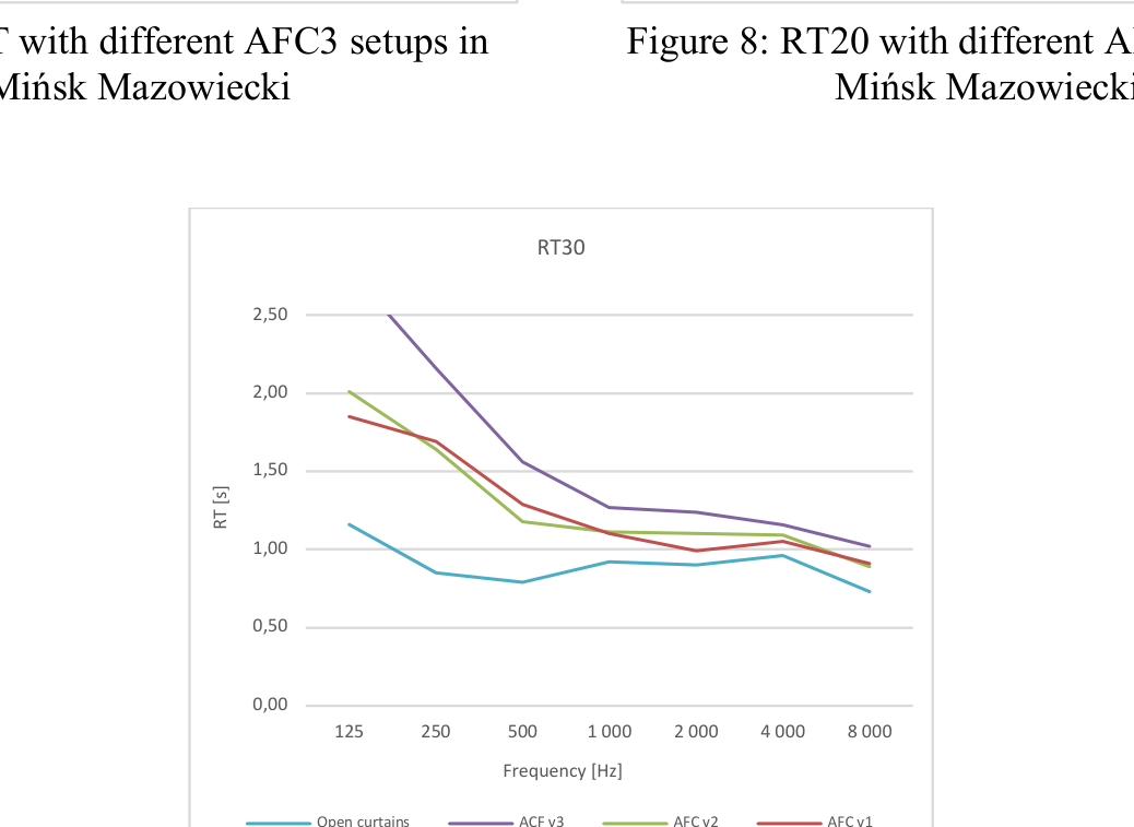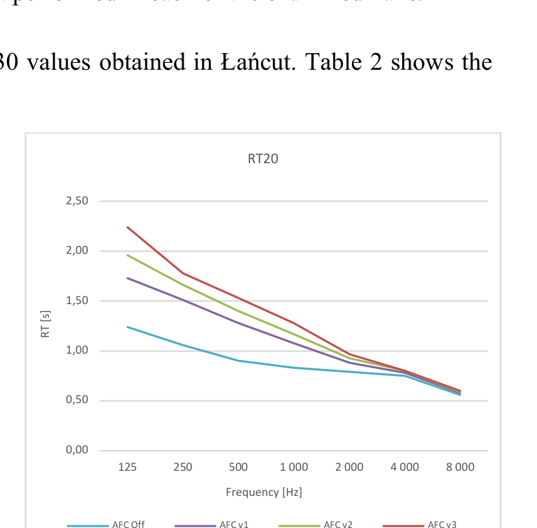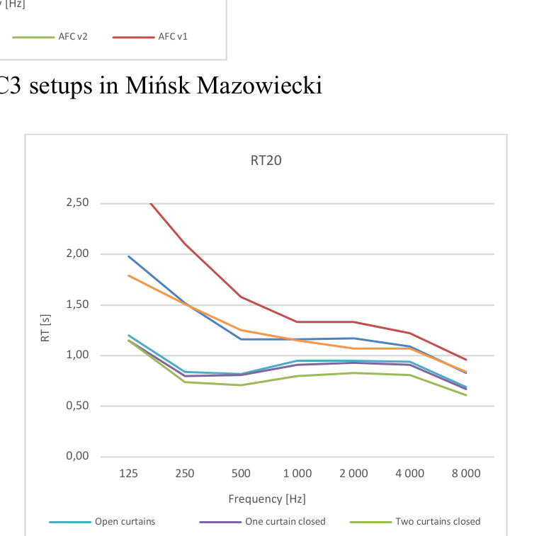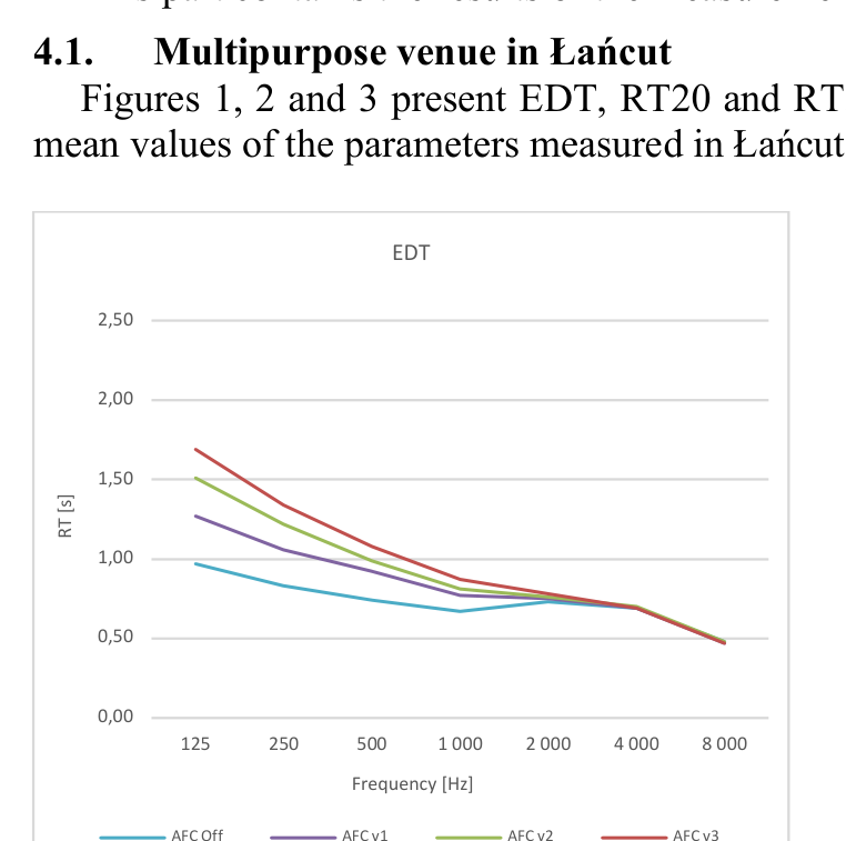 A A A Objective evaluation of multipurpose enclosures equipped with active acoustic enhancement systems - examples of halls based in Poland. Łukasz Błasiński 1 1 Department of Acoustics, Faculty of Physics, Adam Mickiewicz University, Uniwersytetu Poznańskiego 2, 61-614 Poznań, Poland ABSTRACT From the acoustical point of view various events requires different acoustic conditions. Research on optimal acoustic parameter values that have been carried out for recent decades and the necessity to provide different acoustic solutions to events of a different type led to construction of rooms with variable acoustic conditions. In such rooms changes in parameters in multipurpose enclosures may be achieved by modifications of volume or a shape of a room as well as through the use of appropriate acoustic treatments. However, those modifications are limited and frequently insufficient due to the technical limitations. Therefore, active acoustic enhancement systems (AAES) based on signal processing and multisource redistribution of a modified signal in a room become more and more popular. Application of such systems allows adjustments of acoustic parameters required for particular performance. This paper presents results from measurements of objective parameters of multipurpose enclosures equipped with AAES. Investigated halls are located in Poland and were intentionally built or renovated as multipurpose rooms. All of those were equipped with Yamaha Active Field Control version 3 system. The measurements were performed according to ISO338-1/2 standards. In total 13 active acoustic system settings were analyzed to investigate their influence on room acoustics parameters. Keywords: room acoustics, concert hall, multipurpose hall, active acoustics system, reverberation 1. INTRODUCTION From the acoustical point of view, various events require different acoustic conditions. Research on optimal acoustic parameter values have been carried out in recent decades. Optimal values of different room acoustics parameter can be found in many scientific publications [1-6]. The necessity to provide different acoustic solutions for events of a different type (e.g., symphonic concerts or speech), led to construction of rooms with variable acoustic conditions. In such rooms, changes in parameters in multipurpose enclosures may be achieved by modifications of the volume or shape of a room as well as through the use of the appropriate acoustic treatments. [7, 8]. However, one must bear in mind that those modifications are limited and frequently insufficient due to the technical constraints [9]. They also make the building costs much higher which is generally not accepted by the investors. Therefore, nowadays, active acoustic enhancement systems (AAESs) based on the signal processing and multisource redistribution of a modified signal in a room become more and more popular. Application of such systems allows for the adjustments of acoustic parameters required for particular performance [10]. The earliest application of the AAES containing microphone-speaker loops which were merely to generate additional resonances and reflections were established in the 1960s [11, 12]. Enhancement of the acoustic behavior of the room can be achieved in two different ways: either by adding reflection based on the room’s natural reflection (regenerative approach) or by synthesizing reflection based on the direct sound (in-line approach). Regenerative systems use omnidirectional microphones placed over the critical distance from the sound source, regenerating natural reflections within the loops containing microphone, delay line, amplifier and speaker. In-line systems use cardioid microphones 1 lukasz.blasinski@amu.edu.pl placed relatively close to the sound source and artificial reverberation engines in each system’s loop, adding artificial reverberation to original sound captured by the microphones [13, 14]. Over the years, several systems have been proposed by different manufacturers. Most recent AAES are hybrid regenerative systems with both - regenerative and in-line sections which provide a stable, natural sounding diffuse reverberation field [15]. This paper is arranged as follows. Section 1 describes the aim of the research; section 2 - rooms’ acoustic parameters as well as measurement procedure. Section 3 contains the results obtained in the performed measurements. In section 4 obtained results are discussed. Section 5 presents conclusions. 2. AIM OF RESEARCH The main goal of the study was to investigate how the use of the active acoustic system affects the standard objective room acoustic parameters values. As a consequence, it would answer the question whether the use of the system can provide optimal acoustic conditions in terms of the type of performance. Four multipurpose enclosures based in: Łańcut, Wieluń, Mińsk Mazowiecki and Puławy were measured. All halls are equipped with the Acoustic Field Control version 3 system produced by Yamaha. 3. METHODOLOGY OF RESEARCH 3.1. Objective room acoustics parameters There are many different parameters that can be measured in a room. However, in this paper we focused on ISO standards [16, 17], thus the most common room acoustic objective parameters were chosen to analyze their values in the investigated halls as Reverberation Time (RT), Early Decay Time (EDT), Clarity (C80, C50), Definition (D50), Initial Time Delay Gap (ITDG), Center Time (Ts), Interaural Cross Correlation (IACC) and Speech Transmission Index (STI) [4, 18, 19-22]. 3.2. Measurement procedure According to the standard mentioned above, an omnidirectional Neotek Dodecahedron DO12-PLUS sound source with dedicated amplifier and iSEMCom EMX7150 omnidirectional microphones were used. Both the measurements and their analysis were performed using the EASERA (AFMG Technologies GmbH) software with Roland Octa Capture UA1010 interface. IACC parameter value was measured with a Neumann KU100 dummy head. In each room m