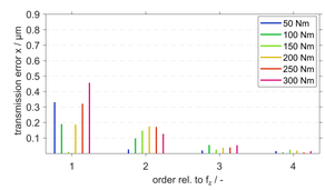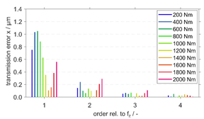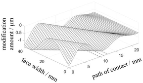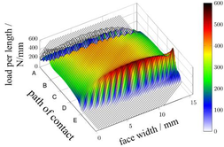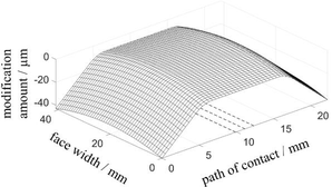 A A A Periodic flank modifications for optimal excitation behavior of practi- cal gear geometries Sebastian Sepp 1 Gear Research Center (FZG), Technical University of Munich Boltzmannstr. 15, 85748 Garching, Germany Michael Otto 2 Gear Research Center (FZG), Technical University of Munich Boltzmannstr. 15, 85748 Garching, Germany Karsten Stahl 3 Gear Research Center (FZG), Technical University of Munich Boltzmannstr. 15, 85748 Garching, Germany ABSTRACT The design of modern transmissions faces new challenges regarding the main design principles effi- ciency, service life and noise emissions. These challenges are further intensified by the progressing electrification of vehicle drive systems and the associated trend towards higher rotational speeds. In order to achieve the design objectives at the level of flank modifications, the micro geometry has to meet partially competing requirements. Most present gears are designed with combinations of stand- ard modifications to obtain the best possible compromise between the competing goals. The applica- tion of periodic modifications provides a possibility to avoid particularly the trade-off between the two design principles load carrying capacity and excitation. The periodic modifications directly com- pensate the alternating part of the elastic deformations in the mesh without changing the load distri- bution. They can be used to optimize the excitation behavior independently of the load carrying ca- pacity. Theoretical studies show the potential of periodic modifications to optimize the excitation behavior for a special target load or even for broad load ranges. Experimental investigations at two test rigs of the Gear Research Center (FZG) verify the effectiveness of these flank forms to optimize the excitation behavior for different practical gear main geometries. 1. INTRODUCTION The design of flank modifications of practical gears for modern gear applications is characterized by the trade-off between the objectives load carrying capacity, noise behavior and manufacturing. To ensure a high load carrying capacity, a balanced load distribution in the meshing area without load peaks is desired. For this purpose relieves and crownings are applied to the ideal involute flank form to relieve the meshing start and end as well as the face edges of the gears. The design load for these modifications is usually the nominal load or a specific load spectrum. In contrast, low noise flank 1 sebastian.sepp@tum.de 2 michael.k.otto@tum.de 3 karsten.stahl@tum.de worm 2022 designs aim at a constant deflection of the tooth meshing in all variable meshing positions at target load. With a constant deflection, the parameter-excited oscillations in the mesh caused by the loaded gears themselves are minimized and a beneficial noise behavior for the target load is achieved. The realization of constant deflections typically implies micro geometries, which are not in line with ge- ometries for ensuring a high load carrying capacity. Thus, the exclusive use of standard modifications such as tip and root relieves, crownings and end relieves requires compromises between the two target objectives load carrying capacity and noise behavior. In the literature there are numerous publications on the design of “optimized” flank modifications in order to find the best compromise in the trade-off between the two design goals [1–3]. However, the investigations are not extended to free topological modifications, which provide a method to over- come the trade-off. The fundamental idea is the direct compensation of the loaded transmission error (LTE) by a parallel shifting of all lines of action being active at the same time. Since the LTE develops with a pitch-periodic vibration pattern, the derived topological modification to compensate the LTE is a periodic waveform modification. Griggel and Radev [4] developed this idea and used sine shaped modifications derived from the spectrally analyzed LTE. The periodic modifications do not have an impact on the load distribution because the contact lines are shifted only in parallel direction and thus, there is no load redistribution between and along the contact lines. This allows a separate design of the modifications with regard to the target variables load carrying capacity and noise behavior. How- ever, the investigations revealed that the very small modification amounts down to the sub-microm- eter range represent a major challenge and prevent process-safe manufacturing and practical applica- tion. Based on the pure waveform modifications Kohn [5] derived modified periodic modifications, which are only applied to a partial area of the tooth flanks and thus show locally increased modifica- tion amounts. The effectiveness of the modified modifications for minimizing the excitation of the test gears (ε = 1.5 and ε = 1.5) could be confirmed computationally and experimentally. In a project funded by the FVA/AiF [6], the application of periodic modifications to different practical gear main geometries was investigated at the Gear Research Center (FZG). 2. THEORETICAL FUNDAMENTALS To design tooth flank modifications, the principal deformation and excitation behavior of the gear pair in contact is modeled in the tooth contact analysis. The vibration excitation in the gear mesh can be explained by the following main excitation mechanisms: Variation of the mesh stiffness due to the time-varying meshing positions in the tooth contact Elastic deformations and displacements of the gears due to load-induced deformations of the shaft-bearing-housing system Geometric deviations from the ideal involute shape due to intentionally applied gear modifi- cations, manufacturing tolerances or assembly inaccuracies Extended tooth contact due to deformations of loaded teeth The governing excitation mechanism for the noise excitation of a gear pair is the time-varying mesh stiffness. Figure 1 shows an example of the mesh stiffness for spur and helical gea