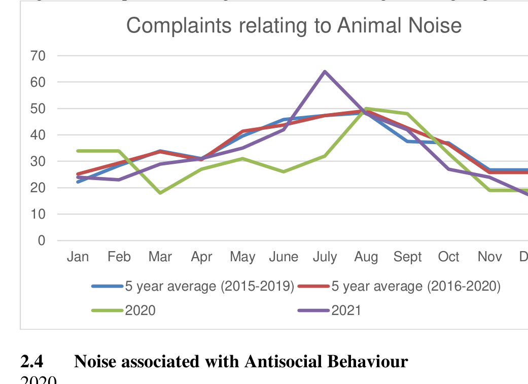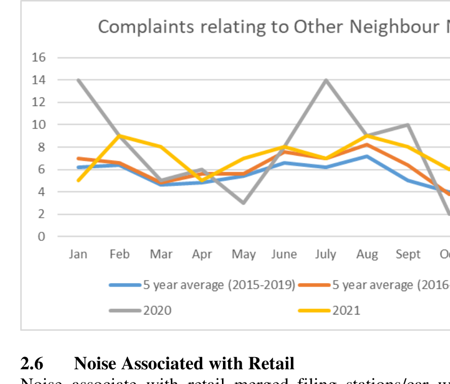 A A A The impact of covid-19 restrictions on complaints of noise made to a local authority in Northern Ireland - a case study. Lindsay Shaw 1 Ulster University Belfast School of Architecture and the Built Environment York St, Belfast BT15 1ED Paul McCullough 2 Ulster University Belfast School of Architecture and the Built Environment York St, Belfast BT15 1ED ABSTRACT The covid pandemic with national lockdowns and restrictions profoundly affected people’s lives in many ways including the experience of neighbourhood noise. Initial research indicated a rise in noise complaints at the start of restrictions (Tong, 2021) supported by CIEH, 2022 finding a 54% increase in noise complaints in 2020/21. Analysis of complaints received in 2020 and 2021 at one local authority in Northern Ireland indicates a different experience. Total number of complaints did not see statistically significant increases when compared to 5-year averages. While there were increases in some categories, comparison with 5-year averages were not statistically significant. The only category of noise with a statistically significant increase in 2020 related to retail, returning to a more typical pattern in 2021. It may be explained by increased demand in essential food retail as well as social distancing requirements, limitations to customers inside, etc., as the sector adapted in 2020 followed by people becoming used to changes and a return to some behaviours more akin to those pre-covid. A wider study involving local authorities across Northern Ireland, the UK and countries that experienced lockdown measures may reveal a more accurate picture of the impact of neighbourhood noise experienced during the covid pandemic. 1. INTRODUCTION 1.1. Impact of Noise on Health and Wellbeing Noise is commonly defined as unwanted, unpleasant, or disturbing sound. Noise is perceptive and sound that one person thinks is desirable or acceptable may well be perceived as unwanted and disturbing to another. 1 l.shaw@ulster.ac.uk 1 paul.mccullough@armaghbanbridgecraigavon.gov.uk None the less, noise is recognised by the WHO as an important public health issue and the negative health impacts on health and wellbeing a growing concern (WHO, 2018). The WHO Large Analysis and Review of European housing and health Status (LARES) (WHO 2004) included a large scale evidenced based and peer reviewed analysis on the health effects of noise exposure. It concluded that annoyance from neighbourhood noise had identified health impacts that were independent of social economic status and housing conditions. Excessive noise is known to harm human health (short term and long term) and interfere with people’s daily activities at home, work, school etc. It is widely accepted to cause disturbance to sleep having a range of health impacts as well as affecting performance. Noise is also known to cause cardiovascular and psychophysical effects, reduce performance and provoke annoyance responses and changes in social behaviour (WHO, 2021), Highlighted as the second worse environmental cause of ill-health, behind only ultrafine particulate matter (PM2.5) (European Environment Agency, 2014), noise has attracted policy development aimed at reducing the exposure of populations to environmental noise and improving health. However, these have focused on sources such as road, rail, aircraft and more recently in the WHO Environmental Noise Guidelines for the European Region, 2018, Wind Turbines and Leisure Noise. Policy is focused on these issues with an aim in driving down noise levels over time and to prevent further increases. However, neighbourhood noise is more difficult to identify for assessment and study. It does not happen at a particular place and at a particular time. There are many variables and often a result of people’s activities and attitudes. Noise that causes the most annoyance include those perceived as not normal, avoidable, happen at night and are loud with the impact on the complainant linked more to the lack of control that the person has on the situation as well as the motives attributed to the noise maker (Levy-Leboyer and Naturel, 1991). 1.2. Noise Complaint Incidence Neighbourhood noise, while not as widely studied is frequently present and a major cause for complaint to local authorities that are responsible for the investigation and enforcement. The CIEH Noise Survey 2019/20 Report on findings- England (2021) found that there were 131,645 noise complaints recorded from the 117 local authorities that submitted responses equating to 6.7 complaints per 1000 people. In NI, the Department of Agriculture, Environment and Rural Affairs (DAERA) have a strategic role in all environmental matters including air quality and noise. They have been collating data from local authorities in NI since 2003/04 and have a robust data set with all local authorities participating. The last published report is for the year 2017/18 and indicate that noise complaints are 40% than they were when they started the surveys with yearly variations as can be expected. 2017/18 NI as a whole saw a 2.8% decrease from the previous year. The report comments that noise complaints occur more in urban areas with Belfast City Council, the local authority with the highest population density, reporting 19.9 noise complaints per 1000 people, whereas Newry Mourne and Down District Council having a more disperse population reporting 2.5 complaints per 1000 persons. This would be resonant on more limited data available from the CIEH survey (CIEH, 2021) with Greater London, with the highest population density, having twice the number of noise complaints per head of population than the average in England. People in closer proximity and exposure to others are more likely to have problems with noise. 1.3. Covid-19 response in the UK and Northern Ireland Covid-19 was declared a “Public Health Emergency of International Concern” by WHO in January 2020 and was officially declared a pandemic in 