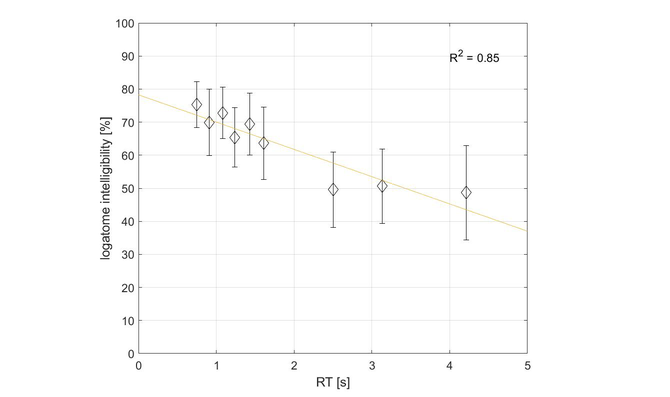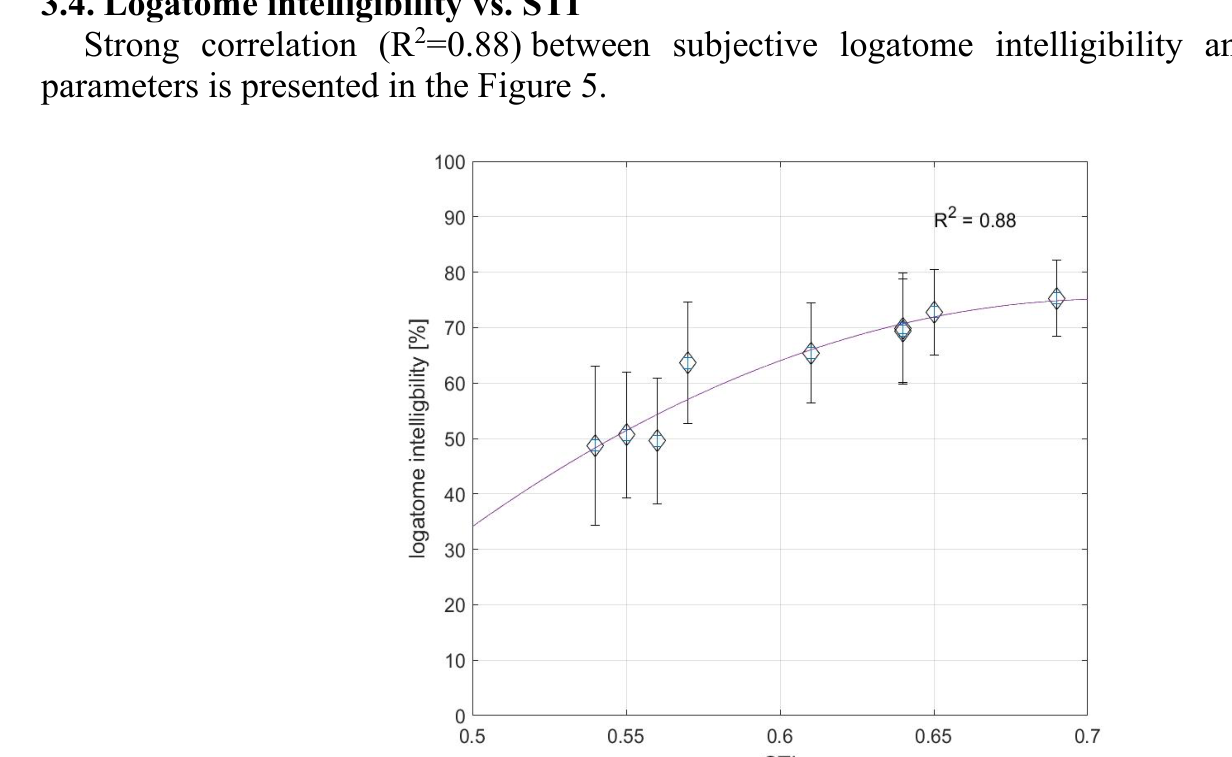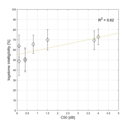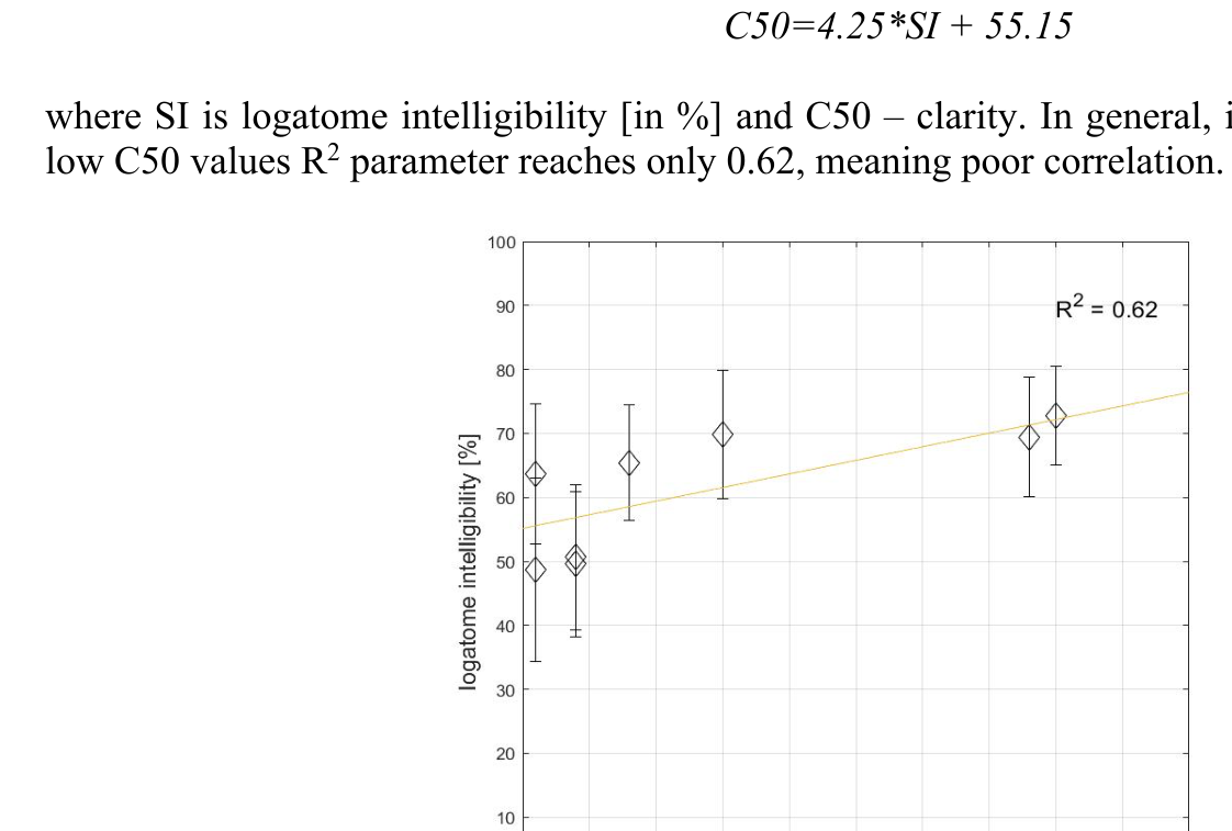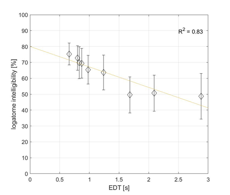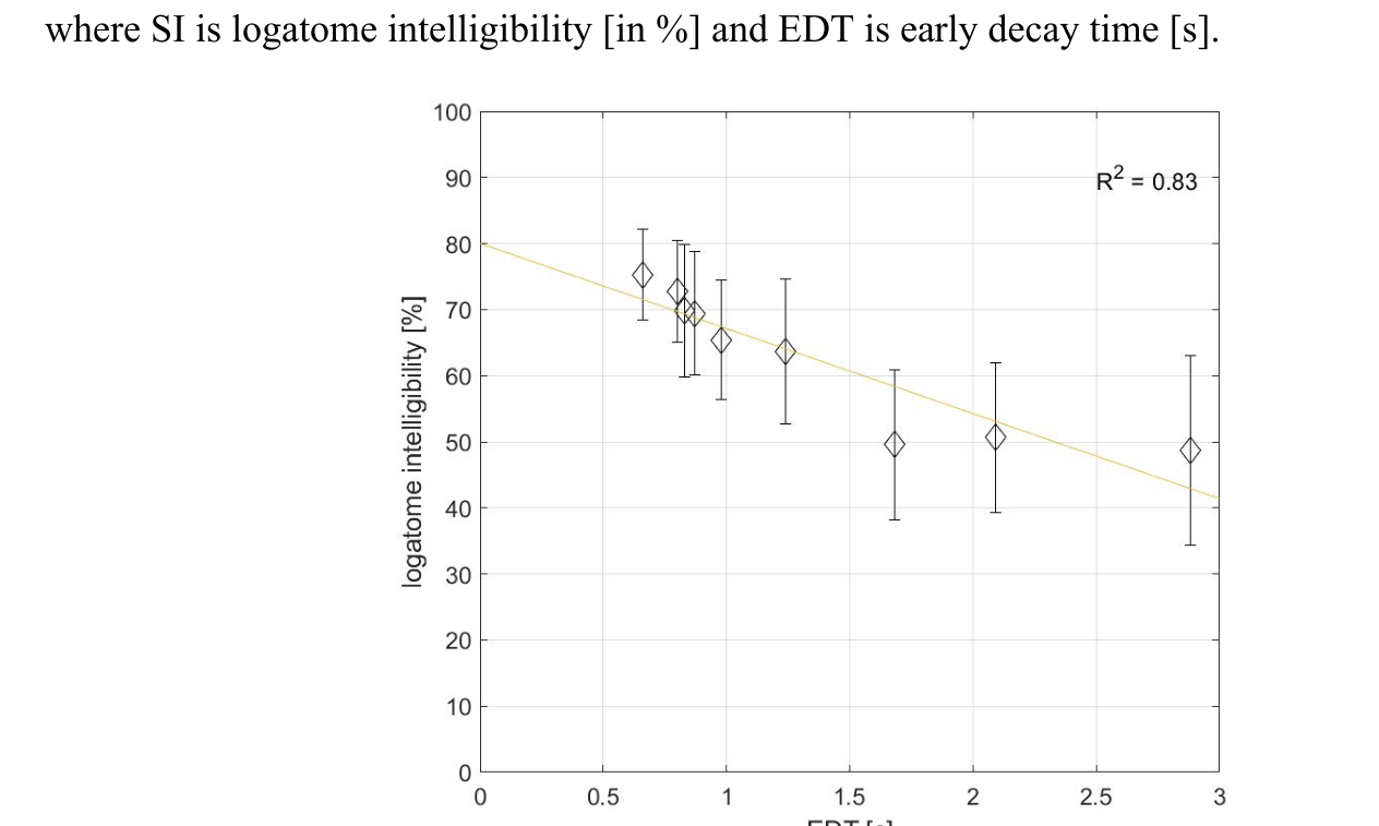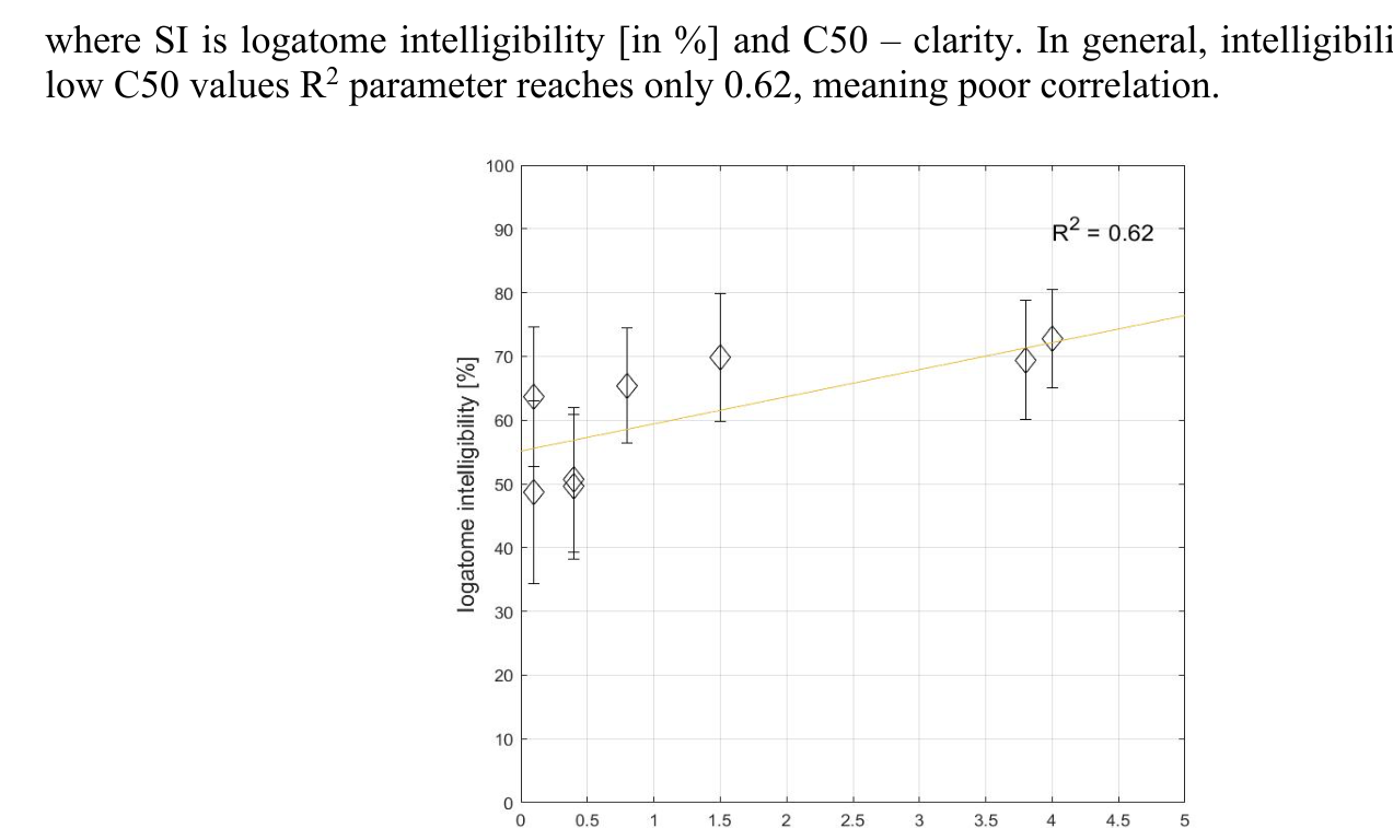 A A A Objective measurements and subjective assessment of the speech intelligibility in rooms with an Active Acoustic Enhancement Systems Łukasz Błasiński 1 , Anna Pastusiak 2 , Jędrzej Kociński 3 , Maciej Buszkiewicz 4 Department of Acoustics, Faculty of Physics, Adam Mickiewicz University, Poznań, ul. Uniwersytetu Poznańskiego 2, 61-614 Poznań, Poland ABSTRACT Speech Transmission Index (STI) remains one of the most important parameters used for the speech intelligibility assessment indoors. Achieving its sufficient values is crucial not only in classrooms and offices but also at cultural centers and halls. As the Active Acoustic Enhancement Systems (AAES) are getting more and more commonly used, we decided to verify how such systems affect speech perception. Objective parameters were measured in three rooms equipped with the AAES. The listening test was designed to verify if the subjectively assessed intelligibility would be compatible with the results of the objective measurements. Speech material, presented to the 180 normally hearing subjects, was obtained by convolving 50-element nonsense word lists with the room’s impulse responses. The measured RT values varied from 0.91 to 4.21 s and STI from 0.54 to 0.64 Despite the significant differences in the RT values, STI coefficient values remained only slightly decreased. RT and EDT were highly correlated with intelligibility in the opposition to the C50 parameter. The results proved that the comparison of the subjective examination’s results and calculated objective parameters is crucial in terms of comprehensive speech intelligibility evaluation. 1. INTRODUCTION Conditions of the speech presentation may concern the appearance of the background noise, but, in the case of indoors, one, even more important problem remains the reverberation, that value is strongly related with speech intelligibility. Speech intelligibility [1], then, refers to how well the meaning of speech is transmitted to the listeners. In general, the higher the value of reverberation time, the lower speech intelligibility is, due to the overlap-masking effect [2]. Providing sufficient quality of speech remains the most important aim of broadly understood room acoustics. This issue, apart from being relevant, remains sophisticated and hard to analyze in detail. Not only do halls need to fulfill their regular function, but also provide comfortable listening conditions while the room's role changes (so called ‘multi-use’). However, modifying acoustic parameters indoors often involves high costs and may negatively influence the visual attributes, such important in e.g., auditoria or theaters. One of the available solutions are Active Acoustic Enhancement Systems (AAES) which are getting more and more widespread in architectural acoustics. Involving powerful DSP technologies, precise tuning techniques, as well as high quality electro-acoustic systems, they allow the acoustic parameters of a halls and venues to be changed far more extensively and controllably than with passive techniques (e.g., absorbing panels and drapes). As a result, e.g., the energy of early reflections and reverberation time may be increased, while maintaining the natural sound of the room. [3, 4]. Three most popular types of AAES are: in-line (which synthesizes reflections based on the direct sound), regenerative (where reflections are added to the venue’s original reflections) and ‘hybrid regenerative’ combining both methods. Although the AAES history, as well as their technical parameters are quite well described, the influence of different settings on speech perception measured in laboratory conditions (subjective assessment) remain unknown. 1 lukasz.blasinski@amu.edu.pl 2 anna.pastusiak@amu.edu.pl 3 jedrzej.kocinski@amu.edu.pl 4 maciej.buszkiewicz@amu.edu.pl The most natural method for subjective speech intelligibility estimation remains listening tests [5-7]. The type of used material can be very diverse - consisting of short words, syllables (with or without meaning) or sentences. The results of the subjective speech transmission’s quality should depend, to the maximum extent, on the physical parameters of the tested communication channel, and not on the structure of the language test itself. The elimination of information at the semantic level is ensured while using logatome lists. Those are available also in Polish [8]. They are, in fact, more difficult for listeners, but, on the other hand, more reliable, which is related to the logatome’s low redundant nature (comparing to e.g., words or digits) - using nonsense words has the advantage of removing the higher language processing that people use to understand words with degraded quality and so provides a less biased measure [9]. In effect, the influence of the cognitive association is limited and hearing acuity remains more important than a lexical prediction based on the speech context as well as participant’s vocabulary. This results in decreasing speech intelligibility with the amount of provided useful (meaningful) information being reduced [10]. To avoid unnecessary fatigue impacting speech perception on one hand, and provide sufficient accuracy on the other, lists of 50 or 100 logatomes are typically used [11]. Test lists should be phonetically balanced that includes uniform distribution of initial consonants, vowels and final consonants, according to their statistical occurrence in a certain language. Apart from subjective assessment of speech perception, also objective methods may be used for describing the acoustical situation in different enclosures and defining parameters such as reverberation time, clarity, early decay time, speech transmission index and others. It can be concluded that the mutual relationships between the objective parameters and the subjective assessment, still remains ambiguous to some extent. In this paper, speech intelligibility in different conditions defined by AES settings was a