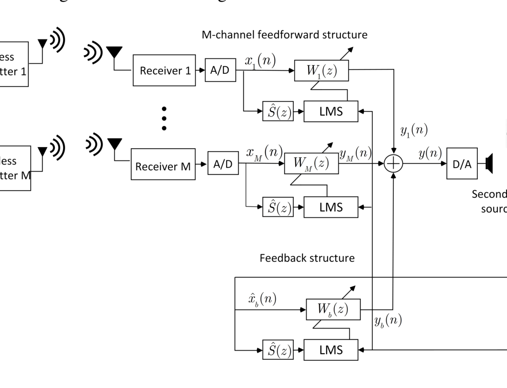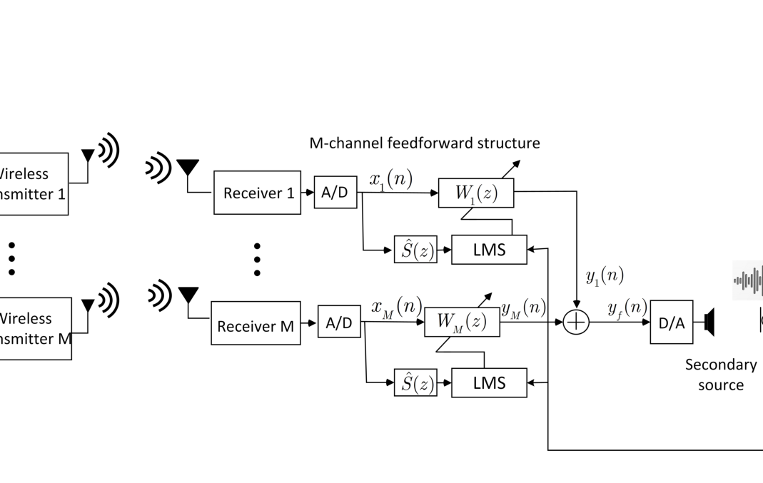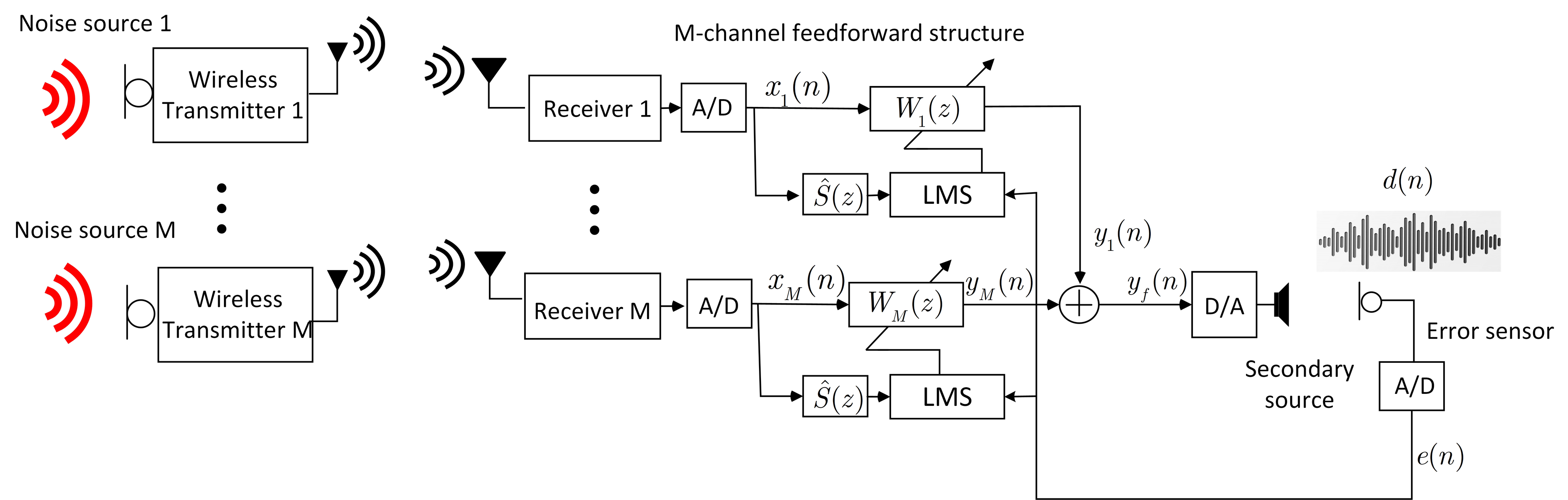 A A A Implementations of wireless active noise control in the headrest Xiaoyi Shen 1 , Dongyuan Shi, Santi Peksi, Woon-Seng Gan. Digital Signal Processing Lab, Nanyang Technological University 50 Nanyang Avenue, Singapore 639798 ABSTRACT Working from home went from a temporary result of the pandemic to a way of life. However, peace and quiet are hard to come by. To get rid of distraction, Active Noise Control (ANC) particularly the ANC headphones are widely used to attenuate the undesired noise in daily life. While it works, the prolonged usage of headphone can cause ear problems such as wax blockage, ear infections, pain, hearing loss, and impairment. This paper describes a wireless ANC system implementation designed for the headrest to reduce the noise distraction while doing away with discomfort caused by prolonged usage of headphone. Wireless microphones are utilized to pick up the noise with a high reference-to-interference ratio, which helps in improving the noise reduction performance of the ANC headrest. This paper investigates the wireless feedforward, feedback, and wireless hybrid ANC structures’ noise reduction performances in the ANC headrest. Comparative experimental results shown in this paper indicate the e ff ectiveness of the proposed approach in reducing noise around the headrest. 1. INTRODUCTION Active noise control (ANC) headphone is a a mature device in the market for creating a quiet environment [1–10]. Long-term use of headphones, on the other hand, causes customers to experience discomfort in their heads and ears, as well as a variety of health problems. The ANC headrest is designed to address this issue. The headrest can be used in vehicle and airplane seats, workspaces, and other relaxing environments. Users may relax themselves on the chair and no longer need to wear headphones or earphones. Instead of placing the secondary speaker inside the earcups, the ANC headrest positions it behind the head, as seen in Fig 1. Two secondary speakers and two error microphones are built into the ANC headrest to o ff er quite zones for the left and right ears. The headrests were implemented using a variety of ANC structures. In some cases, the feedforward ANC structures were built into the headrest. During these applications, an infrared sensor that detected the occupant’s head was used in the feedforward ANC system [11], where the filter coe ffi cients were pre-trained for various conditions and selected based on seating position. To improve the tracking performance on the head movement, the infrared rangefinders with the Kalman filter algorithm were brought into the feedforward ANC system [12]. Furthermore, feedback systems were also widely employed in headrests. An adaptive feedback algorithm was used to implement the ANC headrest without reference microphones, and single-channel feedback with combined 1 xiaoyi003@e.ntu.edu.sg, dongyuan.shi@ntu.edu.sg, SPeksi@ntu.edu.sg, EWSGAN@ntu.edu.sg a slaty. inter.noise 21-24 AUGUST SCOTTISH EVENT CAMPUS O ¥, ? GLASGOW Figure 1: The front and side view of the ANC headrest error signals and combined secondary speaker output was used to replace the two-channel feedback ANC algorithm, saving computational complexity [13]. Moreover, another feedback ANC method with head-mounted error microphones was realized on the headrest [14]. To further improve noise reduction performance, a feedback ANC structure involving a set of adaptive and fixed filters was proposed [15]. According to these studies, we can conclude that a hybrid combination of feedforward and feedback structures will provide numerous benefits to the ANC system and, as a result, is a desirable solution for the ANC headrest. The feedforward, feedback, and hybrid structures used in the ANC headrest in Sec 2 are revisited in this paper. Wireless microphones are used as reference microphones in feedforward and hybrid ANC to obtain a reference signal with a high signal to interference ratio (SIR) [16–19]. Sec 3 evaluates the noise reduction performance of wireless feedforward, feedback, and wireless hybrid ANC in real-time experiments using various noises type (sine-tone noise, broadband noise, real noise, multiple noises). Finally, in Sec 4, a conclusion is made. 2. ANC STRUCTURES FOR HEADREST This section will provide an overview of the proposed ANC structures and algorithms that will be implemented in the headrest. 2.1. Wireless feedforward ANC structure in the headrest The wireless microphone is used as the reference microphone in the feedforward ANC headrest [20–23]. The block diagram of wireless feedforward ANC is shown in Fig.2. The control signal is generated by the summation of M control filters: M X y f ( n ) = m = 1 y m ( n ) , (1) “am Figure 2: The block diagram of wireless feedforward ANC structure. where y m ( n ) is the output signal of m th control filter w m ( n ): y m ( n ) = x T m ( n ) w m ( n ) , m = 1 , 2 , · · · , M (2) where superscript ( · ) T denotes the transpose of the argument. x m ( n ) represents the reference signal picked up by the m th wireless microphone: x m ( n ) = { x m ( n ) , x m ( n − 1) , · · · , x m ( n − L f + 1) } T . (3) where L f is the length of feedforward control filter. The filter-x least mean square (FxLMS) algorithm is used to minimize the error signal obtained by the error microphone. The coe ffi cients of m th control filter are updated by: w m ( n + 1) = w m ( n ) − µ f x ′ m ( n ) e ( n ) , (4) where µ f is the step size of FXLMS algorithm, and the error signal is collected by the error microphone: e ( n ) = d ( n ) + y f ( n ) ∗ s ( n ) . (5) where ∗ represents the convolution operation. s ( n ) is the impulse response of the secondary path from the secondary speaker to the error microphone, whose estimation ˆ s ( n ) can be modeled either online or o ffl ine, and d ( n ) denotes the disturbance at the error microphone. In practice, the filtered reference signal x ′ m ( n ) in Equation 4 is