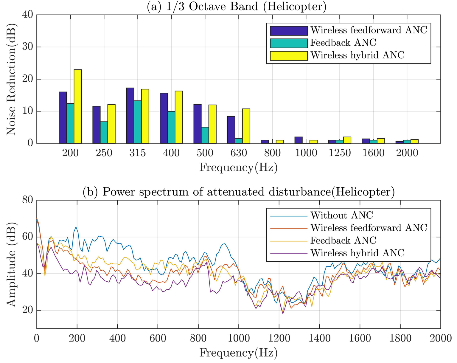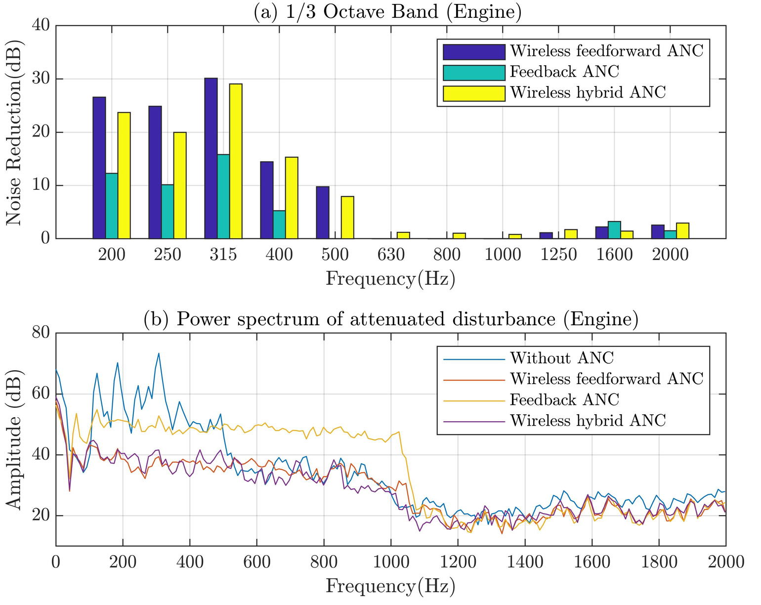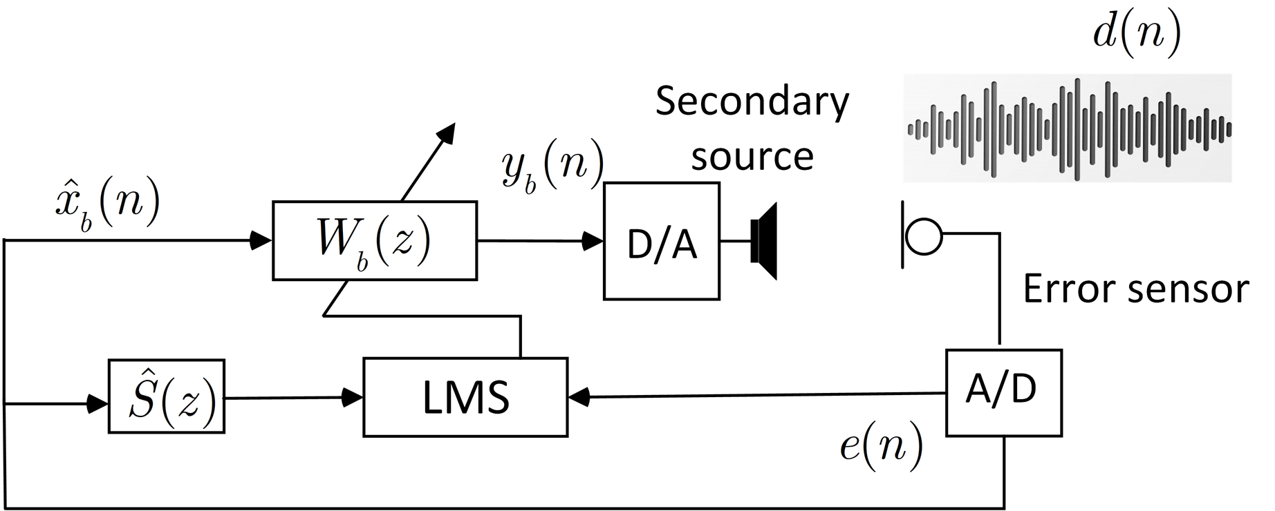 A A A Implementations of wireless active noise control in the headrest Xiaoyi Shen 1 , Dongyuan Shi, Santi Peksi, Woon-Seng Gan. Digital Signal Processing Lab, Nanyang Technological University 50 Nanyang Avenue, Singapore 639798 ABSTRACT Working from home went from a temporary result of the pandemic to a way of life. However, peace and quiet are hard to come by. To get rid of distraction, Active Noise Control (ANC) particularly the ANC headphones are widely used to attenuate the undesired noise in daily life. While it works, the prolonged usage of headphone can cause ear problems such as wax blockage, ear infections, pain, hearing loss, and impairment. This paper describes a wireless ANC system implementation designed for the headrest to reduce the noise distraction while doing away with discomfort caused by prolonged usage of headphone. Wireless microphones are utilized to pick up the noise with a high reference-to-interference ratio, which helps in improving the noise reduction performance of the ANC headrest. This paper investigates the wireless feedforward, feedback, and wireless hybrid ANC structures’ noise reduction performances in the ANC headrest. Comparative experimental results shown in this paper indicate the e ff ectiveness of the proposed approach in reducing noise around the headrest. 1. INTRODUCTION Active noise control (ANC) headphone is a a mature device in the market for creating a quiet environment [1–10]. Long-term use of headphones, on the other hand, causes customers to experience discomfort in their heads and ears, as well as a variety of health problems. The ANC headrest is designed to address this issue. The headrest can be used in vehicle and airplane seats, workspaces, and other relaxing environments. Users may relax themselves on the chair and no longer need to wear headphones or earphones. Instead of placing the secondary speaker inside the earcups, the ANC headrest positions it behind the head, as seen in Fig 1. Two secondary speakers and two error microphones are built into the ANC headrest to o ff er quite zones for the left and right ears. The headrests were implemented using a variety of ANC structures. In some cases, the feedforward ANC structures were built into the headrest. During these applications, an infrared sensor that detected the occupant’s head was used in the feedforward ANC system [11], where the filter coe ffi cients were pre-trained for various conditions and selected based on seating position. To improve the tracking performance on the head movement, the infrared rangefinders with the Kalman filter algorithm were brought into the feedforward ANC system [12]. Furthermore, feedback systems were also widely employed in headrests. An adaptive feedback algorithm was used to implement the ANC headrest without reference microphones, and single-channel feedback with combined 1 xiaoyi003@e.ntu.edu.sg, dongyuan.shi@ntu.edu.sg, SPeksi@ntu.edu.sg, EWSGAN@ntu.edu.sg a slaty. inter.noise 21-24 AUGUST SCOTTISH EVENT CAMPUS O ¥, ? GLASGOW Figure 1: The front and side view of the ANC headrest error signals and combined secondary speaker output was used to replace the two-channel feedback ANC algorithm, saving computational complexity [13]. Moreover, another feedback ANC method with head-mounted error microphones was realized on the headrest [14]. To further improve noise reduction performance, a feedback ANC structure involving a set of adaptive and fixed filters was proposed [15]. According to these studies, we can conclude that a hybrid combination of feedforward and feedback structures will provide numerous benefits to the ANC system and, as a result, is a desirable solution for the ANC headrest. The feedforward, feedback, and hybrid structures used in the ANC headrest in Sec 2 are revisited in this paper. Wireless microphones are used as reference microphones in feedforward and hybrid ANC to obtain a reference signal with a high signal to interference ratio (SIR) [16–19]. Sec 3 evaluates the noise reduction performance of wireless feedforward, feedback, and wireless hybrid ANC in real-time experiments using various noises type (sine-tone noise, broadband noise, real noise, multiple noises). Finally, in Sec 4, a conclusion is made. 2. ANC STRUCTURES FOR HEADREST This section will provide an overview of the proposed ANC structures and algorithms that will be implemented in the headrest. 2.1. Wireless feedforward ANC structure in the headrest The wireless microphone is used as the reference microphone in the feedforward ANC headrest [20–23]. The block diagram of wireless feedforward ANC is shown in Fig.2. The control signal is generated by the summation of M control filters: M X y f ( n ) = m = 1 y m ( n ) , (1) “am Figure 2: The block diagram of wireless feedforward ANC structure. where y m ( n ) is the output signal of m th control filter w m ( n ): y m ( n ) = x T m ( n ) w m ( n ) , m = 1 , 2 , · · · , M (2) where superscript ( · ) T denotes the transpose of the argument. x m ( n ) represents the reference signal picked up by the m th wireless microphone: x m ( n ) = { x m ( n ) , x m ( n − 1) , · · · , x m ( n − L f + 1) } T . (3) where L f is the length of feedforward control filter. The filter-x least mean square (FxLMS) algorithm is used to minimize the error signal obtained by the error microphone. The coe ffi cients of m th control filter are updated by: w m ( n + 1) = w m ( n ) − µ f x ′ m ( n ) e ( n ) , (4) where µ f is the step size of FXLMS algorithm, and the error signal is collected by the error microphone: e ( n ) = d ( n ) + y f ( n ) ∗ s ( n ) . (5) where ∗ represents the convolution operation. s ( n ) is the impulse response of the secondary path from the secondary speaker to the error microphone, whose estimation ˆ s ( n ) can be modeled either online or o ffl ine, and d ( n ) denotes the disturbance at the error microphone. In practice, the filtered reference signal x ′ m ( n ) in Equation 4 is