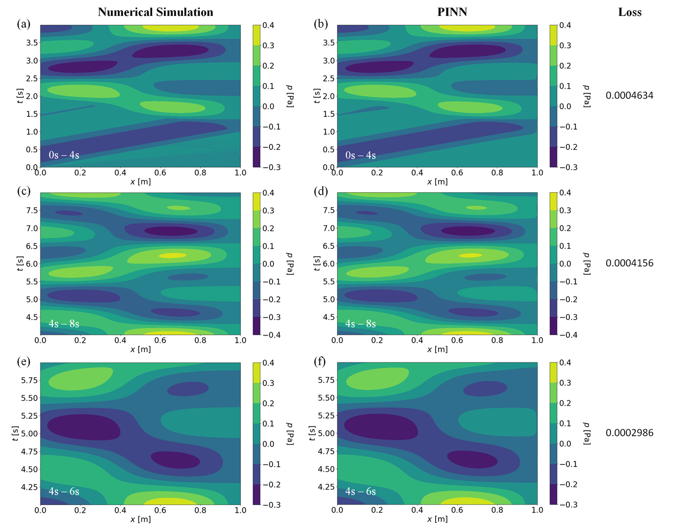 A A A Towards reconstruction of acoustic fields via physics-informed neural networks Korbinian Niebler 1 Technical University of Munich, School of Engineering & Design, Department of Engineering Physics and Computation Boltzmannstr. 15, 85747 Garching, Germany Philip Bonnaire 2 Technical University of Munich, School of Engineering & Design, Department of Engineering Physics and Computation Boltzmannstr. 15, 85747 Garching, Germany Nguyen Anh Khoa Doan 3 Faculty of Aerospace Engineering, Delft University of Technology Kluyverweg 1, 2629HS Delft, Netherlands Camilo Fernando Silva 4 Technical University of Munich, School of Engineering & Design, Department of Engineering Physics and Computation Boltzmannstr. 15, 85747 Garching, Germany ABSTRACT Acoustic measurements, obtained by microphones positioned at strategic places, are of great utility for the monitoring of a given acoustic system and for its protection in case large pressure fluctuations are measured. Such strategies are reliable as long as the microphones are properly positioned, which is not evident: in some cases the excited acoustic modes are not known beforehand. In this work, we proposed a method based on physics-informed neural networks (PINN) in order to reconstruct the entire acoustic field of a given acoustic element, when provided with only some acoustic measurements at some few locations. Such a method makes use of a feedforward neural network, where the loss function is taken as the residual of the acoustic wave equation. Such a residual is computed exploiting the automatic di ff erentiation property of neural networks, in order to obtain the corresponding spatial and time derivatives. Additionally, the measurements of the aforementioned microphones are gathered and used also for the calculation of additional terms in the PINN loss function. By doing so, the most adequate acoustic state is obtained, which satisfies 1 korbinian.niebler@tum.de 2 philip.bonnaire@tum.de 3 n.a.k.doan@tudelft.nl 4 camilo.silva@tum.de a slaty. inter.noise 21-24 AUGUST SCOTTISH EVENT CAMPUS O ¥, ? GLASGOW both measurements and the acoustic wave equation. In other words, the acoustic field within the system is reconstructed. 1. INTRODUCTION After the proof that feedforward neural networks are universal approximators for arbitrary functions [1] and also their derivatives [2], research with neural networks has yielded enormous progress and significant results in a wide range of scientific disciplines. The studies in the fields of image recognition [3], natural language processing [4], cognitive science [5], and genomics [6] are representative of this development. However, when examining complex problems, gaining enough data for the training of the neural network presents a challenge for the state-of-the art machine learning techniques. Therefore the study of Raissi et al. [7] o ff ers a great possibility to counteract the obstacles posed by a small-data regime. They introduced physics-informed neural networks (PINNs), which stand out due to a modification of the loss function. The well-known mean squared error (MSE) minimization of the training data is extended by an error function characterized by the residual of the governing partial di ff erential equation (PDE) of the system. The embedding of the PDE is achieved by a powerful but underestimated computational tool, the automatic di ff erentiation described in the study of Baydin et al. [8]. When dealing with a system, where only a small amount of data is available and where a physical law, especially a PDE, forms a constraint, the concept of physics-informed neural networks o ff ers a promising chance to overcome the challenges posed by the physics and data characterizing these systems. In our study we aim to analyse a system with the physical constraint defined by the one- dimensional acoustic wave equation: ∂ 2 p ∂ t 2 − ¯ c ∂ 2 p ∂ x 2 = 0 . (1) Here, p denotes the acoustic pressure of the system, t the time, x represents the spatial variable and ¯ c stands for the (constant) speed of sound. We will use the presented concept of PINNs to reconstruct the pressure distribution in a given domain relying on only few training data (measurements). In a second step, we investigate how a given reflection coe ffi cient or wall impedance associated with the system can be calculated in postprocessing. 2. DESCRIPTION OF THE PROBLEM We define the domain of our problem as one-dimensional in space. The inlet of the domain is located at x = 0, where a forcing function is also applied. Continuously, this forcing inlet introduces disturbances into the domain. The outlet at x = L = 1m is characterized by a specific wall reflection coe ffi cient R , which may vary between 0 and 1. The training data for the neural network is generated through a custom numerical simulation. For the set-up of the simulation, instead of the wave equation, we implement the linearized mass and momentum equation as defined in [9]. In this work, we refer to this set of equations as the linearized acoustic equations: 1 ¯ c 2 ∂ p ∂ t = − ¯ ρ ∂ v ∂ x , (2) ¯ ρ ∂ v ∂ t = − ∂ p ∂ x . (3) In this set of equations, the constant ambient density ¯ ρ and speed of sound ¯ c are introduced. In addition to the acoustic pressure p , the acoustic velocity v is also accounted for. For the simulation we choose the linear acoustic equations over the acoustic wave equation because of the handling of boundary conditions which is considerably simpler. The boundary conditions are mostly formed by first-order derivatives so their implementation is facilitated by using a system of first-order di ff erential equations. Regarding the discretization and the solving of the equations, we use a centered finite di ff erences scheme with sixth order of accuracy in space and a forward Euler scheme in time. The specific details of the neural network used in this study regarding its architecture and the training process can be fou