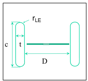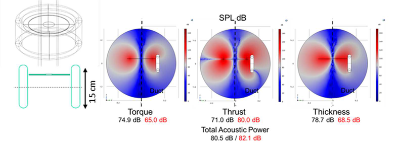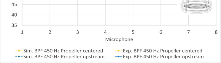 A A A Fundamental noise characterization of a ducted propeller in hover Frank Simon 1 DMPE - ONERA - Université de Toulouse F-31055, Toulouse, France Noah H. Schiller 2 , Nikolas S. Zawodny 3 , Nicole A. Pettingill 4 , Matthew B. Galles 5 NASA Langley Research Center Hampton, Virginia 23681, USA ABSTRACT Unmanned aerial vehicles (UAVs) are currently being used for reconnaissance missions, tactical surveillance, and infrastructure inspection. When legislation allows it, these devices will provide additional services close to inhabited areas, which could lead to noise complaints. On most UAVs, the propellers are the dominant source of noise. As a result, researchers have studied the impact of propeller shape and blade count on noise. Much of this work, however, has focused on isolated propellers. While different UAV concepts are equipped with ducts for aerodynamic and protection reasons, few studies focus on the acoustic benefit of ducts, as is achieved, for example, on turbofan aircraft. The objectives of this paper are: first, to simulate the noise radiation of a UAV propeller in static conditions based on its location in a hard wall duct; second, to analyze the contribution of the different acoustic source components (i.e., thrust, torque, and thickness); and third, to validate the approach with experiments conducted in the NASA Small Hover Anechoic Chamber over a range of propeller rotation rates. For the propeller and duct geometries considered in this experiment, it is shown that the best attenuation is achieved when the propeller is centered axially in the duct because of interference between upstream and downstream radiated waves. 1. INTRODUCTION Unmanned aerial vehicles (UAVs) are being developed for various applications including reconnaissance, tactical surveillance, infrastructure inspection (e.g., bridges, buildings, and rail networks), and even inventory management in distribution centers. In the future, UAVs could also be used to provide personal services (e.g., delivery and even personal transportation) in populated areas. All of these applications would benefit from quieter vehicles. While many UAVs have electric motors that may generate high frequency tonal noise, propellers are typically the dominant noise source producing both tonal and broadband noise [1, 2]. Researchers have therefore considered various strategies to reduce propeller noise including varying the blade shape, propeller airframe spacing, propeller layout, and blade surface texture [3-8]. Ducts can also be used around the propellers to modify the acoustic radiation. For example, Martin and Boxwell [9] measured the noise radiated by a 2-bladed propeller surrounded by a 25.4 cm diameter rigid duct. The acoustic test, conducted in hover-type conditions, showed that the duct can increase the broadband noise relative to an isolated propeller if the duct leading edge radius is too small. The duct, however, was found to have little impact on the tonal noise at the blade passage frequency (BPF). In contrast, Malgoezar et al. [10] tested a 30 cm diameter duct in an anechoic wind tunnel and found 1 frank.simon@onera.fr 2 noah.h.schiller@nasa.gov, 3 nikolas.s.zawodny@nasa.gov, 4 nicole.a.pettingill@nasa.gov, 5 matthew.b.galles@nasa.gov | itt Tech| ata inter.noise 21-24 AUGUST SCOTTISH EVENT CAMPUS ? O ? 2 GLASGOW that the duct reduced the tonal noise at the BPF relative to an isolated propeller, particularly with low- speed (i.e., 10 m/s) background flow. The background flow also reduced the broadband noise of the ducted propeller relative to the no-flow test. The purpose of this study is to provide a fundamental numerical assessment of the impact of the duct on acoustic propagation and scattering at the propeller BPF. The objectives of the paper are: first, to simulate the tonal noise at the BPF for a ducted propeller in hover conditions; second, to analyze the contribution of different tonal source components (steady loading and thickness noise); and third, to compare predictions with experiments conducted in an anechoic chamber with low-speed background flow. 2. THEORETICAL “RING SOURCE” APPROACH To assess the effect of a duct on acoustic radiation at the propeller BPF, this study relies on a propeller noise formulation implemented in an acoustic finite element model. The formulation captures steady loading and thickness noise radiated from an isolated propeller but does not account for changes in the flow characteristics or loading conditions due to the duct. Instead, the blade shape, operating conditions, thrust, and torque are all inputs to the model. Asymptotic approximations can be used to understand the 3D structure of the pressure field produced by a spinning sinusoidal distribution of steady loading and thickness sources. These formulations highlight the presence of creeping evanescent waves in the near field that do not radiate efficiently to the far-field, but still interact with the duct [11,12]. These types of formulations often provide directivity but not absolute source pressure, which depends on the loading and design of the propeller. The formulation by Garrick and Watkins [13], describing near-field pressure as a function of thrust and torque, is used in this study. Specifically, the effective ring approximation is used, which assumes the thrust and torque are concentrated on an annular ring instead of distributed over the propeller disk. The annular ring is placed at an effective propeller radius , usually 0.8 of the blade radius, as depicted in Figure 1 (a). The pressure field due to the thrust and torque components can be defined as: R, ∓ 1 2 (1) and 1 2 !" # R, (2) where ! is the harmonic number, " is the blade count, is the azimuthal angle, R, $%& 4( ) is the free-space Green’s function with ( defined as the distance between the observer and an elemental radiator on the annular ring, * is the acoustic wavenumber, and is the propeller axis. (a) (b) Figure 1: (a) Top view of a notiona
