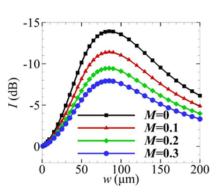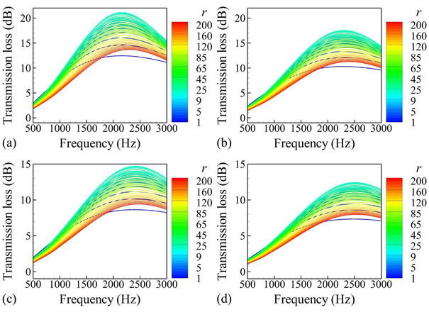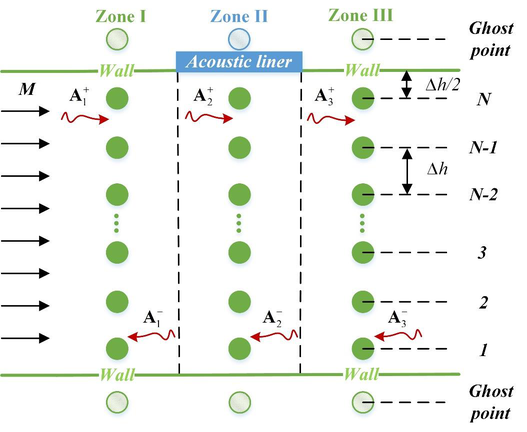 A A A Effect of the microstructure on the acoustic performance of porous material liner in the duct Xiang Song 1 , Jingjian Xu 1 , Tianyue Yuan 1 , Dan Sui 1 , Heye Xiao 2 , Jie Zhou 1, * 1 School of Aeronautics, Northwestern Polytechnical University Xi’an 710072, China 2 Unmanned System Research Institute, Northwestern Polytechnical University, Xi’an 710072, China ABSTRACT Acoustic liners can efficiently reduce the sound pressure level in the duct. The porous material liner has recently received wide attention due to the excellent attenuation performance at mid- to high- frequencies. However, more attention was paid to the sound attenuation of the given porous material liner in the duct rather than the design of the porous material liner for a duct noise problem. In this work, from a micro perspective, the influences of the average fiber radius and gap of the porous material liner on the acoustic field in a duct are systematically analyzed, based on the bottom-up method and the Johnson-Champoux-Allard model. The multimodal method is utilized to evaluate the duct acoustic field. The work may guide the selection and design of the porous material during the application of the porous material in the duct noise problem. 1. INTRODUCTION Aircraft engines are the major source of the aerodynamic noise radiated from the airplane. Acous- tic liner is widely used to suppress the fan noise generated by the engines, which is a convenient and efficient passive treatment for noise reduction [1,2]. Among the acoustic liners, the porous material liner attracted wide attention for its lightness, high-temperature tolerance, and excellent acoustic per- formance. The open-cell foam metal liners were firstly proposed and tested on a low-speed fan by Sutiff, with the potential to reduce noise by 4 dB [3]. Then, it is found that the over-the-rotor metal foam liner can achieve 4-5 dB broadband attenuation, according to the far-field acoustic levels meas- urement conducted on the FJ44-3A turbofan engine [4]. Considering the potential of the porous ma- terial liner for noise reduction, several theories have been proposed for the evaluation of the sound attenuation of the porous material liner [5–8]. However, less attention was paid to the design of the porous material liner for a duct noise problem than studies on the given porous material liner in the duct. In the previous studies, the effect of the microstructure was focused on the sound absorption of the porous material, in which the sound wave is incident normally at the surface of the infinite porous material, and the effect of mean flow is neglected. Compared with the in-depth and extensive studies on the sound absorption of the porous material, the effect of porous material liner on the acoustic performance of ducts needs to be studied more, especially from a micro perspective. Othmani et al. [9] performed the evaluation of the effect of the porous material liner on the acoustic power attenua- tion of an axisymmetric lined duct, but the evaluation was conducted by varying each macroscopic * Corresponding author. E-mail addresses: jiezhou@nwpu.edu.cn worm 2022 parameter individually and ignoring the mean flow. Jiang [10] investigated the effect of flow resis- tivity on the transmission loss of a porous lined duct. However, in reality, macroscopic parameters, including the flow resistivity, change together when the microstructure of porous material changes. Therefore, in this paper, the effect of the microstructure on the sound attenuation of the duct with the porous material liner is studied based on the bottom-up method [11–14]. For modeling the propaga- tion of sound propagation in the duct with a finite porous material liner, a finite-difference ghost point approach in the multimodal method is developed. The optimization problem maximizing the sound attenuation of duct systems is presented and solved for the design or manufacture of the porous ma- terial liner. 2. NUMERICAL METHOD 2.1. Governing Equations The sound propagation in a rectangular duct with an acoustic liner under the uniform mean flow is considered in this section, as shown in Figure 1. The duct consists of zone I, zone II, and zone III, and the acoustic liner is flush-mounted on the top of zone II. The acoustic field is governed by the Linearized Euler equations (LEE) in the dimensionless form: + = , p M u t x x − (1) + = , p M v t x y − (2) = + , u v M p t x x y + − (3) where M is the Mach number of the mean flow, p is the pressure perturbation, and u and v are the velocity perturbation components in ( x , y ) directions, respectively. Applying ( ) / / t M x + to the Eq. (3) and subtracting the partial derivative of the Eq. (1) with respect to x and the partial derivative of the Eq. (2) with respect to y , the following equation can be obtained: 2 2 2 2 2 2 2 2 2 2 2 0. p p p p p M M t y x x t x − − + + = (4) Under the assumption of harmonic time dependence for the fluctuating quantities, the fluctuating quantities are represented as: ( )exp( i )exp(i ), ( )exp( i )exp(i ), p P y kx t q Q y kx t = − = − (5) where the quantity k is the dimensionless wavenumber, is the angular frequency, and i / q p x = . The Eq. (4) can be transformed into the frequency domain: 2 2 2 2 2 d ( ) 1 ( ) 2 ( ) ( ) 0. d P y M k P y MkP y P y y − + − − = (6) Eq. (6) is discredited by N equally spaced points in the y -direction. The non-dimensional distance between two neighboring points is 1/ h N = , and the first and last points are / 2 h away from the hard wall or acoustic liner, as shown in Figure 1. The second-order central finite difference method is utilized to represent the second-order partial derivative of pressure with respect to y . The following generalized eigenvalue problem can be given: worm 2022 2 0 2 = , 0 0 M M k − − + 2 2 Q Q I I D P P I I (7) D 2 is the matrix for the second-order differential operator with respect to y , and I is the identity matrix . worm 2022 