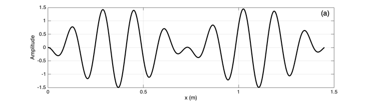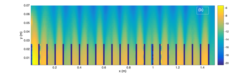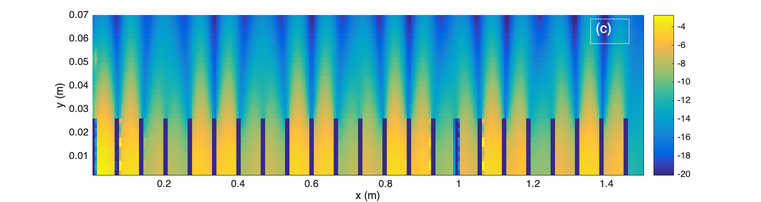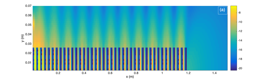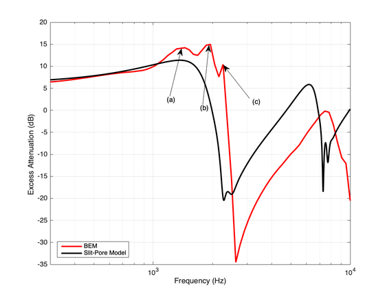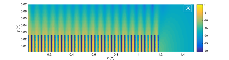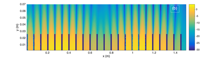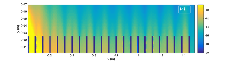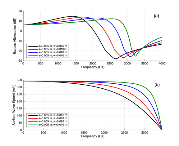 A A A Passive amplification of acoustic signals using surfaces with periodic roughness Alexander Stronach 1 RPS Group 5 New York Street, Manchester, M1 4JB Keith Attenborough 2 The Open University Walton Hall, Milton Keynes, MK7 6AA Shahram Taherzadeh 3 The Open University Walton Hall, Milton Keynes, MK7 6AA ABSTRACT Experimental and numerical studies using the Boundary Element Method (BEM) of the sound field generated over periodically spaced rectangular strips show that signals at audio frequencies may be passively amplified through interactions between the incident sound field and the rough surface. Roughness with sub-wavelength dimensions give rise to air-borne acoustic surfaces waves which arise when the rough surface has a high reactive component to its surface impedance and are considered as a slit-pore impedance surface with rigid backing. Surface waves result in excess attenuation spectra with anomalous maxima greater than the 6.02 dB associated with construction interference above an acoustically rigid surface. Increasing the roughness dimensions reduces the surface reactance and, therefore, the surface wave magnitude. Enhancements arising for larger spacings can be attributed to effects due to the finite width and periodicity of the array, quarter wavelength resonances within the gaps between elements, and Bragg Diffraction. Excess attenuation spectra and pressure maps of the total field above the rough surface show interesting features at the frequencies of signal enhancement. These features are attributable to the finite width of the array and resonant effects. Investigating the sound field over roughness allows for the surface dimensions to be modified to enhance any frequency of interest and yields deeper understanding of the sound field over roughness. 1 alex.stronach@rpsgroup.com 2 keith.attenborough@open.ac.uk 3 shahram.taherzadeh@open.ac.uk tt inter-ncie’” SCOTTISH evENT CAMPUS 3) O , o iLASGOW 1. INTRODUCTION The generation of airborne acoustic surface waves above a surface with a high reactive component to its surface impedance (e.g., porous media) is known to provide acoustic signal enhancement of magnitudes greater than that associated with constructive interference due to total reflection off an acoustically rigid surface [1,2]. Surface waves are identifiable as a peak in excess of 6 dB in excess attenuation spectra and decay cylindrically with horizontal distance. Their magnitude decreases exponentially with height above the surface. Brekhovskikh [3] studied sound propagation over ‘comb-like’ surface with a purely imaginary, spring-like, elastic impedance. Brekhovskikh considered Rayleigh waves as a degenerate case of the reflection of plane waves at a boundary. It was found that liquids and gases do not support surface wave propagation since the mean kinetic energy is greater than the mean potential energy. However, surface waves can cling to a surface with a purely imaginary impedance. The plane wave amplitude decreases exponentially with heigh above the surface and has a phase velocity which is less than that in free space. It was also shown that a comb-like surface on a rigid-backed layer may be represented as a thin layer of air with acoustically rigid backing with a surface impedance given by, 𝑍= 𝜌𝑐[𝑖𝑐𝑜𝑡ℎ(𝑘𝑙)] (1) Brekhovskikh assumed infinitely thin strips and, thus, does not provide a realistic model. However, this idealized case shows how propagation over a periodic surface may be modelled as that over an impedance layer Tolstoy [4] provides a more detailed formulation for the sound field above rough boundary between two fluids with differing densities. He showed that the result derived by Brekhovskikh can be derived by applying the Biot boundary wave theory to long wavelengths. Biot’s formulation replaces the scattering elements forming a rough surface with a smooth distribution of dipole and monopole sources assuming that the size of the roughness, 𝑑 , and spacing between roughness elements, ℎ , is significantly less than the wavelength of incident sound such that ! # " ≪ " ≪1 . The application of a simple effective boundary condition relating to the packing and shape of the roughness, as well as the number of elements per unit area. Tolstoy showed that for rigid, hemispherical bosses under far-field conditions, at grazing angles, the scattered wave is the surface wave given by, 𝑃 $ = 𝜍(2𝜋𝑟) %&/( 𝑘 )/( 81 + 𝜌 & %( : (2) 𝜌 ( where 𝜌 & ≠𝜌 ( and 𝜍 is the scattering parameter which has dimensions of length and is related to the volume of roughness elements per unit area. Medwin [5] validated the result derived by Tolstoy and determined that the scattered wave at the boundary does indeed exhibit a greater amplitude than that of the smooth surface direct wave. He conducted measurements of spherical pulses over hemispherical and spherical bosses and found that the resulting boundary waves propagated as 𝑘 )/( and 𝑟 &/( . The direct field was generated with a point source emitting a normalised spectrum with amplitude 𝑃 * = (2𝜋𝑟) %& yielding an amplitude ratio of, 𝑃 $ 𝑃 * = 𝜍(2𝜋𝑟) &/( 𝑘 )/( 81 + 𝜌 & %& : (3) 𝜌 ( At long ranges, it was found that the results deviated from the above relationships. This deviation may arise as a result of the effect of incoherent scatter dominating after a certain range. Alternatively, it may be that the phase lag between scattered elements results in destructive interference between the contributions. Tolstoy [6] determined that the boundary wave mode arises because of multiple coherently scattered sound waves travelling parallel to the boundary with energy highly concentrated near the surface between the tightly packed roughness elements. The inclusion of incoherent scatter losses for large 𝑘𝑟 yields a result which agrees with the experimental results of Medwin thus providing a complete theory for sound prop