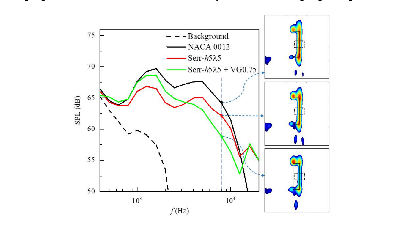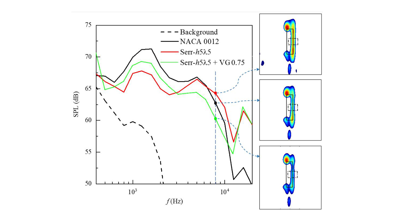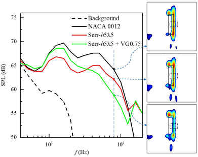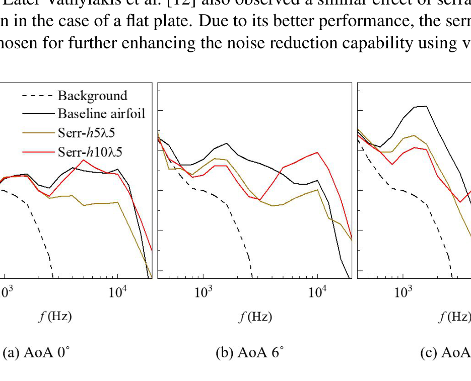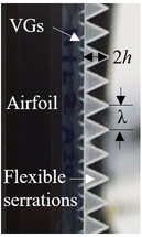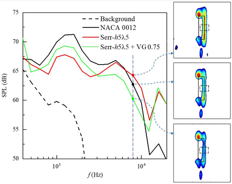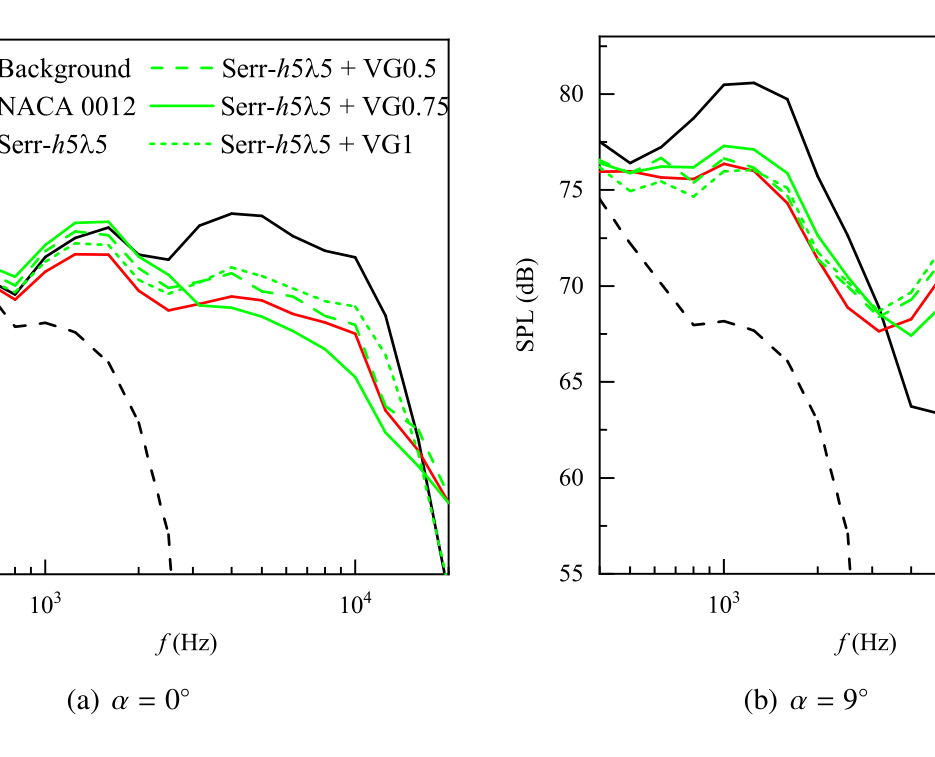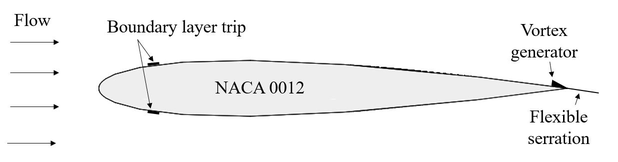 A A A Enhancing the noise reduction capability of serrations using low-profile vortex generators Shivam Sundeep, Peng Zhou, Chuntai Zheng, Hanbo Jiang, Siyang Zhong, and Xin Zhang 1 The Hong Kong University of Science and Technology Clear Water Bay, Kowloon, Hong Kong SAR, China ABSTRACT This paper presents an experimental investigation on improving the noise reduction capability of trailing edge serrations using upstream vortex generators. Experiments were conducted for a 100 mm chord NACA 0012 airfoil at four angle of attack between 0 ◦ and 9 ◦ and flow speed ranging from 20 to 50 m / s. The Reynolds number based on the chord length ranges from 1 . 3 × 10 5 to 3 . 3 × 10 5 . Vane type vortex generators with various heights of h /δ = 0 . 125 − 0 . 25 were placed along with the serration roots, where δ is the boundary layer thickness at the trailing edge without the vortex generators. The aeroacoustic measurements were made with a phased microphone array, and the aerodynamic measurements near the trailing edge were measured using a hot wire. The source integrated noise spectra showed on average 2 dB reduction in the trailing edge noise over high frequency range above 3 kHz. The generation of streamwise vortices by vortex generators can be identified in the wake measurement. These streamwise vortices were further found to counteract the cross-flow generated at the serration roots, hence improving the performance of the serration. 1. INTRODUCTION The airfoil self-noise generated by the scattering of surface pressure fluctuations at the trailing edge has been widely studied in the last decade [1,2]. Serrations have shown as capable in reducing the trailing edge noise. They are found to disrupt the development of spanwise vortices and assist the growth of streamwise vortices near the trailing edge and in the wake [3,4]. Experimentally many studies have found noise reduction of up to 7 dB in wind tunnel measurements using serrations [5,6]. Additionally, several models predicts 7 − 10 dB noise reduction similar to experiments [7, 8]. Zhou et al. [9] investigated the e ff ect of serration flexibility on the trailing edge noise. They observed an extra reduction in noise in the high-frequency range by flexible serrations. Further, they found that the flexible serrations can align better with the flow and reduce the aerodynamic loading on the airfoil. Although serrations have shown consistent noise reduction experimentally, an essential drawback of the serrations is the undesirable noise increment above a critical frequency [2, 10]. In practice, the flow may not be perfectly aligned with the serrations, potentially leading to an undesirable cross- flow and turbulent structures in the vicinity. E ffi ciency loss in the noise reduction can be observed, especially at high frequencies. Gruber [11] attributed the high-frequency noise increment to the 1 aexzhang@ust.hk a slaty. inter.noise 21-24 AUGUST SCOTTISH EVENT CAMPUS O ¥, ? GLASGOW increased turbulence intensity at the serration roots. Further, the noise increase at the high frequencies was found to be greater in the case of the misalignment between the serration and the undisturbed wake flow [6], and more noteworthy when the serrations have flap angles [10, 12, 13]. Avallone et al. [14] proposed that the cross-flow increased the high-frequency noise by continuously pushing the high moment fluid toward the serration surface. Later, with the help of particle image velocimetry (PIV) measurements of a serrated airfoil, León et al. [10] observed an enhanced wall-normal velocity fluctuation at the pressure side edge of the serrations at the crossover frequency, which is believed to be linked with the origin for the noise increment. Flow-control devices such as vortex generators (VGs) has the potential to control the cross-flow at the serration roots. Vortex generators can e ff ectively produce counter-rotating streamwise vortices within the boundary layer [15, 16]. The induced vortices can transfer high momentum flow from the upper regions of the boundary layer to the near-wall regions [15]. With proper VG design and placement, streamwise vortices of su ffi cient strength can be generated to counteract the cross-flow at the root of the serrations. In this regard, the current work aims at exploring the potential of further enhancing the noise reduction capability of the trailing edge serrations by employing the vortex generators at the roots of the flexible serration, as shown in Fig 1. The idea is to nullify the cross-flow using the streamwise vortices generated by the vortex generators. Figure 1: A schematic showing the location of vortex generator on the airfoil. A NACA 0012 airfoil with serrated trailing edge and with VG placed on its roots are experimentally tested at di ff erent free stream velocities. Non-zero serration flap angle, φ , and multiple angles of attack, α , are prescribed as sources of serration-flow misalignment. In order to relate the noise reduction mechanism to the flow field e ff ects, hot-wire measurements were taken along with the acoustic phased array measurements. The remaining part of this paper is organized as follows. First, the experimental setup and measuring methods are described in Section 2. Then, the results are presented in Section 3. In particular, the serrated trailing edge noise reduction and the corresponding mechanism are discussed in this part. Finally, the conclusions are given in Section 4. 2. EXPERIMENTAL SETUP The experiments were conducted in an anechoic wind tunnel, Ultra-quiet Noise Injection Test and Evaluation Device (UNITED), at The Hong Kong University of Science and Technology (HKUST) [17]. An open-jet square test section of 400 mm side was used in the study as shown in Fig. 2. The flow speed ranges from 10 m / s to 70 m / s, with turbulence intensity within the test section being lower than 0.32% over the whole flow speed range. The anechoic chamber surrounds the test section and