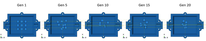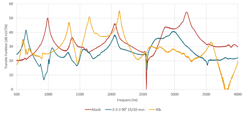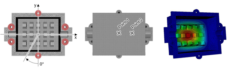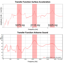 A A A Vibroacoustic metamaterials as add-on solution for noise reduction in existing housing structures Manuel Bopp 1 Albert Albers 2 IPEK – Institute of Product Engineering at KIT Kaiserstraße 10 76131 Karlsruhe Germany ABSTRACT Vibroacoustic metamaterials (VAMM) have the potential to reduce unwanted noise components in a very targeted and narrow-band frequency range. Many VAMM concepts are based on mechanical resonators that act as vibration absorbers in their natural frequency and thus absorb energy that would otherwise be radiated in the form of airborne sound and perceived as noise. Often, during the design phase, it is not yet possible to adequately assess which surfaces will be acoustically problematic and in which frequency ranges disturbing noise components are going to be. In addition, many VAMM concepts can only be manufactured using additive manufacturing (AM) processes, due to their complex geometry. AM parts often have strongly anisotropic material behavior depending on the manufacturing process, which makes a prediction of the vibroacoustic behavior even more difficult. Direct integration into housing structures is therefore not practical and economically feasible in most cases. This paper therefore investigates the extent to which retrofitted resonators can be effectively used in existing housing structures. For this purpose, FDM-printed bending resonators made of ABS and PLA are used, which have already been measured with respect to their natural frequencies in a previous publication. Different variants are attached to a demonstrator housing and the surface vibration velocity is measured using a 3D laser scanning vibrometer, and compared with the basic variant without resonators. The radiated airborne sound is also measured. Furthermore, a comparison is made with a dynamic FEM simulation in order to be able to evaluate its prediction quality, in particular with regard to the additively manufactured resonators. 1. INTRODUCTION The dynamic behavior of components is strongly influenced by the overall system context. The connection with other components results in multi-body oscillator systems, whose dynamic behavior deviates strongly from that of the individual components. Therefore, acoustic problems can often only be recognized after assembling the overall system, in a very late phase of the development process, where component changes can usually only be made at high cost. Therefore, so-called 1 manuel.bopp@kit.edu 2 albert.albers@kit.edu worm 2022 secondary measures are often used to solve such problems, in which existing vibrations are damped by introducing additional materials. Vibroacoustic metamaterials (VAMM) can offer advantages over conventional solutions such as foam mats, in terms of installation space and mass as well as precision of the frequencies to be attenuated, as has been shown in numerous publications already (e.g. [1–5]. There are two main challenges in the Application of VAMM. On the one hand, the resonators have to be designed for the correct target frequency, and on the other hand, suitable layouts (positions and orientations) for the resonators have to be determined. Furthermore, the number of resonators can be varied, e.g., to achieve an optimal ratio of additional mass to transmission loss, as presented in [7, 8]. In a previous publication [6] a best practice with three design rules for the positioning of retro- fitted bending-resonators was proposed, and has since been updated with new findings: 1. Resonators should be placed with higher density at positions with high displacement to maximize damping effects. 2. The bending axis of the resonator should be parallel to the iso-lines of the mode shape at the respective resonator position, or to a zero line of the target mode. 3. The number and layout of resonators can be optimized for a specific target function. In this study this approach is explored further. Investigated layout variants include the number, position and angle in which the resonators are fitted. The variants are evaluated numerically as well as experimentally. 2. MEASUREMENT SETUP AND METHODOLOGY worm 2022 The demonstrator as well as the test setup used for this study are shown in Figure 1 and are mainly carried over from [6]. The housing design is based on typical comfort actuator designs and consists of a base housing, which is mounted to the test rig, an interchangeable cover and a steel shaft. The design allows to easily investigate different shapes and materials for the cover, as well as changing the resonator configuration without changing anything else in the setup. Figure 1: Demonstrator housing and measurement setup with shaker, force sensor, shaft and housing. The front surface of the housing cover is measured by 3D-Laser-Scanning Vibrometer. Right: Measurement setup with microphone and enclosure. In this study a rectangular shape with a wall thickness of 3 mm was chosen. The housing was printed with a consumer grade FDM 3D printer in PLA with 0.2 mm layer height and the stack-direction in the direction of the shaker-axis. The structure is excited with a pseudo-random signal by a shaker, which is connected to the shaft via a stinger and a force sensor. The force is transmitted through the shaft and the bearing seats to the housing, where airborne noise is then radiated mainly over the housing cover. The airborne noise is measured with a microphone, which is shielded by an enclosure. The enclosure is fitted with 50 mm Basotect foam to avoid reflections and interference effects. Additionally, the surface vibration velocity of the cover is also measured using a 3D laser scanning vibrometer (see Figure 2). The curves of surface acceleration (SA) and sound pressure level (SPL) show three acoustically noticeable peaks at 933 Hz, 2330 Hz and 3290 Hz. Analyzing the force spectrum and the transfer functions on the right shows, that the first peak at 933 Hz is caused by resonances in the excitation, and that the natural frequ