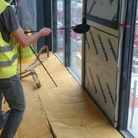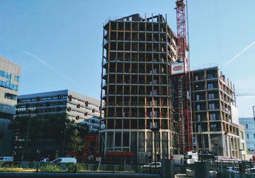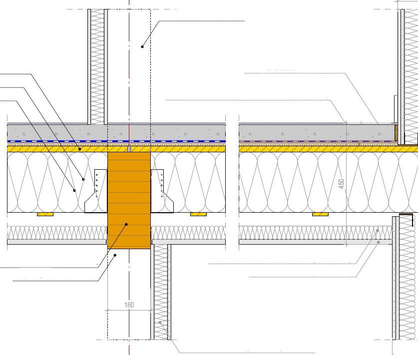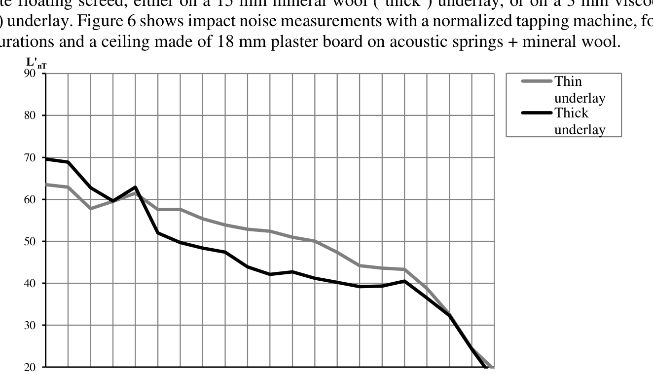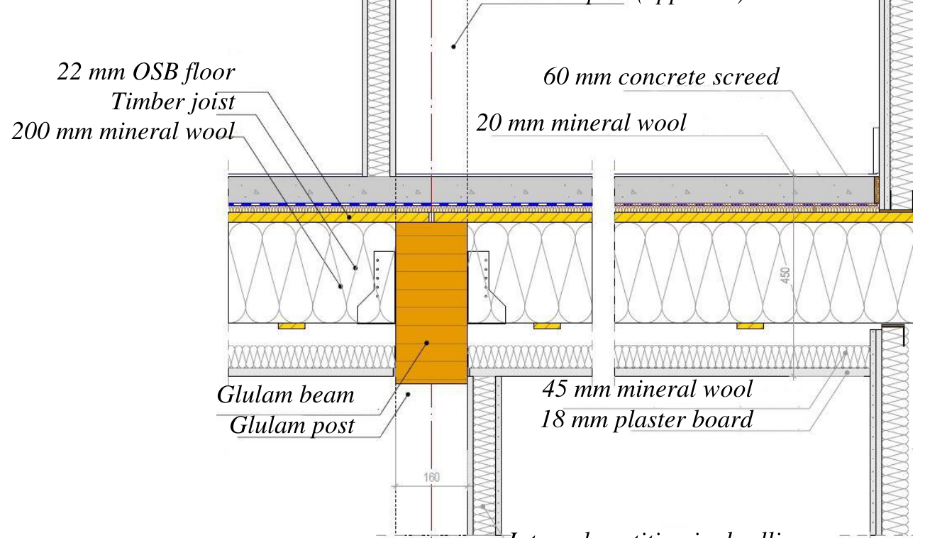 A A A A recent feedback of wooden multi-storey buildings in France Thomas TOULEMONDE 1 ACOUSTB 4 rue Dolorès Ibarruri – TSA 30001 – 93188 Montreuil cedex – France Bertrand DE BASTIANI 2 ACOUSTB 24 rue Joseph Fourier – 38400 Saint-Martin-d’Hères – France ABSTRACT Wooden structures are becoming quite common in the French architectural landscape, and ACOUSTB has made it a specialty regarding acoustics. Its experience ranges from office buildings to residential buildings, and from small to high-rise constructions. Airborne and impact noise insulation are of first importance. Structural aspects, construction methods and architecture are also discussed. Constructive solutions concern both CLT and traditional wood joists flooring systems, alternatives to floating screeds in office buildings and visible wooden structures in dwellings. Buildings are described, then selected constructive solutions are presented and debated with respect to targeted acoustic performance. Finally, in-situ measurement results are compared with the theory that underlays them, as well with the targeted performance. 1. INTRODUCTION The French wood community has created an organization, ADIVBOIS, whose objective is to remove the technical obstacles to the construction of high-rise buildings with a wooden structure. ACOUSTB has been leading the acoustic workshop of this organization since its inception, with the collaboration of various professionals in the sector: engineers, researchers and manufacturers. In 2022, theoretical models are getting mature, while their applications are already experimented in the construction industry. This article presents three examples and assesses their actual performance: a small housing building, already in use, a brand new headquarters for a French institution, and a high-rise dwelling building, still under construction. 1 thomas.toulemonde@egis.fr 2 bertrand.debastiani@egis.fr 2. L’ADELINE – DWELLINGS WITH A TRADITIONAL WOODEN STRUCTURE 2.1. Architectural and structural principles ‘yaaa Teena TE . / —_ — LIA Figure 1: L’Adeline, 14 housing units in Saint-Martin-d’Hères, R2K architects L’Adeline is a social housing program, built near Grenoble (Auvergne – Rhône-Alpes region). The 3- storey building is made of traditional wood frame, with glued laminated timber (‘glulam’) beams and posts, supporting floorings made of 22 mm OSB on joists. Glulam post (apparent) 22 mm OSB floor 60 mm concrete screed Timber joist 200 mm mineral wool 20 mm mineral wool 45 mm mineral wool 18 mm plaster board Glulam beam Glulam post Internal partition in dwelling Figure 2: Wood frame and horizontal partition between dwellings 2.2. Theoretical performances During the design stage, begun in 2016, acoustical standards were set to meet the French housing regulations. In particular: • Airborne insulation between housings (vertical and horizontal): D nT,w + C ≥ 53 dB • Impact noise in housings: L’ nT,w ≤ 58 dB, including hard floor finishes. Laboratory measurements [1] on a similar flooring complex let us predict the following performances: • Airborne sound reduction index: R w + C = 60 dB • Impact noise on concrete screed: L n,w = 50 dB. The design team paid particular attention to lateral transmission and allowed a few wood posts to remain visible inside the dwellings. 2.3. Measured performances and perceived quality Figure 3: Acoustical measurements after completion (2021) In living rooms and bedrooms, a PVC floor was laid on the concrete screeds at the end of the construction stage. ACOUSTB measured impact noise after completion. L’ nT,w performance turned out to be quite homogenous in the 4 vertical tested configurations, with a predicted prevalence of low-frequency noise, due to lightweight floor construction. Therefore, addition of a PVC floor finish with an efficient impact noise reduction at medium and high frequencies only makes a small difference compared with laboratory measurements (L n,w = 50 dB) tested without floor finish. The performance in the low-frequency range is considered satisfying, regarding present French standard: L’ nT,w + CI 50-2500 ≤ 55 dB. Table 1: L’Adeline, impact noise measurements results between superimposed housings Test reference Emission Reception L’ nT,w CI 50-2500 L’ nT,w + CI 50-2500 room room [dB] [dB] [dB] BCV1 Bedroom, 2 nd Bedroom, 1 st 48 5 53 floor floor BCV2 Bedroom, 2 nd Bedroom, 1 st 48 5 53 floor floor BCV3 Living room, Living room, 48 3 51 2 nd floor 1 st floor BCV4 Bedroom, 1 st Bedroom, ground floor 45 1 46 floor All tested configurations complied with French regulation regarding airborne sound insulation (D nT,w + C ≥ 53 dB). Measurements between superimposed dwellings showed that apparent posts caused a clear transmission in the 500-1000 Hz range: 75 70 65 60 AIV5 - Apparent post - DnTw+C = 53dB 55 AIV3 - Apparent post - DnTw+C = 54dB 50 AIV2 - Masked post - DnTw+C = 60dB 45 AIV1 - Masked post - DnTw+C = 61dB 40 35 30 125 250 500 1 k 2 k 4k Figure 4: Vertical airborne sound insulation - Apparent/masked wood posts This phenomenon has been later confirmed by ADIVBOIS measurements on a full-scale mock-up [2] and has driven further considerations, one of them being discussed in § 4.1 hereafter. 3. ONF HEADQUARTERS – LOW CARBON OFFICES 3.1. Architectural and structural principles Figure 5: ONF headquarters, Maisons-Alfort, VLAU & WOA architects Brand new ONF headquarters address low-carbon highest standards, with a wooden structure braced by an infrastructure and staircases made of concrete including blast furnace slag. The structure composed of lattice beams allows a great freedom of design and the creation of vast spaces and large corbels. In a strong commitment with environmental concerns, 160 mm CLT slabs have been only equipped with reused raised-floor panels on steel pedestals. No screed neither plaster ceiling were prescribed. A carpet finish is compulsory to mitigate horizontal transmissio