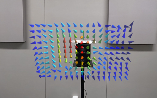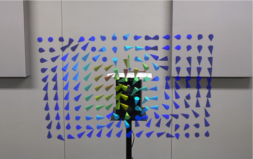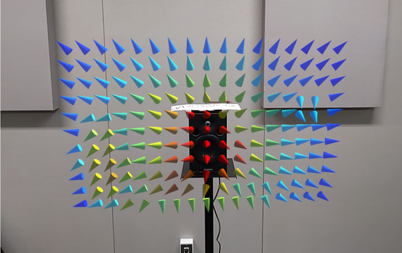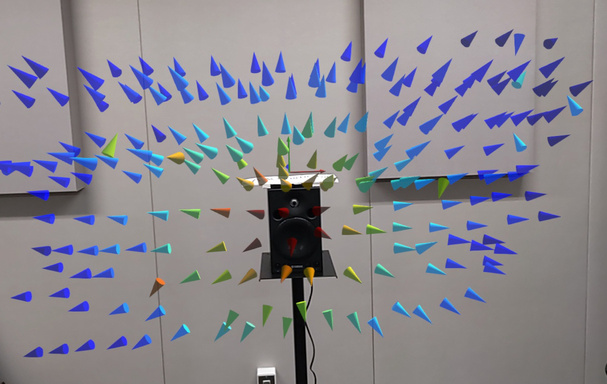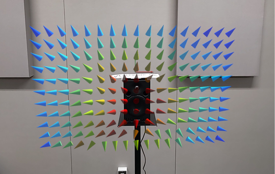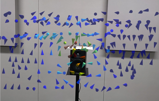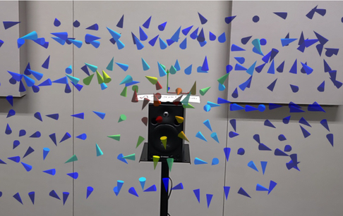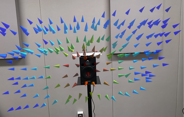 A A A Mixed reality visualization system for 3D sound intensity using PAGE method and spatial interpolation Ayame Uchida 1 Tokyo Denki University 5 Senju-Asahi-Cho, Adachi-ku, Tokyo, JAPAN Yukiko Okawa 2 Tokyo Denki University 5 Senju-Asahi-Cho, Adachi-ku, Tokyo, JAPAN Yusuke Ikeda 3 Tokyo Denki University 5 Senju-Asahi-Cho, Adachi-ku, Tokyo, JAPAN Yasuhiro Oikawa 4 Waseda University 3-4-1 Ookubo, Shinjuku-ku, Tokyo, JAPAN ABSTRACT In our previous study, we proposed the Mixed Reality visualization system for maps of three- dimensional sound intensities measured by a handy 4-ch microphone array. This system had a few shortcomings. The sound intensity was estimated by the cross-spectrum method. Because of this, the estimation errors at higher frequencies become larger owing to the spatial Nyquist frequency determined by the microphone intervals. Another problem is that the clarity of the sound intensity map is degraded because the intervals between the measurement points on the sound intensity map are irregular. In addition, the microphone array was moved manually. In this study, we improved the previous mixed reality system for sound intensity by applying the PAGE method (phase and amplitude gradient estimation), which can accurately estimate sound intensity up to higher frequencies. Furthermore, by using spatial interpolation of an irregularly sampled intensity map, we improved the clarity of the sound intensity map using mixed reality. The proposed system interpolates the sound intensities at equal intervals from those measured at irregular intervals. For evaluation, we conducted visualization experiments on the sound intensities surrounding a single loudspeaker. 1 22fmi08@ms.dendai.ac.jp 2 21fmi03@ms.dendai.ac.jp 3 yusuke.ikeda@mail.dendai.ac.jp 4 yoikawa@waseda.jp a slaty. inter.noise 21-24 AUGUST SCOTTISH EVENT CAMPUS O ¥, ? GLASGOW 1. INTRODUCTION Various sound field visualization methods have been proposed, such as beamforming [1] and acoustic holography [2]. Recently, several methods of data mapping in real space have been proposed for data visualization [3]. Inoue and Kataoka et al. proposed a real-time visualization system of sound intensities using mixed reality (MR) and a handheld microphone array [4, 5]. These systems make it easier to observe sound propagation by scanning a steady sound field with a handheld microphone array and then displaying the measured sound intensity in real space using mixed reality. Furthermore, Watanabe et al. proposed an MR visualization system for room impulse responses (RIR) that estimates sound intensities along the moving path of a microphone array [6]. In previous systems [5], because the sound intensity is estimated using the cross-spectral method [7], the estimation accuracy at higher frequencies is degraded owing to the spatial Nyquist frequency, which corresponds to the interval of microphones. Furthermore, because the sound intensity is measured by a freely moving microphone, the interval between measurement points becomes irregular. In addition, even if we want to visualize the sound propagation on a 2D plane to make the data more visible, it is di ffi cult to measure sound intensities on the same plane. Thus, the sound intensity data is spread irregularly, which reduces the distinguishability of the data. By extending our previous MR visualization system [5], we propose a visualization system to improve the clarity of the sound intensity map by spatially interpolating the sound intensities measured at irregular intervals into equally spaced intervals. Furthermore, to estimate the sound intensity at higher frequencies more accurately, the PAGE method is introduced into the MR visualization system. In the experiments, the sound intensities near the loudspeaker are measured by freely moving the handy microphone array and interpolated at equal intervals on a 2D grid for ease of visualization. 2. SYSTEM OVERVIEW Figure 1 presents an overview of the proposed system. In this system, the user wears a Microsoft Hololens 2, a mixed reality device, and scans the space for the visualization target using a handy 4ch microphone to measure the sound pressure signal. Sound intensity is estimated from the sound pressure signal obtained from the measurement using the method described below and then interpolated to visualize it at equal intervals. The microphone’s measurement position was estimated by combining two AR markers placed at the reference position in the measurement room and attached to the microphone array [5]. The position of the MR headset was continuously estimated by simultaneous localization and mapping (SLAM) using Microsoft HoloLens2 [8]. 3. SPATIAL INTERPOLATION OF SOUND INTENSITIES 3.1. Estimation of sound intensity using PAGE method Tomas et al. proposed the PAGE method [9], which achieves estimation of sound intensity at frequencies higher than the Nyquist frequency determined by the microphone interval. First, based on the least squares method, the phase gradient c ∇ ϕ is estimated as follows: c ∇ ϕ ( X T X ) − 1 X T δ ( ϕ ) , (1) X [ r 2 − r 1 | r 3 − r 1 | ... | r N − r N − 1 ] T , (2) δ ( ϕ ) " arg ( p 2 ) , arg ( p 3 ) , . . . , arg ( p N )# T , (3) p 1 p 1 p N − 1 where X denotes the vector of pairwise di ff erences, r i ( i = 1 , . . . , N ) denotes the position of the microphone, δ ( ϕ ) denotes the vector of pairwise phase di ff erences, and p i ( i = 1 , . . . , N ) denotes Microsoft HoloLens2 Creation of conical 3DCG Sound intensity Mic. shape : Regular tetrahereon Sencer SLAM Speaker Origin marker HoloLens2s’ global coordinates Relative coodinates of mic. Mic.marker 4ch handy microphone Mic. position PC Estimation of acoustic intensity with PAGE m ethod Spatial interpolation at grid points Measurement data Camera detection Data transmisson Figure 1: Overview of the proposed system. By using SLAM and AR makers, the measurement of the sound intensity with a 4-ch handy microphone array is stored