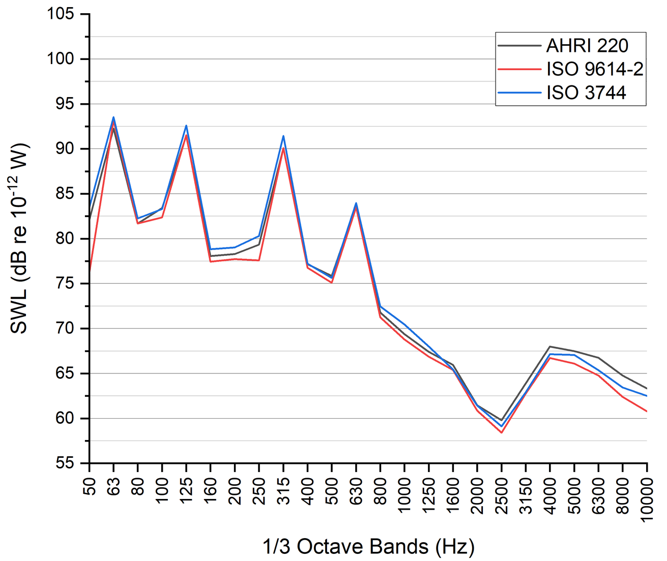 A A A An inter-laboratory study to quantify the repeatability, reproducibility, and bias of sound power measurement methods Samuel Underwood 1 Lily Wang 2 Durham School of Architectural Engineering and Construction University of Nebraska-Lincoln 1110 S. 67th Street Omaha NE 68182 ABSTRACT An inter-laboratory study across multiple facilities has been completed to quantify the repeatability, reproducibility, and bias of three di ff erent sound power measurement methods used in the heating, ventilation, and air-conditioning industry: free field method, di ff use field method, and intensity method. The sound power levels of a loudspeaker source across one-third octave bands have been measured in each participating laboratory by the test methods preferred in those facilities. Both a broadband signal with decreasing slope of – 5 dB per octave band and the same broadband signal with four discrete tones at 58, 120, 300, and 600 Hz have been measured in this round robin study. Comparisons of measured sound power levels have been made between methods, between laboratories, and between laboratories using the same method. Repeatability, reproducibility, laboratory bias, and test method bias are then quantified in accordance with ISO 5725. [Work supported by the Air-Conditioning, Heating, and Refrigeration Institute] 1. INTRODUCTION Sound power is a useful quantity for assessing the acoustic output of a noise source. Since it is distance independent, practitioners may directly compare sound powers from di ff erent sources or predict a resultant sound pressure level at discrete positions when environmental factors are known. Multiple sound power measurement standards have been developed, but the uncertainties associated with each standard have not been compared. This paper presents results to date from an inter-laboratory study to quantify the bias, reproducibility, and repeatability of three sound power measurement methods used in the heating, ventilation, air-conditioning, and refrigeration (HVACR) industry: direct comparison in a free field, sound intensity, and direct pressure comparison in a di ff use field. 1 samuelunderwood@huskers.unl.edu 2 lilywang@unl.edu a slaty. inter.noise 21-24 AUGUST SCOTTISH EVENT CAMPUS O ¥, ? GLASGOW 2. BACKGROUND Sound power ( W ) and sound power level ( S WL ) describe the rate of sound energy emission from a source. Multiple standardized methods for measuring sound power exist, and they can typically be attributed to one of three fundamental categories: – Direct comparison of sound pressure level (SPL) in a di ff use field to a reference source – Intensity scanned across an enclosing surface – Surface averaged sound pressure level in a free field 2.1. Direct Comparison in a Di ff use Field The sound power of an acoustic source can be determined via direct comparison to the known sound power level of a reference sound source (RSS) when both the RSS and the test source are tested in the same di ff use field. Using Equation 1, room-averaged sound pressure level measurements for the RSS and the test source in a qualified reverberation chamber can be used to calculate the sound power of the test source ( L w ): L W = L Wr + ( L P − L Pr ) (1) where L Wr is the known sound power level of the RSS, L P is the room-averaged sound pressure level of the test source, and L Pr is the room-averaged sound pressure level of the RSS. In this study, the direct comparison in a di ff use field method was implemented according to the AHRI 220 measurement standard [1]. A minor update to this standard is likely to be published before the end of 2022. 2.2. Intensity Method The sound power of an acoustic source may also be determined from measurements of acoustic intensity as scanned across an enclosing measurement surface. Intensity probe measurements are then integrated across the surface area of the enclosing measurement surface as expressed in Equation 2: W = Z S ⃗ I · ˆ n ds (2) where ⃗ I is the sound intensity vector, S is the surface area of the enclosing measurement surface, and ˆ n is the unit vector normal to the enclosing surface. In this study, the intensity method was implemented according to the ISO 9614-2 measurement standard [2]. 2.3. Sound Pressure Level in a Free Field If an acoustic source is placed upon a reflecting plane with a surrounding free field, the sound power level of the source can be determined from sound pressure level measurements averaged across an enclosing measurement surface. As expressed in Equation 3, the average sound pressure level measurements are corrected according to the surface area of the measurement surface to determine sound power level: L W = ¯ L P + 10 log ( S S 0 ) (3) where ¯ L P is the sound pressure level averaged across the measurement surface, S is the surface area of the measurement surface, and S 0 is 1 m 2 . In this study, the pressure in a free field method was implemented according to the ISO 3744 measurement standard [3]. 2.4. Measurement Uncertainty While each of the sound power measurement methods are defined by standardized procedures, there may exist contrasting measurement uncertainties between the methods. Sources of inter- laboratory and inter-method variation could include di ff erences in measurement chambers, sampling positions, equipment types, equipment calibrations, and correction factors. As such, the presence of systematic uncertainty should be explored. 3. METHODOLOGY 3.1. Repeatability Repeatability is defined as the within-lab precision under so-called "repeatability conditions" during which independent test results are obtained with the same method on the same test item(s) in the same measurement chamber by the same operator using the same measurement instruments within a short interval of time [4]. As depicted in Equation 4 this may be statistically expressed as a repeatability variance or repeatability standard deviation ( s r ): v t n X 1 n − 1 + s r = k = 1 ( y k − ¯ y ) (4) wher