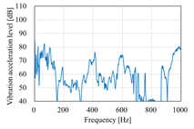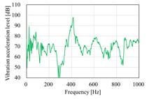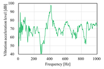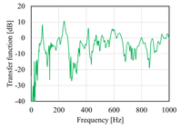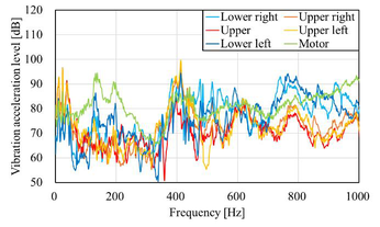 A A A Factor analysis of power seat noise using blocked force Ryohei Usui 1 Junji Yoshida 1 Osaka Institution of Technology 5-16-1 Omiya, Asahi-ku, Osaka-city, Osaka, 535-8585, Japan Yasuo Inose TS TECH CO.,LTD. 118-1 Ota, Takanezawa-machi, Shioya-gun, Tochigi, 329-1217, Japan ABSTRACT In recent years, operating noise generated by various devices in cabin has been focused and becomes noise reduction target due to the reduction of vehicle running noise. In this study, we then conducted the noise evaluation and investigated the noise factors of a power seat at the operating condition. At first, the operating noise at around driver’s ear position and vibration of the seat frame were meas- ured using an artificial head microphones and acceleration sensors. As a result, the noise and vibra- tion at 400-500 Hz band was found to be large and the reduction was essential to decrease the noise. Subsequently, component transfer path analysis was applied to understand the main factor of the large vibration of the frame at the target frequency. The result showed the vibration was increased largely due to the resonance between the rotational order input force from the driving motor and the natural frequency of the frame. As an instance of the countermeasure, small weight was added to the resonated part of the frame to avoid the resonance and the vibration and noise was observed to decrease at the target frequency band. 1. INTRODUCTION As automobiles have become quieter in recent years, operating noise generated by various devices in cabin has become more noticeable. In particular, power seats are often operated while the vehicle is parked, and the operating noise has a possibility to become a problem. The purpose of this study is to propose a guideline to effectively reduce the noise deteriorating the comfortability in cabin through the noise evaluation and the vibration analysis. In addition, component transfer path analysis [1-3] (CTPA) was applied as the factor analysis method and the contributions were analyzed in each direc- tional input force from the motor and vibration transfer characteristics of the frame to identify the main cause of the noise increase. 2. NOISE MEASUREMENT AND EVALUATION OF POWER SEAT 2.1. Experiment Outline At first, in order to understand which operational condition causes large noise, radiated noise of a power seat was recorded in each movement condition (front-back, up-down, and reclining condi- tions). Figure 1 shows the experimental environment and the power seat used in this experiment. 1 junji.yoshida@oit.ac.jp worm 2022 (a) Experimental environment (b) Power seat Figure 1: Experimental environment and power seat employed in the experiment. The noise recording was conducted for each movement condition. For the recording, an artificial head microphone (HEAD acoustics HMS2) was placed at the occupant’s head position as shown in Figure 1 (a). In addition, a weight was placed on the seat under the artificial head microphone to set the total weight on the seat as 60 kg to prepare similar condition in which a person sits on the seat. In this condition, the radiated noise in each operating condition was recorded for 15 s and repeated five times respectively. 2.2. Loudness of the Radiated Noise Figure 2 shows the averaged specific loudness of radiated noise recorded at left and right ear for five measurements in each operational condition. (a) Front-back condition (b) Up-down condition (c) Reclining condition Figure 2: Averaged specific loudness between left and right ear in each operational condition. Horizontal and vertical axes in Figure 2 are critical band [Bark] and the specific loudness [sone], respectively. As shown in this figure, the radiated noise was found to be loud at low-frequency band below 5 Bark (500 Hz) in the ascending, tilt forward, and tilt backward conditions. Accordingly, we focused on the radiated noise at the ascending condition, which was particularly loud, as the target operational condition for further analysis. 3. VIBRATION AND SOUND INCREASING POWER SEAT NOISE IN OPERATION 3.1. Experiment Outline Subsequently, we analyzed the physical factors (vibration and sound) increasing the specific loudness at the ascending condition. Figure 3 shows the measurement points for the vibration and sound in ascending condition. Six microphones (PCB Piezotronics 130E20) and acceleration sensors (PCB Piezotronics 352C22) were placed at lower right, upper right, upper, upper left, lower left, and motor points. (a) Microphones attachment points (b) Acceleration sensors attachment points Figure 3: Microphones and acceleration sensors attachment position. In the measurement, 60 kg weight was placed on the seat as same as the previous test and the vibration acceleration and sound pressure signals were measured for 15 s in total five times. 3.2. Vibration and Sound Pressure Level of Power Seat Figure 4 shows averaged vibration acceleration and sound pressure levels at the operational condition (ascending condition). (a) Vibration acceleration levels of power seat (b) Sound pressure levels of power seat Figure 4: Vibration acceleration and sound pressure levels of power seat at ascending condition. Horizontal and vertical axes show the frequency [Hz] and the vibration acceleration level (VAL) [dB], respectively. And horizontal and vertical axes in Figure 4 (b) shows the frequency [Hz] and the sound pressure level (SPL) [dB], respectively. As shown in Figure 4 (a), the VAL of seat frame was observed to be high at around 400-500 Hz band especially at upper left and right points. Moreover, SPL was also high at the same frequency band at almost all points as shown in Figure 4 (b). These results suggest that vibration and sound at the frame upper left and right points were the main factors increasing the specific loudness at 5 Bark. 4. CONTRIBUTION SEPARATION OF INPUTS IN EACH DIRECTION AND TRANS- FER SYSTEM [Tower right —Upper right 0 200400 6008001000 Frequency [Hz]