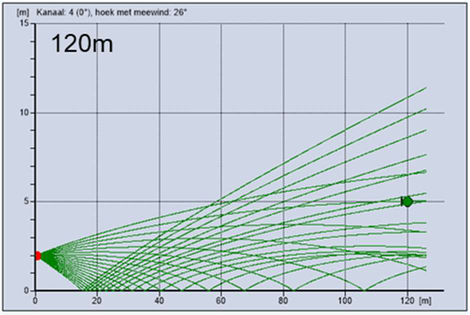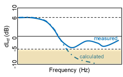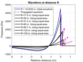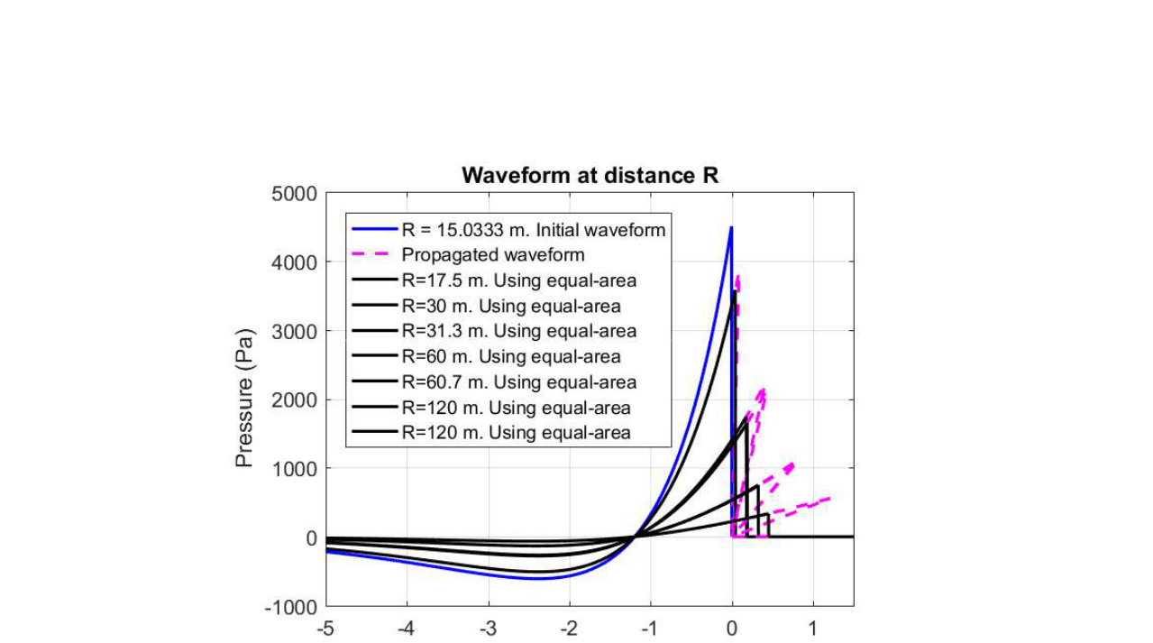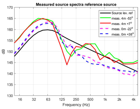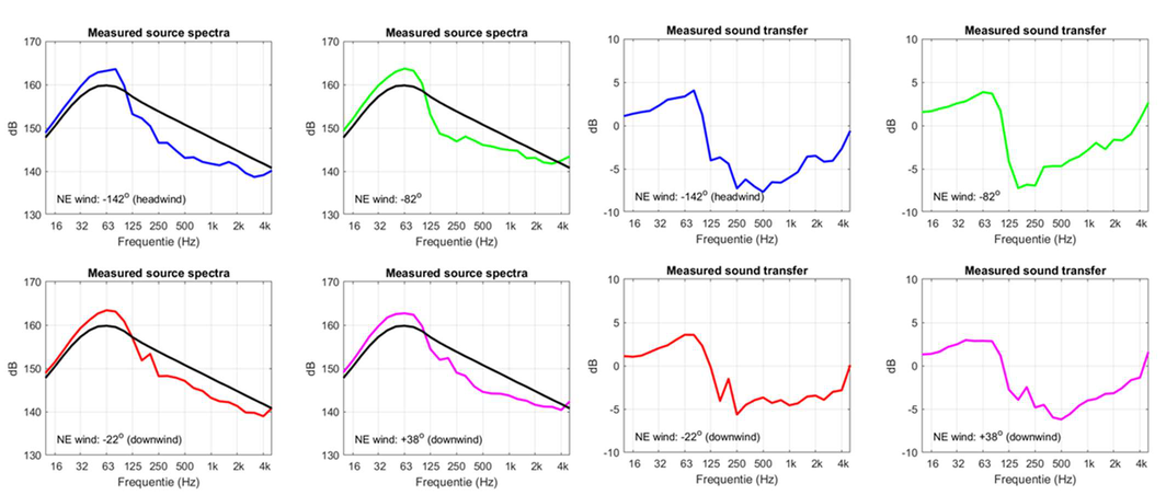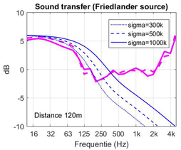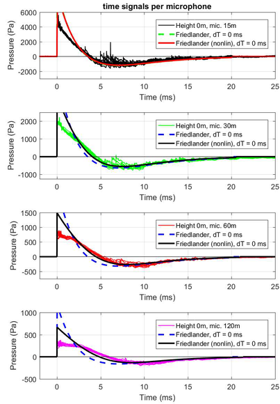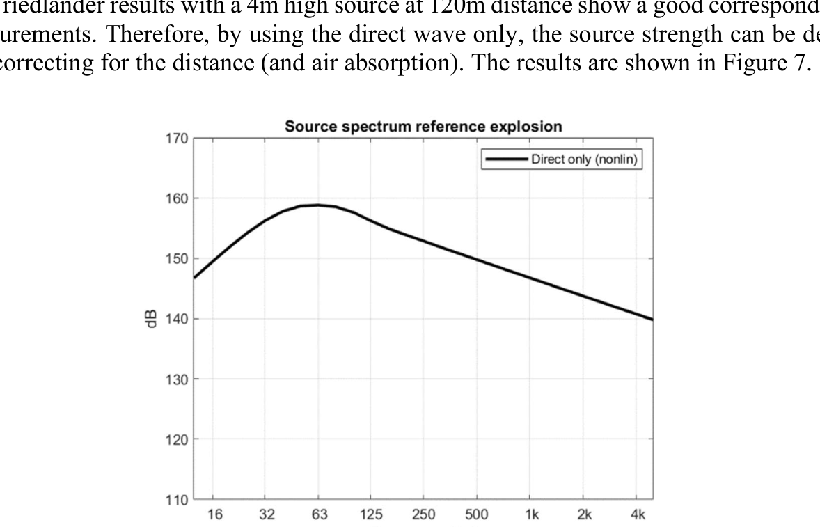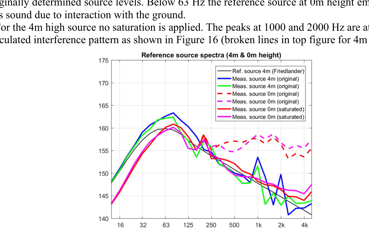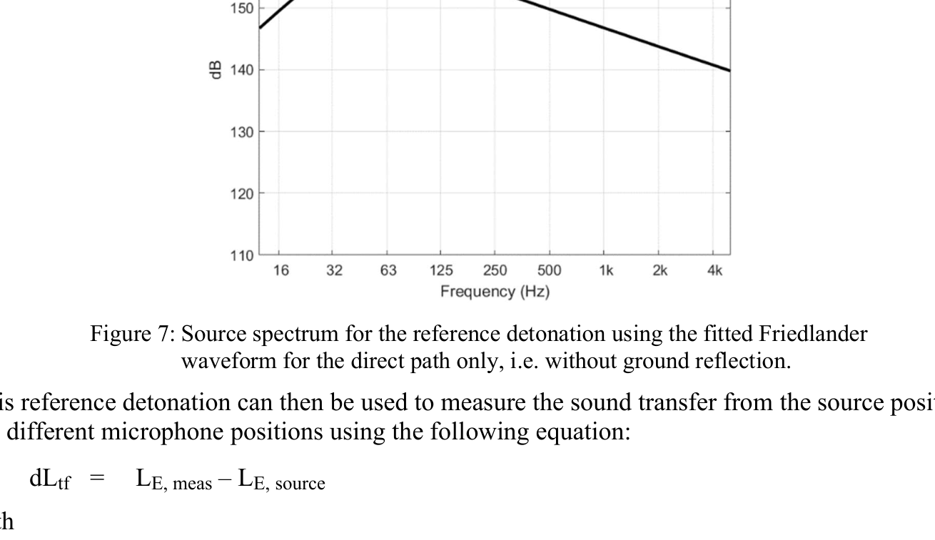 A A A Sound propagation for a low height impulsive source over an absorbing ground Frits van der Eerden 1 , Frank van den Berg, Ad van Heijningen TNO − Acoustics & Sonar department Oude Waalsdorperweg 63, 2597 AK, The Hague, The Netherlands ABSTRACT Noise contours around military training areas are calculated by using: a) the measured source strength for the impulsive sources and b) the calculated sound propagation using a representative set of meteorological situations. For high-energy impulsive sounds the source strength is measured at distances beyond 100 meters, where peak levels are below 154 dB. A linear model is used to correct for the sound propagation from the source to the measurement position. In this way a linear source strength is determined that can be used with linear sound propagation models. Previous results showed that the source strengths at higher frequencies (above 250 to 500 Hz) were overestimated when the impulsive source is on the ground. Apparently, the calculated sound propagation over an absorbing ground, used to determine the source strength, is accounting for too much ground absorption effect. Note that the actual meteorology and ground absorption are measured during the measurements. In this paper an impulsive reference source is used at two heights and the sound propagation is measured and calculated at increasing distances. It is shown that the measured ground absorption effect saturates for higher frequencies. Next, an unknown impulsive source was measured and the effect of saturation was demonstrated. 1. INTRODUCTION In general the noise contours for an area of interest can be determined using known acoustic sources and a calculation model for the sound propagation. For The Netherlands Ministry of Defence (MoD-NL) the impulsive sources used at military training areas are measured according to one of three techniques, depending on the peak level of the shockwave. For small arms the measurement distance for the microphones around the weapon is about 10 meters [1]. For larger weapons a distance of more than 100 meters is used [2]. The source strength is corrected for the sound propagation (or sound transfer) using a model that accounts for the actual meteorology and ground effect, such as the parabolic equation model [3]. By using a larger distance the measured peak levels are below 154 dB so that a linear sound propagation model can be used and also the source strength can be further used with linear models. Many measurements were carried out for large weapons, such as muzzle blasts from artillery fire and grenade detonations. For a muzzle blast the source height can be for example 2 meters, but for grenade detonations also zero height is used. It was seen that the source strengths at higher frequencies (above 250 to 500 Hz) were overestimated using this procedure when the source is on an absorbing ground. 1 Frits.vandereerden@tno.nl Jai. inter noise 21-24 AUGUST SCOTTISH EVENT CAMPUS ? O ? . GLASGOW In Figure 1 (left hand side) a source spectrum for a relatively high-energy impulsive source is drawn, with a logarithmic scale for the frequency, usually in one-third octave bands. The figure also shows a source spectrum with an overestimation at higher frequencies. SEL (dB) source spectrum too high source spectrum correct Frequency (Hz) Figure 1: Left: Sketch of a source spectrum with correct levels and with too high levels due to incorrect calculation of the sound transfer. Right: Measured and calculated sound transfer between source and microphone position. Frequency (Hz) OL 9 0S (ap) "1p OL- The objective of this paper is to show that this overestimation is due to the calculated sound transfer. The source spectrum is determined by using measurements and corrections for the sound transfer (meteo & ground), distance and air absorption. The right hand side figure shows an impression of the calculated sound transfer dL tf for a source on the ground. At low frequencies there is almost no ground absorption and the sound levels are doubled (coherently, i.e. +6 dB). The absorbing ground effect, which can be calculated with a complex impedance model such as Wilson [4] or Delany & Bazley, reduces the sound levels at higher frequencies. This is the result of destructive interference between two point sources. It will be shown that the sound transfer can also be measured with a known reference source. This resulted in a corrected approach for the calculated sound transfer using a saturation level of -5 dB for the heather ground on which measurements normally take place. Figure 2: Grenade at 0m and 4m height (left). Reference source at 0m and 4m height (right). This paper describes the measurements with a reference source (250 gram PETN) at 4m and 0m height and the measurements with a grenade, also at both heights, see Figure 2. The source strength for the reference source is determined by using measurements also at closer distances (and including a nonlinear propagation model). Finally, the source strength of the grenade is determined using an empirically corrected sound transfer when the source is detonating on an absorbing ground. 2. MEASUREMENTS WITH A REFERENCE SOURCE Measurements of 250 grams PETN based explosions (TNT equivalent 415 grams) were carried out at three different heights (0, 2m and 4m) and at four distances (15; 30; 60 and 120m), see Figure 3 . Also, ground impedance measurements were carried out using the two microphone technique and a one parameter model [4]. The wind and temperature profiles were determined using a meteo mast. The measurement were performed on a so called “smoke field” where test are performed with combustible materials. This terrain is regularly plowed to prevent the ground from catching fire. It was expected that the soil would be acoustically very soft, but rather high values for the flow resistivity were found, in the order of 4000 kPa.s.m -2 . When the ground was compacted by foot, and a bit rougher as a consequence, l