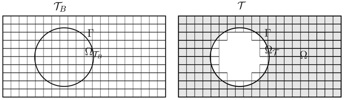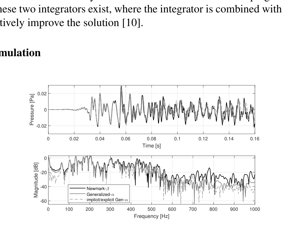 A A A A reduced-order cutFEM approach to model complex moving sound sources Sjoerd van Ophem 1 and Wim Desmet KU Leuven, Department of Mechanical Engineering Celestijnenlaan 300B, B-3001, Heverlee, Belgium Flanders Make- DMMS corelab, Belgium ABSTRACT While traditional finite element based vibro-acoustic analysis of structures is done on stationary structures, in many occasions the structure under investigation is actually moving. To perform accurate finite element analysis on the vibro-acoustic performance of such structures requires the evaluation of a time-varying system, leading to several challenges, such as the selection of a strategy to update the mesh to the new configuration and an adequate time integration scheme that does not introduce large numerical artifacts. Additionally, the time-varying nature leads to an increase in computational complexity. In this paper a modeling strategy based on cut finite elements (cutFEM) is introduced that aims to tackle these challenges. The cutFEM approach can be seen as a fictitious domain approach in which the source is moving over a static mesh, cutting through elements where the actual source is located, using a level set description. The key advantage of this approach is that no re-meshing and / or mesh morphing is required. It is shown how both implicit and explicit time integration schemes can be used to propagate the solution while the source is moving. Additionally, several model order reduction strategies are compared to speed up the online evaluation of the reduced order model. 1. INTRODUCTION A common assumption that is done for numerical vibro-acoustic analysis, e.g. with the finite element method (FEM), is that the source position is stationary. However, in many cases the acoustic source is actually moving. For example, when vehicle pass-by noise is evaluated or in machines and vehicles with many moving parts. While a far-field moving sound source can often be modeled with a simplified source model, such as a moving point source, the accurate modeling of near-field sound propagation requires a more detailed source model. A moving sound source brings many challenges from a modeling perspective. The traditional approach with conformal finite elements would mean that at every time instance a re-meshing step is required. This is not only a costly operation, but also requires manual intervention to assure the mesh quality is su ffi cient. To circumvent or mitigate this problem, several alternative solutions have been proposed in the literature that can broadly be divided into mesh morphing and static mesh approaches. 1 sjoerd.vanophem@kuleuven.be a slaty. inter.noise 21-24 AUGUST SCOTTISH EVENT CAMPUS O ¥, ? GLASGOW A popular approach that is based on mesh morphing is to reformulate the problem to an Arbitrary Lagrangian-Eulerian (ALE) formulation [1]. The advantage of the ALE form is that the degrees of freedom (DOFs) do not change when the source is moving, but morph to a new location. However, when the elements become too distorted, which is possible when the source moves large distances as compared to the acoustic wavelengths of interest, a re-meshing step is required, which is highly undesirable. An alternative approach is to use a static mesh, such that the problem does not require a re-meshing step during simulation, and use techniques to enrich the mesh to include the proper source description. Several techniques to do this are known, such as the extended finite element method (XFEM) and the cut finite element method (cutFEM) [2–4]. The disadvantage of these methods with respect to the ALE formulation is that the DOFs will change during the simulation, since the DOFs that are covered by the source fall outside of the physical domain and will not contribute to the solution. In this paper, it is chosen to investigate a cutFEM approach, due to the convenience of not having to apply mesh morphing and / or re-meshing. In Sec. 2, A cutFEM approach is derived that can model moving acoustic sources, while minimizing numerical artifacts. Several time-integration schemes are compared to this end in Sec. 3, comparing both the time response directly and the frequency content of the signal. Besides accurate modeling, also a preliminary investigation is done on the creation of a reduced order model in Sec. 4.The computational cost of such simulation is especially high, since the system matrices have to be recalculated at each time step. A reduced order model would speed up calculation time and potentially enable (near-)real time vibro-acoustic virtual sensing, as has been shown in previous work for stationary sources [5,6]. 2. CUTFEM FORMULATION In the following section the cutFEM formulation will be elaborated. The main idea behind a cutFEM formulation is to make the mesh as independent as possible from the geometry of the problem under investigation, while keeping the accuracy and stability of conformal finite elements. The boundaries / interfaces of the geometry are described by cuts through elements in the static mesh and numerical integration of the cut elements is done until the cut. A general overview of the cutFEM formulation is given by Burman et al. [2]. 2.1. Discretization of the wave equation with cutFEM To obtain the discretized acoustic cutFEM problem, we follow the approach given by Sticko and Kreiss [7]. Consider a 2-D domain in which the acoustic propagation is defined by the wave equation c 2 0 ∇ 2 p − ¨ p = 0 . (1) In this equation p represents the acoustic pressure, ¨ p is the second derivate of p with respect to time and c 0 the speed of sound in the fluid. Additionally, we assume that the source is described with a non-zero Neumann boundary condition (BC) at boundary Γ N ∂ p ∂ n | Γ N = g N . (2) Within the scope of this paper, we do not consider any other type of BC or source description in this work. Now, suppose that a su ffi ciently refined background mesh T b exists of linear elements that covers a 