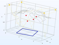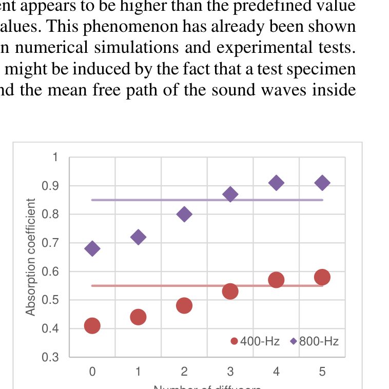 A A A Performance optimisation of small reverberant room with hanging diffusers Patrick Bouche 1 , Kevin Verdière 2 , Simon Campeau 3 Mecanum Inc 2444 rue Bonin, J1K 1C4, Sherbrooke, QC, CA ABSTRACT A small reverberant room can be an efficient and economic tool to provide fast diffuse field sound absorption measurements of homogeneous sound absorbers or more complex structures, and useful for developing, testing, or evaluating specification requirements in many industrial fields. However, small reverberant rooms are known to have some diffusivity issues in lower and middle frequencies, leading to unsuitable levels of consistency, reliability, and repeatability. This paper presents the re- sults of a study made to improve the measurement performance of a 5.7-m³ reverberant room under its Schroeder frequency (around 1275 Hz) by adding hanging diffusers. Using Ray-Tracing method, a numerical parametric study was done to estimate sound absorption of various samples by varying the number, the position, and the orientation of these diffusers based on ASTM C423 and E795 stand- ards. Moreover, extra simulation has been performed to evaluate the effect of sample size on sound absorption consistency in function of frequency. Following these prescriptions, an experimental study was done to confirm these improvements on frequency dependent sound absorption and single rating numbers such as NRC (Noise Reduction Coefficient) and SAA (Sound Absorption Average). The re- sults show that for this room, low frequency performance is significantly increased by using 4 well-placed hanging diffusers and a sufficient sample size. 1. INTRODUCTION Reverberant rooms are conventional equipment used by researchers and manufacturers to measure the diffuse field absorption coefficient of a large range of materials, from homogeneous porous struc- tures to complex combinations of different elements. This indicator is used to predict acoustic per- formance of these materials in many fields, like car or building industries. This measurement instru- ment follows multiple industrial international standards: the ASTM C423 [1] or ISO 354 [2] standards for rooms above 200 m 3 , and the SAE J2883 [3], that adds specific limitations to the two previous standards for the case of small rooms, with a volume between 6 and 25 m 3 . In this study, a 5.7-m 3 small reverberant room is considered and used (Figure 1). Its interior volume has a rectangular shape of 2.5 by 1.3 by 1.7 m and is made of six panels with a high acoustic reflec- tivity. The acoustic field is generated by four uncorrelated loudspeakers positioned at each upper 1 patrick.bouche@mecanum.com 2 kevin.verdiere@mecanum.com 3 simon.campeau@mecanum.com worm 2022 corner. The sound pressure level is measured by four microphones placed on the surface of an imag- inary 0.3-m radius sphere placed in the center of the room. Figure 1: Photo of the small reverberant room In 1962, Manfred Schroeder has presented a limiting frequency separating the modal and diffuse regions using a statistical approach. The cut-off frequency of a room, named Schroeder frequency, is defined by: worm 2022 𝑓 𝑐 = 2000 ඨ 𝑅𝑇 60 𝑉 ≅1275 𝐻𝑧 (1) where 𝑅𝑇 60 is the reverberation time, in seconds, for a 60-dB decay and 𝑉 is the room’s volume. Most international standards state that a good and reproductible sound absorption measurement is linked to a high sound field diffusivity in the reverberant room. Therefore, with such a high Schroeder frequency, low frequency absorption measurements in small rooms can’t be reliable without improv- ing the sound diffusiveness. Following the SAE J2883 prescriptions [3], with a volume of 5.7 m 3 and a minimal distance between 2 microphones of 0.45 m, the cut-off frequency of this reverberant room is lowered to 500 Hz. Considering this low frequency limitation, this paper presents an approach to improve the reliabil- ity and repeatability of the measurement of sound absorption in small reverberant room by adding hanging diffusers, as described in ASTM C423 [1] and ISO 354 [2]. To achieve this, a numerical investigation is carried out to improve the sound field diffusivity on the whole sound spectrum, with a special focus on the viability of measurements under the cut-off frequency and down to 250 Hz. This investigation is then followed by experimental validation. 2. PURPOSE AND METHODOLOGY To reach a high degree of sound field isotropy, ASTM C423 [1] in section 7.4 and appendix X1 and ISO 354 [2] in appendix A suggest adding a sufficient number of diffusers (i.e. increase the total surface of diffusers) until the absorption coefficient for a test specimen is maximized ( 𝛼 𝑚𝑎𝑥 ). There- fore, this study aims to find the diffuser configuration that produces the maximum absorption to create an approximately diffuse sound field. 2.1. PROTOCOL According to theses standards, stationary and rotating hanging diffusers are strongly recommended to increase diffusivity and achieve an acceptable diffuseness. It’s also strongly recommended to give random orientations and positions to those panels inside the reverberant room. A global optimisation is done using numerical simulation with the Ray Tracing method by increasing the surface area of diffusers for different test specimens of various dimensions and acoustics properties. Due to the small size of the room, to evaluate the improvement of diffuseness, the diffuser area is changed by adding an increasing the number of the same base diffuser, from 0 to 5, instead of the 5-m² step increase proposed by the standards. The sound absorption coefficient of test specimen is given by: 𝛼 𝑆 ≅ 55.3 𝑉 𝑐 0 𝑆 1 − 1 ൨ (2) 𝑇 1 𝑇 0 where 𝑐 0 is the speed of sound, 𝑉 is the room volume, 𝑆 is the surface of test specimen, 𝑇 0 is the reverberation time without test specimen, and 𝑇 1 is the reverberation time with test specimen. Two main indicators are used to e