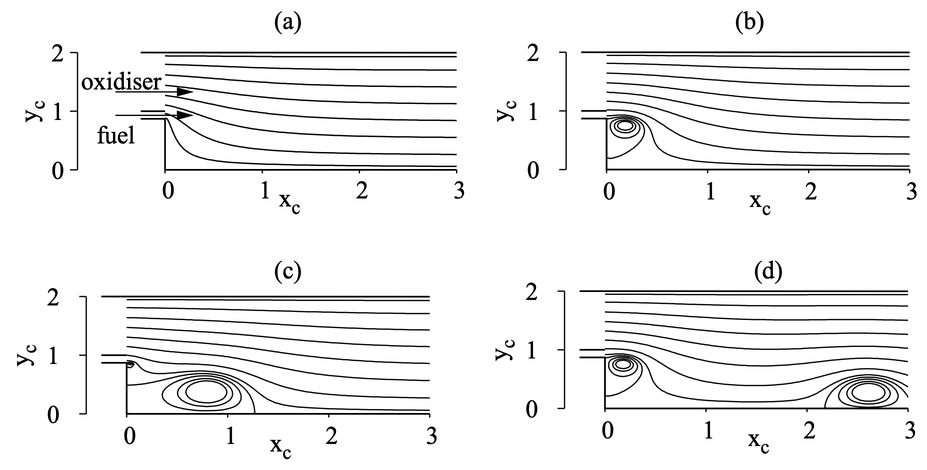 A A A Nonlinear Dynamical Features of Vortex-Acoustic Lock-On in a Backward-Facing Step Combustor Joel Varun Vasanth 1 Indian Institute of Technology, Madras Chennai 600036, India Satyanarayanan Chakravarthy Indian Institute of Technology, Madras Chennai 600036, India ABSTRACT Unstable shear layers characteristic of step combustors display strong vortex shedding and play a dominant role in combustion instability. Past non-premixed flame experiments with Reynolds number (Re) as the bifurcation parameter showed that during instability, the frequency of acoustic oscillations locks-on to the natural vortex shedding mode for a range of Re. In the present work, we study the dynamical features of this type of lock-on. We employ a vortex model to bring out the nonlinearity in the flame response to vortical perturbations. This is coupled with a Galerkin model for the acoustic field. Regimes of aperiodic oscillations, low-amplitude lock-on and high-amplitude lock-on are predicted in agreement with experimental trends. A transition to instability during lock-on via a supercritical Hopf bifurcation is observed with an increase in limit cycle amplitudes. Synchronisation between the acoustic pressure and vortex-driven heat release perturbation is studied using recurrence analysis. The system transitions from asynchronous to phase synchronisation in the low-amplitude lock-on regime, characterised by an increasing degree of phase correlation. In the high-amplitude lock-on regime, a state of generalised synchronisation exists, where in addition to the phase, the amplitudes also show strong correlation. 1. INTRODUCTION Flow fields past flame-holding devices in industrial and aircraft burners consist of spatially developing shear layers with regions of reverse flow that are inherently hydrodynamically unstable [ 1 ]. The resulting vortex shedding is a major factor contributing to combustion instability [ 2 ]. A unique feature of vortex-dominated combustion instability is vortex-acoustic lock-on. This has been experimentally observed by varying parameters of the flow such as the air flow Reynolds number, Re , in several flow configurations - a non-premixed backward-facing step (BFS) combustor [ 3 ], a partially premixed blu ff -body combustor [ 4 ] and recently a blu ff -body combustor 1 joelvarunvasanth@gmail.com a slaty. inter.noise 21-24 AUGUST SCOTTISH EVENT CAMPUS O ¥, ? GLASGOW with syngas fuel mixtures [ 5 ]. In [ 3 ], it was observed that, at a certain Re in the non-premixed BFS combustor, the dominant mode switches from f a to f v and remains locked on to f v with further increase in Re, accompanied by a nonlinear rise in p ′ RMS amplitudes. Similar observations of lock-on were made in [ 4 ] by varying combustor length, both air and fuel flow rates, and injection and blu ff -body locations. Baraiya et al [ 5 ] observed lock-on with the shear layer mode and the third and sixth harmonic of the longitudinal duct acoustic modes. Modelling approaches must include a vortex-based flame response in addition to an acoustic flame response to incorporate the competing e ff ects of either mode during lock-on. Vortex kicked-oscillator models [ 6 ], [ 7 ], [ 8 ]. They assume an unsteady heat release rate proportional to the circulation of a growing vortex at the location of the step edge. However, a clear-cut lock-on regime has not been predicted since a framework for dynamical evolution of the flame to capture flame-vortex interactions is lacking. Many studies on lock-on in the context of externally forced thermoacoustic systems have recently been performed [ 9 ], [ 10 ], [ 11 ]. These studies also characterise the nonlinear dynamics of lock-on. General results show a lock-on as a synchronisation of the self-excited thermoacoustic oscillation with the forcing frequency as the forcing amplitude is increased, via a quasiperiodic route. Low order models to mimic such dynamics were proposed, such as the forced van der Pol oscillator [ 11 ] and the Landau-Stuart model [ 12 ]. However, the modes considered in the above studies were all acoustic in nature and contributions from hydrodynamically self-excited oscillations were not dealt with. The forcing of hydrodynamically self-excited modes were studied by [ 13 ] and [ 14 ] in unconfined jet di ff usion flames, where lock-in of the hydrodynamic mode to the forcing frequency was observed. These studies, including those above, involve a unidirectional coupling from the applied forcing to the acoustic or hydrodynamic modes. What is required from the point of view of lock-on, is a bidirectional coupling. Further, these studies included scenarios where the vortex shedding oscillation frequency locks-on to the acoustics and not the other way around. Thus, developing a model to capture this latter type of lock-on and study the dynamical characteristics is of interest to the current work. We develop individual submodels for each of the three participating processes – flame, vortex shedding and acoustics, to enable their simultaneous evolution in a fully three-way coupled manner. For the non-premixed flame, we extend the use of a two-dimensional thermo-di ff usive model in a BFS combustor to include the e ff ect of the vorticity field, relaxing the assumption of uniform flow. For the 2D flow, we perform a Schwartz-Christo ff el conformal mapping of the step geometry and represent the velocities using complex potentials. This overcomes the localised vortex burning assumption in kicked-oscillator models and introduces the Arrhenius-type and convective nonlinearities of the acoustic driving as imposed on the base flow. Along with the Galerkin method for the acoustics, the resulting coupled simulations are compared with experimental results. Synchronisation between the acoustic pressure and heat release perturbation is then studied using phase space reconstruction. 2. MODELLING 2.1. Flow Modelling We assume an two-dimensional, inviscid, laminar flow in a backward facing step 