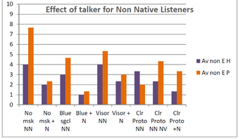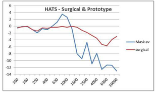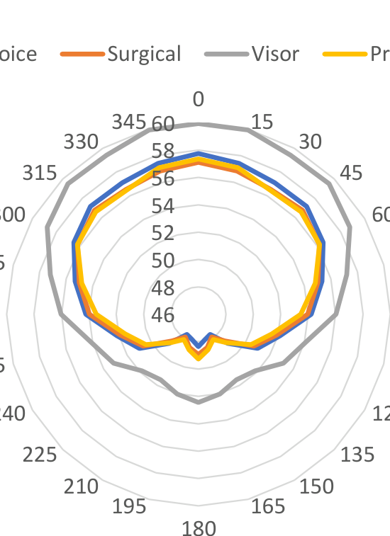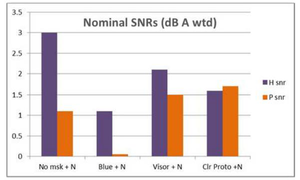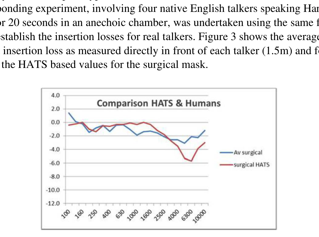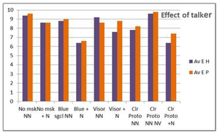 A A A Effect of facemasks on speech intelligibility R. Vazquez-Amos, J Thomas, S. Dance, H. Gohil, J. Telford, J. Green, P. Mapp School of the Built Environment and Architecture London South Bank University London, UK SE1 0AA ABSTRACT With the advent of COVID, the wearing of face covering has been obligatory in both medical and everyday life. This paper describes three experiments undertaken to establish the effect of face coverings on speech sound power, speech directivity and speech intelligibility. The experiments used two different approaches: acoustic measurements and word scores. The face coverings assessed were a ‘standard blue’ surgical mask, a typical fabric mask, a prototype clear mask and a plastic transparent visor. The study showed that non-native English speakers had by far the most difficulty in comprehending English language speech when face coverings were worn during phonetically-balanced word list tests. All the masks were found to noticeably affect speech intelligibility, with the surgical mask having the least detrimental effect. The results are also compared to objective measurements of their physical acoustic characteristics to establish their performance. 1. INTRODUCTION Legislation across the world mandated wearing of face coverings for most of the adult population to reduce the spread of COVID19. Although face masks and face shields are tested and marked in terms of their performance for particle size transmission, only limited research on their effect on speech transmission and speech intelligibility has been undertaken. Typically, this involves measuring the insertion loss, in order to gauge transmission loss and estimate source directivity on a Head and Torso simulator. Ruhale and Ruhale (3 masks) [1], Pörschmann et al (6 masks) [2] both found that masks produce attenuation above 1kHz. Corey et al (12 masks) [3] agreed that mask attenuation was significant and varied between different types of mask (1 male talker), as well as finding that speech directivity varied significantly. Magee et al tested mask attenuation (3 masks) [4], finding high frequency attenuation had no significant effect on speech intelligibility. This was based on the ASSIDS method, using 50 words and 22 sentences, based on five human talkers and five listeners using a virtual acoustic system using headphones under perfect recording and listening conditions. Bottalico et al [5] (3 masks) used electroacoustics: a HATS loudspeaker produced speech shaped sound which was binaurally convolved with the impulse response from two separate rooms (RT mid 0.4 seconds and RT mid 3.1 seconds). Forty listeners using headphones under perfect conditions with +3dB SNR listened to eight lists of 50 CNC words. Findings were high frequency mask attenuation, > 2 kHz, overall attenuation was least for surgical mask, 2.3 dB attenuation, 12% reduction in speech intelligibility; and highest for N95 mask, 4.2 dB attenuation resulting in 13% reduction in SI. Mapp [6] (20 masks) used a HATS loudspeaker to test masks, RT mid 0. 3 seconds, in terms of sound attenuation he typically measured 3-5 dB at the key communication frequency of 4 kHz whereas heavier/stiffer medical grade masks produced 9-12 dB, and a visor produced a 12 dB gain around 1 kHz before rolling off at higher frequencies. He also showed a significant attenuation effect of wearing a medical mask with a visor, 14 dB at 4 kHz. SI tests were undertaken in a room RT mid 0.5 seconds at a socially distant 2m. STIPA (60 dBA signal) was measured to be 0.75 with an ambient noise level of 23 dBA and 0.54 at 54 dBA (NR50) without a mask. The average STIPA of the 19 conditions tested under quiet conditions was 0.71 (worst case 0.65), under the noisy condition 0.45 (worst case 0.40). Mapp speculated that a STIPA of 0.66 was needed for quality communication of complex information such as medical advice. He suggested that hearing impairment would reduce communication in a hospital setting to unintelligible due to the lack of visual cues. He also showed the effect of mask wearing on speech perceived by hearing impaired listeners and the associated loss of consonant sounds [7]. Bannwart et al [8] suggested 20% increase in speech intelligibility was likely due to lip reading. In summary, facemasks act as a low pass filter and as such would significantly affect speech intelligibility where the primary intelligibility components are in the higher frequencies at 1 kHz and above. 2. HYPOTHESIS Tens of billions of face masks have been manufactured over the past two years with little research into their real effect on communication. The key difference between the described and previous work is that the airflow from breathing, necessary in speech production, is not replicated by a Head and Torso Simulator. In addition, communication is more difficult for people not communicating in their first language. This paper addresses these shortcomings by testing common face masks/visors under realistic conditions, simulated in laboratory settings, see Figure 1, to establish the real effect of face masks on speech intelligibility, speech directivity, and speech level and compare them to HATS based results. These experiments only became possible in October 2021 with the reduction in COVID19 restrictions in the UK. Figure 1- Native speaker and HATS wearing Surgical, Visor and Prototype Mask 3. MEASURED INSERTION LOSS (Real and Simulated) A head and torso simulator was used to measure the insertion loss of a blue surgical mask and a prototype transparent mask. The measurements were undertaken in a listening room, RT mid =0.3s, using a calibrated pink noise signal to simulate speech transmission. Insertion losses are given in Figure 2. Figure 2 - HATS comparison of insertion loss of blue surgical mask (red) and a prototype mask (blue) Figure 2 shows the 1/3 octave band insertion losses of two masks using a Head and Torso simulator. These results were similar to already published data on s