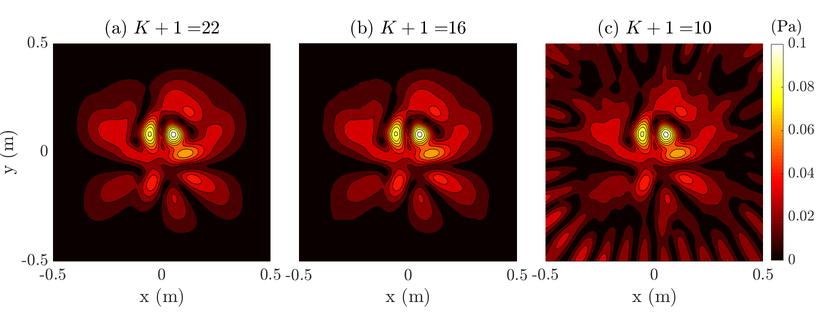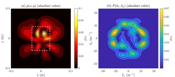 A A A Acousto-optic sensing for near-field acoustic holography Samuel A. Verburg 1 Acoustic Technology group, Dept. of Electrical and Photonics Engineering, Technical University of Denmark Ørsteds Plads, building 352, 2800 Kongens Lyngby, Denmark Efren Fernandez-Grande 2 Acoustic Technology group, Dept. of Electrical and Photonics Engineering, Technical University of Denmark Ørsteds Plads, building 352, 2800 Kongens Lyngby, Denmark Earl G. Williams United States Naval Research Laboratory, Code 7106 Washington, DC 20375, USA ABSTRACT Near-field acoustic holography (NAH) is a very powerful and widely used technique for the study of complex acoustic radiators. NAH enables to quickly understand how a complex source radiates into the medium. The technique is particularly suitable at low frequencies. At high frequencies, a dense transducer interspacing is required, and the measurement microphones can disturb the studied sound field when their size is comparable to the acoustic wavelength. In this study we examine the use of acousto-optic sensing in NAH. Acousto-optic sensing uses light beams as the sensing element, making it possible to acquire remote and non-invasive measurements without introducing extraneous objects in the vicinity of the source. The pressure, particle velocity and intensity fields, as well as the sound power radiated by a complex source, are determined from measurements in the near-field with an optical interferometer. The presented results demonstrate the potential of optical sensing to non-intrusively characterize sound fields, particularly at high frequencies. 1. INTRODUCTION Near-field acoustic holography (NAH) is a powerful technique for studying and characterizing acoustic radiation from complex sources. Acoustic holography is of great relevance in many areas of acoustic research such as noise source identification, the study of sound radiation, or the characterization of vibrating structures and musical instruments. [1–4] In NAH, the sound pressure near the studied source is sampled over a surface using an array of transducers. The wavenumber spectrum is then calculated from the measured pressure, which makes 1 saveri@elektro.dtu.dk 2 efg@elektro.dtu.dk a slaty. inter.noise 21-24 AUGUST SCOTTISH EVENT CAMPUS O ¥, ? GLASGOW it possible to estimate the acoustic field over the entire 3D domain (not only on the measured surface) by propagating and back-propagating the wave components that conform the sound field. In order to estimate the wavenumber spectrum, the spatial sampling performed by the array must be dense enough to capture the highest spatial frequency present in the sound field. Central to NAH is the measurement of evanescent waves. Capturing evanescent components enables to reconstruct sources with a very fine spatial resolution and resolve features that are smaller than the acoustic wavelength (e.g., two point sources separated by a small distance, or circulatory energy flows below coincidence). Evanescent waves correspond to high spatial frequencies—with trace wavelengths that are shorter than the acoustic wavelength in the fluid medium. Therefore, a spatial sampling finer than the common ‘sensor spacing of half a wavelength’ rule is required to sample evanescent components while avoiding spatial aliasing. [5,6] In general, sampling sound fields at mid and high frequencies requires the use of dense arrays, which can be problematic. Dense arrays with a small transducer inter-spacing introduce scattering and di ff raction e ff ects that cannot be neglected (i.e., they are not acoustically transparent), e ff ectively biasing the measurements. The disturbance introduced by the array elements is particularly visible when the wavelength or the distance between transducers is comparable to the transducer size. Acousto-optic sensing is an alternative to conventional microphone arrays. The acousto-optic interaction describes the e ff ects that light experiences as it travels through an acoustic field. In acousto-optic sensing light is the sensing element, thus the measurements are non-invasive —in contrast to typical electro-mechanical transducers. Non-invasiveness is particularly relevant for problems where a dense spatial sampling is required, such as NAH at high frequencies. Unlike conventional transducers, acousto-optic sensing does not provide the pressure at specific locations but values of the pressure integrated over light beams (as in x-ray tomography). Hence, a tomographic reconstruction of the measured data is required in order to recover the pressure field. [7] Acousto-optic tomography has shown potential as a method for capturing the sound pressure in the near field of acoustic sources. [8, 9] In this study, we investigate sampling requirements for the tomographic acquisition and reconstruction of pressure fields. 2. BACKGROUND ON ACOUSTO-OPTIC SENSING Acousto-optic sensing methods based on laser interferometry have drawn significant attention in recent years. [7–13] A laser beam traversing the harmonic pressure field p ( x , y , z ) e i ω t experiences the phase shift [7] Z L ∆ φ = ω ℓ ∂ n ∂ p 0 p ( x , y , z ) dl , (1) c 0 where l is an integration variable along the path of the laser beam, and L is the length of the path. The constants ω ℓ , c 0 , and ∂ n ∂ p are the frequency of the optical wave, the speed of light in vacuum, and the piezo-optic coe ffi cient in air, respectively. The time dependent term e i ω t is omitted for convenience. The phase shift described in Eq. 1 can be determined using optical interferometry. Such optical measurements are proportional to the line integral of p ( x , y , z ) along the path of a laser beam. 3. BACKGROUND ON ACOUSTIC HOLOGRAPHY Acoustic holography makes it possible to fully characterize an acoustic field over an entire 3D domain by measuring the pressure on a single plane. [5] Let us consider the pressure field p ( x , y , z ) in the half space z > 0 where no sources are p