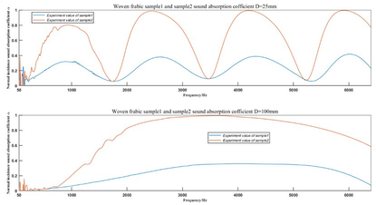 A A A Experimental study of the Sound Absorption of Nylon Woven Fabric Fang Wang 1 Zenong Cai Xianhui Li Xiaoling Gai Tuo Xing Beijing Key Lab of Environmental Noise and Vibration, Institute of urban safety and environmental science, Beijing academy of science and technology No.55, Taoranting Road, Xicheng, Beijing, 100054, China ABSTRACT Nylon is the world's earliest synthetic fiber, it has excellent performance and rich raw material re- source, so that it has been used until now. The purpose of this research is to investigate the acoustics of thin fabric. Acoustically, it can be seen as a thin layer composed of porous fibrous materials. Therefore, its sound absorption performance is the combination of at least two kinds of sound ab- sorption mechanisms. The main purpose of this paper is to study the relationship between sound absorption properties and structural parameters of thin fabric by means of experiment .The study concerning the transmission and attenuation of acoustic wave in thin fabrics is helpful for the design of thin fabric, and improving its applications in the field of noise control and indoor acoustics. 1. INTRODUCTION Noise pollution, water pollution, air pollution and solid waste pollution are known as the four major pollutions today, according to a publication called burden of disease from environmental noise was prepared by experts in working groups convened by the WHO Regional Office for Europe, noise pollution has been regarded as the second killer of human public health after air pollution. Noise has a great impact on people's hearing, cardiovascular, and mood [1] . Because of noise, work- ers are suffering from physical tiredness and slow response, work efficiency and work quality are significantly decreased, also the accident rate is higher [2] , therefore, it is necessary to take effective measures to improve the indoor sound environment. Noise absorption materials are categorized based on resonance absorption and porosity absorption. Resonant sound-absorbing materials can be equivalent to multiple Helmholtz resonance connected in parallel, in which acoustic energy is consumed by internal resonance effects. [3-4] . The resonance sound absorption materials can be divided into microporous plate, thin plate and thin membrane sound absorption material [3-5] . This kind of structure has the advantage of low frequency sound ab- sorption, but the bandwidth of octave is narrow and the machining technology is high. For the porous absorber, there are a large number of small diameter and uniform distribution of the connected porous material interior [6] . Therefore, foams and fibers with internal pores and composites can be regarded as porous materials sound-absorbing materials. It has good sound absorption properties in the high frequency range, and the absorption coefficient in the low frequency range is very weak [6] . The 1 m 1398961676 @163.com inter.noise 21-24 AUGUST SCOTTISH EVENT CAMPUS. ? O? ? GLASGOW production of porous absorption materials is low cost, and the application range is expanding gradu- ally. Textile-based materials are usually classified as porous sound absorbing materials [7] . Depending on the thickness of the fibrous porous material, fiber materials are two forms: blocky and thin layer. The thickness of the block fiber materials is close to the acoustic wavelength like foam, while the thickness of the thin material is much smaller than the acoustic wavelength like woven or non-woven fabric. From the analysis of the sound absorption principle, it can be found that thin fabric is not only a porous sound absorbing material but also can be designed as a resonant sound absorbing material. In contrast to non-woven fabrics, the original structure in the woven fabric can realize the artificial design of noise control of the fabric. Fabric can not only play a role in sound absorption and noise reduction, which also can decorate the indoor environment, beautify the visual sense. In this study, in order to optimize the sound ab- sorption coefficient and make the fabric smoother and softer, the light-transmitting woven fabric with twill weave structure made of polyamide fiber (commonly known as nylon) was selected, the sound absorption properties were studied by experiments. 2. METHODOLOGY This is an experimental study. The theoretical basis of the experiment is introduced to obtain the sound absorption coefficient of the material. It is a fast and economical method to measure the sound absorption coefficient of materials by using double-microphone in impedance tube with vertical in- cidence. By solving the acoustic transfer function between the two microphones, the incident wave and the reflected wave can be separated effectively, and the normal acoustic impedance of the test sample can be calculated, the structure of the fabric with a back cavity is placed in the impedance tube as shown in Figure 1. inter.noise 21-24 AUGUST SCOTTISH EVENT CAMPUS. ? O? ? GLASGOW Figure 1: Schematic diagram of sound propagation in an impedance tube The tested woven fabric material is located at the right end, the distance from the rigid back plate is D. The reflection coefficient r p is obtained by measuring the transfer function H i of the incident wave, the transfer function H r of the reflected wave and the transfer function H 12 of the total sound field between two microphone positions, then the normal sound absorption coefficient and normal acoustic impedance are calculated. The sound pressures p 1 and p 2 at the positions of the two microphones in positions 1 and 2 are expressed by the incident sound pressure p i and the reflected sound pressure p r respectively, as in E quation1. ( ) ( ) ( ) ( ) 1 1 2 2 1 i r 2 i r e e , e e i t kx i t kx i t kx i t kx p p p p p p ω ω ω ω − + − + = + = + , (1) The transfer function of the incident wave H i is expressed as: ( ) x ik x x ik p p H − − − = = = e e 1 2 i 2 i , (2) i1 2 1 x x x = − is the distance between