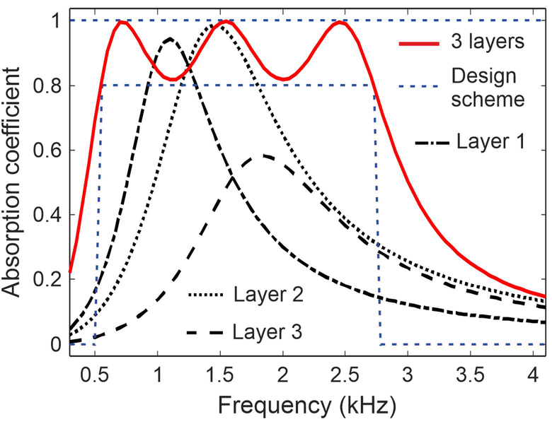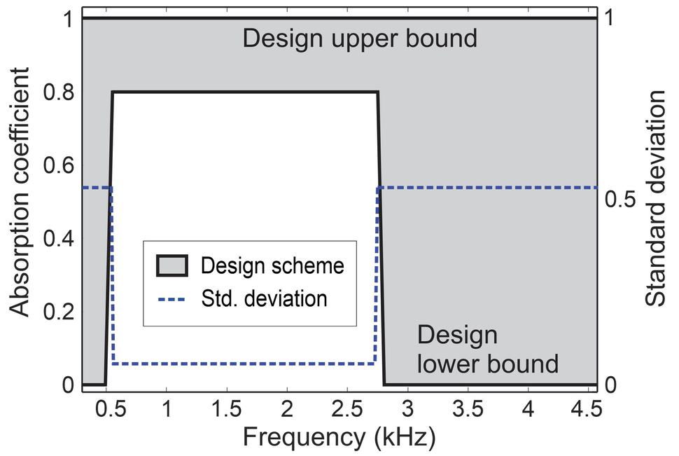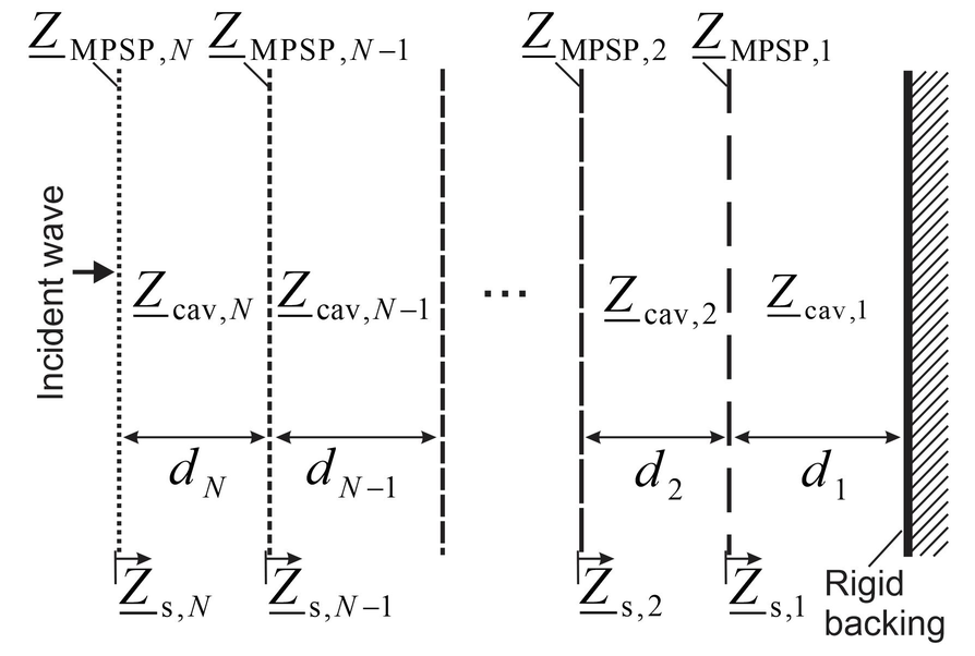 A A A Design and validation of microperforated panel absorbers using Occam’s razor and causal inference Ning Xiang 1 , Michael Hoeft, and Cameron J. Fackler Graduate Program in Architectural Acoustics, Rensselaer Polytechnic Institute 110 8th Street, Troy, New York 12180, USA ABSTRACT Microperforated panel absorbers in forms of micro-pores / -slits (MPSP) can achieve high absorption. However, noise control practice usually requires broadband high absorption. Single- or double-layer MPSP absorbers often cannot meet practical requirements. Multilayers become a natural option. Multiple layers of MPSP absorbers inherently complicates the design process upon a given design scheme. This work applies a Bayesian framework using a potentially multilayered prediction model. The Bayesian design involves two-levels of probabilistic inference to design a parsimonious number of layers using the model-selection solution, a quantitative implementation of Occam’s razor, while the parameter estimation is used to estimate MPSP parameters given the selected number of multilayers. This probabilistic design process rapidly hones in on the MPSP parameters of each individual layer so that the overall composite meets the design goal. When experimentally validating the designed prediction upon the design scheme, manufacturing inaccuracies may lead to deviations. In analyzing reasons of the deviations, this work further applies causal inference to analyze the cause-e ff ect relationship. To this end a causal model has also been established. Using both parametric prediction model for the absorption performance and the causal model for causal inference of the deviation causes, the Bayesian multilayer design can be satisfactorily validated. 1. INTRODUCTION Micro-perforated and micro-slit (MPSP) panel sound absorbers are made of sub-millimeter pores / slits penetrating through panel surfaces. They are widely applied in a range of acoustic research and practice [1, 2]. Single-layer configurations of MPSP often yield high absorption over a very limited frequency range [3]. By extension, multiple individual MPSP layers may be combined into a multi-layer configuration to obtain broadband, high sound absorption. The MPSP absorbers can also be manufactured using transparent materials. For the transparent sound absorbers, microslits panels (MSP) will overperform over the micrpore panels (MPP) to retain desirable transparancy / translucency. When designing these transparent multilayer MPSP absorbers, the design process needs to consider both sound absorption requirements and optical transparency. This work evaluates an approach to design and constructs this type of multilayer MPSP sound absorbers. This work focuses on design process, which is an inversion process from the design requirements to 1 xiangn@rpi.edu a slaty. inter.noise 21-24 AUGUST SCOTTISH EVENT CAMPUS O ¥, ? GLASGOW the selection of a suitable number of multi-layered MPSP absorbers, followed by the estimation of MPSP parameters of each individual layers. This design applies Bayesian inference to quantitatively implement Occam’s razor to penalise overlayered configurations. When experimentally validating the Bayesian design, it may be challenging to determine what parameters of which layers contribute to undesirable deviations from the design scheme leading to an absorber that does not meet the initial design requirements. For the first time, this work applies causal inference to tackle this challenge. 2. MICRO-PERFORATED / SLIT PANELS IN MULTILAYERS We first introduce prediction models for single-layer microperforated panel (MPP) absorbers based on Maa’s work [3,4], followed by configuring multiple layers in a predictable manner. According to Daa-You Maa, air is swung back-and-forth in these sub-millimeter tubes, as an impinging sound wave moves air around the panel surface. The air mass inside the microtubes encounters viscous frictions at perforated microtube walls / boundaries, exhibiting acoustic resistance. Atalla and Sgard [5] published a prediction model for the acoustic behaviors of an MPP, having a similar prediction ability to Maa’s model [3]. They treated the MPP panel by a modified Johnson-Allard rigid frame porous model. The model considers the viscous boundary-layer e ff ect of the micro-pores into account. Their model predicts the panel impedance using three parameters as well, the perforation rate σ , the diameter of the micro-pores d , and panel thickness t , Z MPP = t + 2 ϵ e " (1 + j) 4 R s d + j ωρ # , (1) σ ϵ e = 0 . 425 d (1 − 1 . 14 √ σ ) , and R s = p η ωρ/ 2 (2) are the correction length ϵ e and the surface resistance R s with ω being the angular frequency, j = √ − 1. The air surrounding the panel and filling the micro-pores has density ρ and dynamic viscosity η . In 2001, Maa [4] derived micro-slit panels (MSP), treating each microslit as an infinite number of ‘micro-tubes’ arranged along a line. For normal incidence sound waves, this prediction model for acoustic impedance of the MSP panel is given by √ ! 1 / 2 + j ω t 1 + k 2 0 12 Z MS P = 12 η t σ ρ c d 2 " 1 + (5 2 + 2 k 2 0 ) − 1 / 2 + F ( e ) d # , (3) 2 k 0 d 12 t σ c 2 t where c is the sound speed in air, and ρ the density of air, ω is the angular frequency, t is the panel thickness, σ is the porosity (or perforation rate), and d is the diameter / width of the slits. The elliptical integral F ( e ), and the perforate constant k 0 as given below in Eqs. (4,5) are also needed to predict the acoustic impedance of an MSP ! 2 e 2 + 1 · 3 ! 2 e 4 + 1 · 3 · 5 ! 2 e 6 + . . . , (4) 1 + 1 F ( e ) = π 2 · 4 2 · 4 · 6 2 2 ω ρ/η, and e = p k 0 = p 1 − ( a / ld ) 2 , (5) with a = d / 2 being the slit ’radius’, and l being half the length of the slit. The resulting surface impedance, Z s consists of the acoustic impedance of the panel and the acoustic impedance of the air cavity between the MSP and a hard termination [6], namel