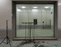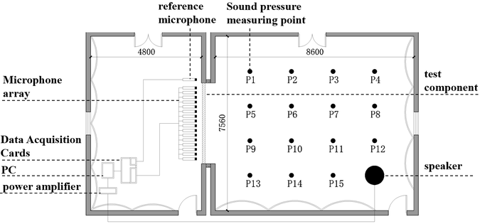 A A A Measurement of airborne sound insulation of building components by near-field acoustic holography Wei Xiong 1 School of Architecture, South China University of Technology 381 Wushan Road, Tianhe District, Guangzhou City, Guangdong Province, China Hongwei Wang 2 School of Architecture, South China University of Technology 381 Wushan Road, Tianhe District, Guangzhou City, Guangdong Province, China Guangyao Zhang 3 School of Architecture, South China University of Technology 381 Wushan Road, Tianhe District, Guangzhou City, Guangdong Province, China ABSTRACT A new method of sound insulation measurement of building components based on near-field acoustic holography is proposed in the paper. First, multi-channel measurements are performed at the near- field position of the member using a microphone array, and the measured holographic surface complex sound pressure is reconstructed by a spatial sound field transformation algorithm to find the normal sound intensity distribution on the surface of the member. Then, a window function is applied in the wave number domain to separate the propagating and swift waves to obtain the normal sound intensity distribution of the propagating waves on the surface of the component, and then calculate the magnitude of the sound power radiated from the component to the receiving room; finally, the radiated sound power of the component is converted to the incident sound power of the source room to obtain the frequency characteristics of the airborne sound insulation of the component, and the sound insulation defects of the component are detected based on the acoustic image. The basic principle of the near-field acoustic holographic sound insulation measurement method is explained in the paper, and the accuracy and validity of the method are verified through experiments. 1. INTRODUCTION Airborne sound insulation is an important parameter that reflects the ability and characteristics of building components to isolate noise transmission. Accurate field measurement of airborne sound insulation can be more scientifically, reasonably and intuitively evaluated for the actual application of the components, which is of great importance in noise control and acoustic design. The current widely used sound insulation measurement methods, such as those based on sound pressure 1 973136186@qq.com 2 578084450@qq.com 3 545666085@qq.com measurement and sound intensity measurement, have been relatively mature and have formed relevant measurement standards [1-3]. However, the application of traditional sound insulation measurement methods in practical engineering is still subject to many limitations due to the complexity of sound radiation from on-site structural vibration, the instability of the test environment, and the increasing test requirements. How to quickly and accurately measure sound insulation in the field has been a hot issue for research in the field of building acoustics. Near-field acoustic holography (NAH) is one of the sound field visualization techniques based on multichannel simultaneous measurement and processing, which can calculate acoustic quantities at arbitrary field points throughout space from holographic data (sound pressure or particle velocity) measured in the near field, as well as reconstruct the sound field distribution on the surface of the vibrating source [4-5]. Currently, the NAH technique has been widely used in the fields of noise source identification [6-7], mechanical fault diagnosis [8-9], and sound field visualization [10-11], but it has rarely been applied in the sound insulation measurement of building components. In recent years, some scholars have initially explored the feasibility of applying NAH technology to sound insulation measurements through experimental studies, and certain results have been achieved [12- 13]. According to the principle of sound insulation testing, the test member is excited by the diffuse sound field in the source chamber and vibrates, and then radiates sound energy to the receiving chamber and forms the corresponding sound field distribution in space. If the complex sound pressure distribution is measured in the near field of the component, and then the spatial sound field transformation algorithm of NAH is applied to the reconstruction of the radiated sound field of the component, then not only the magnitude of the sound power radiated to the receiving chamber by the component can be calculated from the reconstructed normal sound intensity, but also the comprehensive and subtle features related to sound leakage can be extracted from the acoustic image of the surface of the component, so that the sound insulation frequency characteristics and the location of sound insulation defects of the test component can be determined In addition, the NAH technique has the advantage of being multi-functional. In addition, NAH technology also has the advantages of multi-channel measurement, background noise suppression and sound field visualization. According to the above characteristics, NAH technology has a large application prospect in the field measurement of sound insulation. Therefore, it is necessary to conduct an in-depth study of this sound insulation test method. This study proposes the application of NAH technique to measure the sound insulation characteristics of building components. Its main contributions are the application of the spatial sound field transformation algorithm of NAH to the reconstruction of radiated sound power in sound insulation measurement and the application of the spatial distribution information of the sound field to the detection of sound insulation defects, and a new method of airborne sound insulation measurement of building components based on NAH theory is systematically proposed. In this study, a 16-channel microphone line array is used to experimentally validate the method for measuring sound insulation and detecting sound insulation defects. 2. NAH-BASED SOUND INSULATION ME
