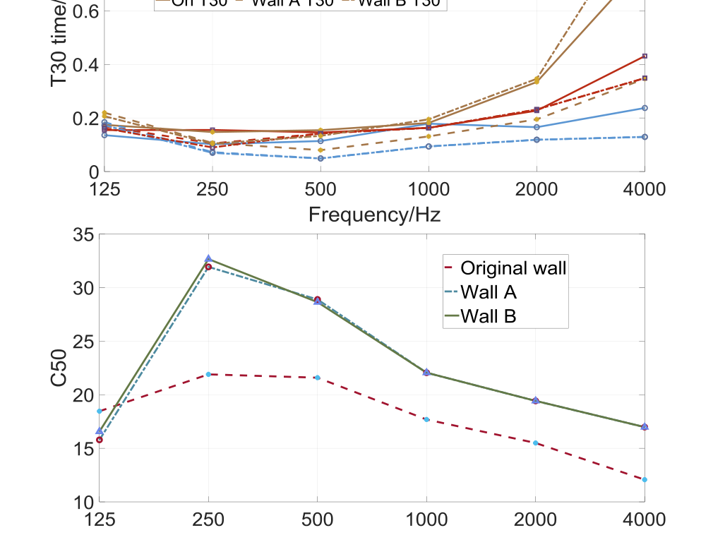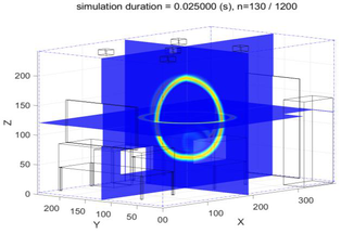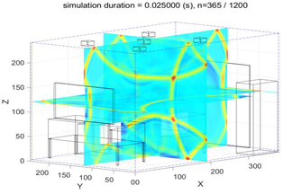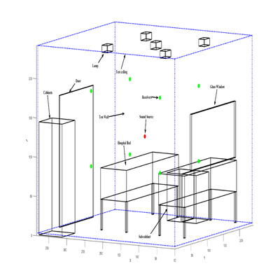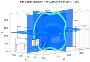 A A A FDTD-Based Simulation and Analysis of Noise Reduction Effects in Hospital Wards Yiquan Xu 1 , Hequn Min 2 Key Laboratory of Urban and Architectural Heritage Conservation, Ministry of Education, School of Architecture, Southeast University, 2 Sipailou, Nanjing 210096, China ABSTRACT The impact of domestic hospital acoustic environment on the health of patients and healthcare workers is attracting more and more attention from all walks of life. In this paper, we investigated and analyzed the noise situation of typical double person wards in the hospital based on the finite difference time domain method (FDTD), and designed two noise reduction schemes according to common noise sources occurring in the hospital twin room. Sound fields in double wards were numerically simulated before and after noise reduction scheme treatments applied, for evaluation on noise reduction effects from two schemes. Results show that, the FDTD method can be used to effectively model sound fields in hospital wards with complex boundary conditions like surfaces and shapes of standard indoor facilities; meanwhile, the proposed noise mitigation treatments have significant effects on improvement of reverberation time and speech intelligibility in wards. 1. INTRODUCTION Since the end of last century, more and more researchers have gradually started to pay attention to the acoustic environment in medical settings, especially negative effects of adverse acoustic environments on health care workers and patients [1]. Noise can affect both human physiological and psychological health [2], and studies have shown that long-term exposure to a noisy environment can hamper wound healing after surgery [3] and prolong hospitalization [4] and that substantial amounts of noise can also impede voice communication and interfere between the work of health care [5]. As the finite-difference time-domain (FDTD) method can directly solve fluctuation equations for indoor acoustic environments with complex boundary conditions and produce consistent calculation results with accuracy over a wide range of frequency bands, in this paper, we will use the FDTD method to simulate sound fields and conduct noise reduction treatments in hospital wards in actual situations. 2. Theory on FDTD-based sound field modeling The mathematical basis of the FDTD method is Maxwell ’ s equations [6], which discretize fluctuation equations in the time domain and step through calculations to obtain the time-domain signal waveform at points in space. The FDTD method was first applied to acoustic modeling in the late nineties [7] and can now satisfy sound field simulation calculations under different boundary conditions [9]. Based on Bilbao ’ s study, Hamilton detailed discussed [10] the application of FDTD 1 yqxu0919@126.com 2 hqmin@seu.edu.cn modeling in indoor acoustics for different environments. In this paper, modeling and simulation based on the work of Hamilton [10] and focusing on the recognition and calculation of boundaries of models, further discusses the modeling approach in complex interior environments. And in this project, many objects needed to be added to model to simulate the real hospital environment. It is feasible to process each item once in the program in simple model testing because the workload is not significant. However, when the model becomes more complex like the real room inside, it would lead to tedious work, and a higher risk of errors would affect the simulation effect and experimental results. Therefore, we optimized the construction part of the model through an automated process as shown in Figure 1 and further details will be discussed later. Figure 1: Pre-processing of Obstacle Boundary Identification in the Model. 2.1. FDTD Method The numerical simulation starts with the acoustic wave propagation, describes the transmission behavior of an ideal sound in the medium using the PDE equation, and approximates the numerical solution of the PDE equation using the FDTD method, where time and space domains within the acoustic model are uniformly discretized and distributed over grid points in a Cartesian coordinate system. In the discrete system, the sound pressure is calculated for each point and the continuous fluctuation equation is transformed into the DPDE equation [9], applying FDTD operators to obtain: 1 2 𝑝−∆𝑝= 0 , (1) 𝑐 2 𝜕 𝑡 Model design Object process Build model ‘Add object information Process and caleulate the index of the object in the model, and check the relationship between the object and the boundary Not _‘botertnn whether objec? attached [Set up ghost nodes of 𝑛+1 = 𝜆 2 𝑄 𝑙,𝑚,𝑞 𝑛−1 , (2) 𝑛 + (2 −6𝜆 2 )𝑝 𝑙,𝑚,𝑞 𝑛 −𝑝 𝑙,𝑚,𝑞 𝑝 𝑙,𝑚,𝑞 Where: 𝑛 = 𝑝 𝑙+1,𝑚,𝑞 𝑛 + 𝑝 𝑙−1,𝑚,𝑞 𝑛 + 𝑝 𝑙,𝑚+1,𝑞 𝑛 + 𝑝 𝑙,𝑚−1,𝑞 𝑛 + 𝑝 𝑙,𝑚,𝑞+1 𝑛 + 𝑝 𝑙,𝑚,𝑞−1 𝑄 𝑙,𝑚,𝑞 𝑛 , (3) 𝜆= 𝑐𝑇 ℎ (4) q m l refers to sound Here c is the sound velocity and ) , , , ( , , T n t h q z h m y h l x p n pressure elements in discrete system, R h is the space between grid points of discrete system and s F T 1 ). q m l , , are space indexes in different T is the time step of system ( sampling frequency directions, and n is the index in time, and Z n q m l , , , . And is a dimensionless constant called Courant number, which means that at each time step, the sound wave will be further propagate through the grid unit. Furthermore, it will be limited by stability considerations. 2.2. Boundary Elements Marking Method for Acoustic Models Boundaries in the model are set to be locally responsive, the normal component of the velocity of point on boundary surface is only related to the preceding sound pressure element, and neighboring elements are not affected. The boundary condition processes in this paper are based on the study of sound pressure elements on the boundary in