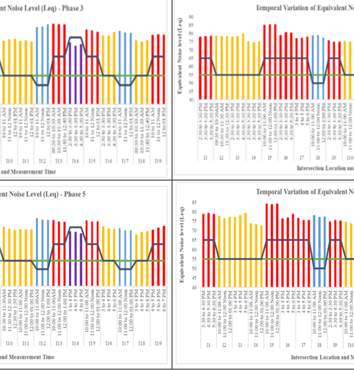 A A A Analysis of Spatial and Temporal Variation of Noise Level at Intersections of a Mid-Sized City in India Adarsh Yadav 1 Department of Civil Engineering, Indian Institute of Technology Roorkee Roorkee, Uttarakhand, India, 247667 Manoranjan Parida 2 Department of Civil Engineering, Indian Institute of Technology Roorkee Roorkee, Uttarakhand, India, 247667 Brind Kumar 3 Department of Civil Engineering, Indian Institute of Technology (BHU) Varanasi Varanasi, Uttar Pradesh, India, 221005 ABSTRACT This study aims to determine spatial and temporal noise variation and acoustical climate at intersections. Data monitoring comprises measurement of peak and off-peak hour variation at 19 intersections between February 2020 to September 2021 in Kanpur, India. Kanpur was proposed as a smart city in 2015 under National Smart Cities Mission. This work has been part of a National Level Project “IMPRINT” to document ambient noise levels for a Tier 2 city with highly heterogeneous traffic. Spatial variation of noise is larger (>15 dBA) than temporal variation (<5 dBA). Noise variations are primarily influenced by traffic flow, geometric characteristics, classified volume, and honking events. Frequent stoppage of vehicles for boarding and alighting of passengers also significantly affect noise levels. Noise risk zones are identified based on noise levels alongside intersections. Zones are classified as safe (<66 dBA), tolerable (66-71 dBA), low risk (71-76 dBA), moderate risk (76-81 dBA), high risk (81-86 dBA), and extremely high risk (>86 dBA) zones. Noise level crosses tolerable limit at most study locations, and some locations fall in high-risk zones. The study has highlighted the influence of different parameters on spatial and temporal noise variation at intersections and remedial action plans for traffic noise abatement. 1. INTRODUCTION The population shift towards urban cities has increased rapidly in the past few decades. A recent United Nations report estimates that 55% of total world population are urban dwellers and projects that by 2050 the urban population will increase to 68% (United Nations, 2019). Urbanisation demands growth in the road transport sector (Maparu and Mazumder, 2021). Environmental pollution (i.e., air, noise etc.) is a byproduct of road transport and urbanisation. Noise pollution has emerged as a serious threat in the vicinity of road networks and ranked 2nd most environmental stressor and threat in urban cities. Traffic noise exposure may lead to various health-related issues such as stress, annoyance, headache, hearing damage, high blood pressure, and myocardial 1 ayadav4@ce.iitr.ac.in 2 m.parida@ce.iitr.ac.in 3 kumar_brind.civ@iitbhu.ac.in infarction (Fyhri and Klæboe, 2009; Gilani and Mir, 2021; Yoshida et al., 1997). Central pollution control board (CPCB), New Delhi, prescribed day and night ambient sound levels for silence, residential, commercial, and industrial land uses are 50, 55, 65 and 75 dBA (Ministry of Environment and forest, 2000). The world health organisation (WHO) has advised that exposure to noise levels above 55 dBA is not acceptable (WHO, 2018). Road transport contributes more than 66% to urban noise pollution (Thakre et al., 2020). 73% of Brazilians in Curitiba city have reported traffic noise as the leading cause of annoyance (Calixto et al., 2003). Traffic noise is emitted from different sub-sources of the vehicle, which is further grouped in power unit noise (engine, fan, exhaust, and transmission, etc.), aerodynamic (related to turbulent airflow around the vehicle), and tire/pavement interaction noise. Pavement influence was significant, and reasphalting improved the noise level from 3 to 8 dBA (Sánchez-Sánchez et al., 2018). Traffic noise is majorly influenced by traffic characteristics along with road characteristics, infrastructure characteristics and meteorological parameters (Ibili et al., 2021). Garg et al. (2017) measured the noise level at 35 locations in different land-use of 7 megacities from 2011-2014 under the National Ambient Noise Monitoring Network (NANMN). Traffic parameters were dominant parameters, and a higher noise level was reported commercial zone. Mishra et al. (2021) have considered the covid-19 lockdown effect on the noise level variation. An adequate reduction in the noise level is reported during the lockdown period. The commercial zone was identified as the noisiest location among the different land uses during and post covid lockdown periods. The daytime noise level is recorded as higher than the nighttime noise level. Mishra et al. (2010) measured the noise level alongside the bus rapid transit systems (BRTS) in Delhi. Ozer et al. (2014) monitored the noise level variation in a college campus. The study identifies road traffic and bus movement as significant contributors to traffic noise pollution. Dense and good plantation may reduce the noise level by 10-15 dBA alongside the roadway. Traffic noise varies spatially and temporally even within the city due to variations in traffic parameters. Since traffic parameters and infrastructure constructs vary in the different land uses. Also, traffic parameters change with the change in time. Therefore, the current study aims to analyse the temporal and spatial variation of noise. 2. SITE SELECTION AND DATA COLLECTION For the present study, sites were selected in Kanpur city of India. Kanpur is known as the industrial capital of Uttar Pradesh province and is listed as a smart city under the National Smart City Mission of the Government of India. 19 intersections were identified and further grouped into 4 categories such as commercial, residential, silent and industrial zones. The land wise details of these locations are presented with their location ID in the following table 1. Table 1: Details of study locations Location name Location ID Land use Bada Chauraha I1 Commercial Gaushala Chauraha I2 Residential Shastri Chowk I3 Residential Dabauli Chauraha I4 Residential T