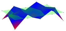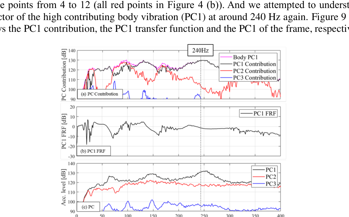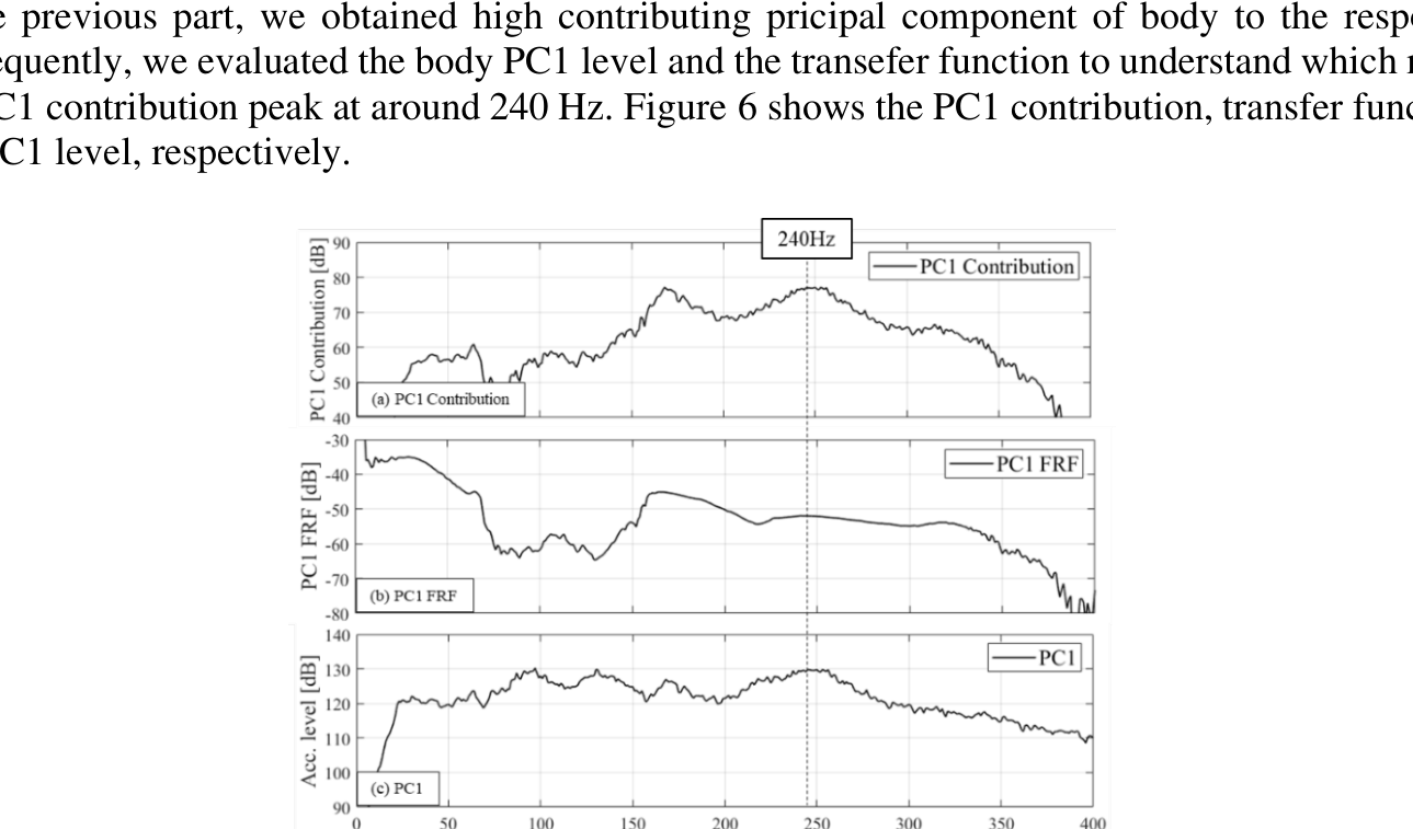 A A A Appropriate usage of multi-layered OTPA to identify intensive meas- uring part among sequential parts Ryusei Yanagita 1 Junji Yoshida 1 Osaka Institute of Technology 5-16-1 Omiya, Asahi-ku, Osaka-city, Osaka, 535-8585, Japan ABSTRACT Conducting effective countermeasure to the vehicle interior noise is important for compatible with the other vehicle performances such as light weight. Operational transfer path analysis (OTPA) was proposed to identify high contributing parts (OTPA reference model) and vibration behaviors (OTPA principal component model) to the interior noise with small man-hours. By using this method, we can determine which parts should be measured intensively. In case we apply the method to a vehicle body panel, the method tells us suitable measuring part of the body panel at the target frequency band. However, if the body panel is excited by a forced vibration from the suspension, we had better to apply countermeasure to the suspension. Then in this study, we applied the OTPA several times to identify which sequential parts from frame, body to interior noise makes the large noise using a sim- ple plate model. In the analysis, both OTPA models (reference model and principal component model) were applied at various part and considered appropriate procedure of OTPA to obtain useful infor- mation for finding out the modification target part accurately. Through the verification test, the ef- fectiveness of the proposed procedure was confirmed. 1. INTRODUCTION Conducting effective countermeasure to vehicle interior noise is important for compatible with the other vehicle performance such as light weight. Then, operational transfer path analysis (OTPA) has been proposed to identify high contributing parts to the interior noise. In the original OTPA (OTPA reference model) was developed to identify high contributing points such as engine mount attachment points 1, 4-8 . In addition, OTPA principal component (PC) model was recently proposed to obtain high contributing vibration behaviors such as body panels to know important vibration mode of the target structure 2 . Through these methods, we can understand which parts and vibration behaviors should be measured intensively. Furthermore, for estimating the high contributing part in complex system such as frame, body and cabin in vehicle, repeating OTPA procedure sequentially was demonstrated 8 . However, an appropriate combination of these OTPA methods to obtain useful information has not proposed yet. Then in this study, we applied both OTPA reference and principal component models to simple plate model and considered an effective analysis procedure to determine important parts and vibration behaviors accurately for effective countermeasure. 1 junji.yoshida@oit.ac.jp worm 2022 2. OPERATIONAL TRANSFER PATH ANALYSIS (OTPA) REFERENCE AND PRINCI- PAL MODEL In OTPA, transfer function of each reference point to the response point is calculated by applying principal component regression method using only simultaneously measured reference and response signals at the operational condition as shown in Figure 1. Contribution of each reference point to the response point is obtained by multiplying each reference signal with the transfer function. Figure 1: Calculation procedure of Operational TPA. Firstly, reference and response signals are measured at the operational condition and frequency analysis is carried out to the measured signals by applying FFT repeatedly. Secondly, PC analysis is applied to the reference signal matrix [ A in ] by singular value decomposition (SVD) as shown in Equation 1. And correlated components among reference signals are extracted to obtain principal component (PC) matrix [ T ] by using matrix [ V ] as shown in Equation 2. [𝐴 in ] = [𝑈][𝑆][𝑉] 𝑇 (1) [𝑇] = [𝐴 in ][𝑉] = [𝑈][𝑆] (2) Here, [ V ] is the coefficient matrix to transpose the reference matrix [ A in ] to the PC matrix [ T ]. And regression coefficient (PC transfer function) [ B ] of each PC to the response signal to transpose the PC matrix [ T ] to the response signal matrix [ A out ] is obtained by multiple regression analysis as shown in Equations 3 and 4. [𝐴 out ] = [𝑇][𝐵] (3) [𝐵] = ([𝑇] 𝑇 [𝑇] −1 )[𝑇] 𝑇 [𝐴 out ] (4) Transfer function [ H A ] from reference signal to response signal is calculated by multiplying the coefficient matrix [ V ] with the regression coefficient [ B ] as shown in Equation 5. [𝐻 A ] = [𝑉]([𝑇] 𝑇 [𝑇] −1 )[𝑇] 𝑇 [𝐴 out ] (5) As the result, we can obtain contributions of reference and principal component to response signal by using [ H A ] and [ B ] as shown in Equations 6 and 7. [𝐴 contribution ] = [𝐴 in ][𝐻 A ] (6) [𝑇 contribution ] = [𝑇][𝐵] (7) In the principal component model, reference signals are also re-generated by multiplying PC matrix [ T ] with the inverse (transpose) matrix of unitary matrix [ V ] as shown in Equation 8. [𝐴 in ] = [𝑇][𝑉] −1 (8) The response signals obtained in Equation 8 have phase and amplitude. Hence, the vibraion behavior composing each principal component (principal component mode) can be expressed by using these information 2 . Therefore, the PC mode related to high contributing PC to the response point becomes the high contributing PC mode and the mode is the target mode for effective countermeausre to the response. 3. CONSIDERATION OF EFFECTIVE SEQUENTIAL OTPA APPLICATION Here, we consider effective procedure to find out the high contributing part among sequential system in the road noise transmission from frame, body to cabin as follows. 3.1. Stepwise Application of Reference and Principal Component Model Road noise is transmitted from tire, suspension, frame, body, and cabin in general. In this study, we focused on the frame, body and cabin characteristics as the evaluation target of OTPA application for the road noise. Here, OTPA is applied several times between body to cabin 