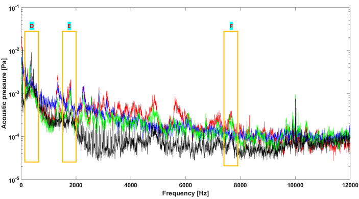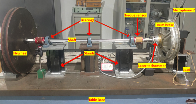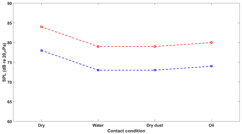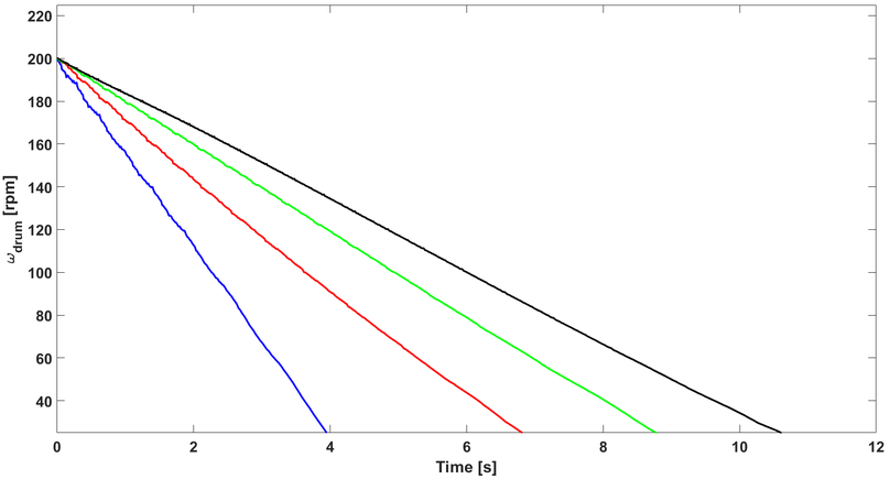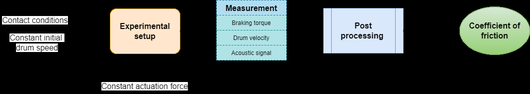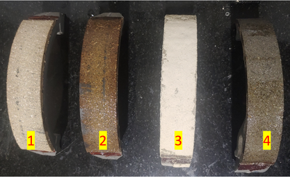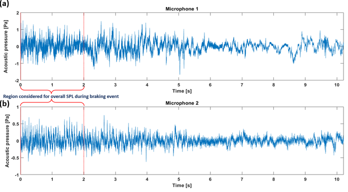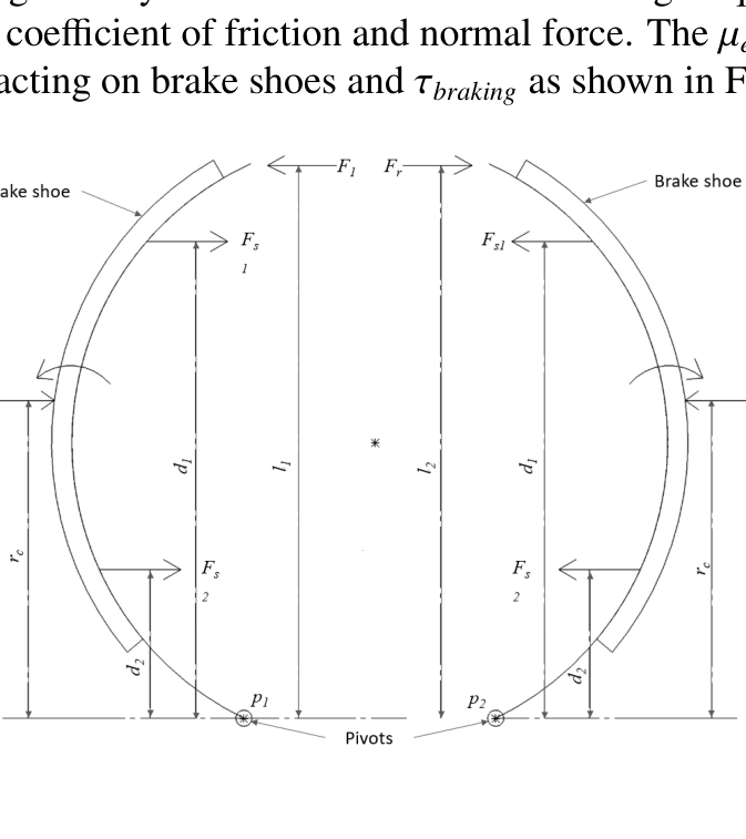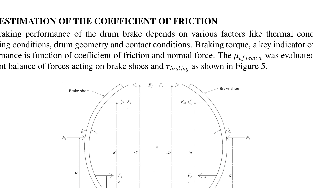A A A Measurement of vibro-acoustic noise of drum brake under various contact conditions Aditya Chaudhary 1 Indian Institute of Technology Tirupati Tirupati, Andhra Pradesh, India-517506 Akash Yella 2 Indian Institute of Technology Tirupati Tirupati, Andhra Pradesh, India-517506 Yuva Venkat Ajay, Bharinikala 3 Indian Institute of Technology Tirupati Tirupati, Andhra Pradesh, India-517506 Sriram Sundar 4 Indian Institute of Technology Tirupati Tirupati, Andhra Pradesh, India-517506 ABSTRACT Drum brakes are vital safety components, widely used in automobiles due to their greater availability and quick replaceability compared to disc brakes. Since automobiles are used in all weather conditions, the braking performance also changes accordingly. Penetration of water, oil, and dust between the brake lining and the drum directly a ff ects the contact parameters. These critical contact parameters (such as friction coe ffi cient, contact damping, and sti ff ness) in turn a ff ect the dynamic and acoustic responses of the nonlinear system. In this paper, the variation in the vibro-acoustic characteristics of a drum brake due to the presence of water, oil, and dust on the brake lining is studied experimentally by measuring the radiated acoustic signals and the system response. The braking performance under di ff erent conditions is quantified based on the system response while the acoustic behavior of the system is studied using acoustic measurements. This study would help in determining the safety of the automobile even under such abnormal braking conditions. Further, acoustic measurements can be used to assess the contact condition of the braking system. It is envisaged to develop an improved health monitoring system for drum brakes. 1 me20m001@iittp.ac.in 2 me18d506@iittp.ac.in 3 me19b008@iittp.ac.in 4 sriram@iittp.ac.in a slaty. inter.noise 21-24 AUGUST SCOTTISH EVENT CAMPUS O ¥, ? GLASGOW 1. INTRODUCTION The braking system is an essential part of an automobile for the safety of passengers and goods. Drum brakes are used in vehicles due to their high durability, economic availability, easy maintenance, and replaceability. Studies have been performed on the dynamic behavior of brakes with variations of thermal conditions [1], operating conditions [2], and friction lining material of brakes [3]. For instance, Mahmoud et al. [4] investigated variation in braking performance of disk brakes due to the contact conditions. The kinetic energy is converted to heat and sound energy in drum brakes, majorly due to friction between brake shoes and rotating drum. Drum brakes produce significant noise in automobiles, irritating to human ears. Engagement of brake shoes with wheel drum has the characteristic sound associated with contact surface conditions of drum brake, which is of interest to many. For example, Ramesh et al. [5] studied acoustic characteristics of drum brakes using a combination of analytical and numerical models, while Yella et al. [6] compared noise generated from simplex and duplex configurations of drum brakes using non-linear vibro-acoustic models. Vehicles are used in all weather (hot and dry seasons to the rainy season), and the brakes are expected to work properly under all conditions. Penetration of water, dust, or brake fluid into braking pad from the master cylinder into the gap between brake shoes and wheel drum a ff ects the performance of the brake resulting in abnormal braking of vehicle. This work aims to experimentally investigate the braking performance of a drum brake with variation of contact conditions (presence of water, dry dust, and oil) by estimating the e ff ective coe ffi cient of friction ( µ e f fective ). The e ff ect of contact conditions on acoustic behaviour during braking is also discussed. 2. METHODOLOGY The methodology adopted in this work is schematically shown as a flowchart in Figure 1. The experimental setup (described in section 2.1) is used to perform experiment on drum brake with varying contact conditions. Braking torque ( τ braking ), drum velocity ( ω drum ), and acoustic pressure are measured for each experimental run at same operating conditions (initial ω drum and actuation force). These measurements are used to study braking performance of drum brake and estimation of µ e f fective between drum and shoes, and the results are discussed in section 3. Figure 1: Methodology of the work 2.1. EXPERIMENTAL SETUP A sub-scaled experiment was developed to imitate two-wheeler drum brakes, as shown in Figure 2. The experiment consists of a drum brake on one end of the shaft and a flywheel is mounted on other end. The shaft is supported by four stands with ball bearings for shaft rotation and fifth stand supports backing plate of drum brake. Keys are used to lock the flywheel, wheel drum to the shaft, and the backing plate to fifth stand (ground). An electric motor (not shown in the figure) was used to provide initial angular velocity to flywheel. Brake shoes mounted on the backing plate were actuated using a mechanical cam which was controlled by a lever. The lever was attached with dead weight to provide constant load during braking. Load applied on the lever forces cam to rotate which pushes both brake shoes towards the rotating drum. After removal of applied load, the shoes were pulled back to initial position by retaining springs. Figure 2: Drum brake experimental setup The laser tachometer [Model: EILas2 Make: VISPIRON ROTEC] was used to capture angular velocity of the drum. The telemetry type torque sensor [Make: manner sensor telimetric] was mounted on shaft for determining τ braking . These sensors were connected to 6 - channel torsional vibrator recorder / analyzer [Model: RASdelta8 Make: VISPIRON ROTEC] data acquisition system.Two free field microphones [Model: 378B02 Make: PCB PIZOTRONICS] were placed in plane of the drum brake to capture acoustic response of the system as shown in Figure 3.The microphones were connected to 16 channel vi