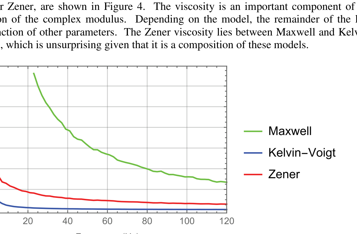 A A A Predicting the behavior of commercially available building foundation isolation materials using a four-parameter fractional Zener model. Colin Bradley 1 Faiz Musafere 2 Josh Havin 3 Matthew Golden 4 Pliteq, Inc. 131 Royal Group Crescent Vaughan, ON, Canada, L4H 1X9 ABSTRACT In this paper we apply a four-parameter fractional Zener model to describe the short- and long-term creep behavior of a viscoelastic recycled-rebonded-crumb-rubber isolating material in noise and vibration mitigation applications. Building from the classical rheological models composed of springs and dashpots suitably combined (Maxwell, Kelvin-Voight, Zener), we include a fractional derivative component in the form of a Scott-Blair element composed of a Caputo derivative of non- integer order. The parameters for each model are identified empirically through measured stress- strain results and hysteresis curves for the material in compression. The models are then compared to the results of a 168h constant load creep test of a commercially available material. 1. INTRODUCTION As a means of vibration isolation, viscoelastic materials are an attractive choice due to their wide range of mechanical properties and ease of implementation. A detailed understanding of the dynamic behavior of the material is necessary for these parameter-sensitive applications. Viscoelastic materials, by definition, have material properties that are dependent on the applied frequency, static load, dynamic load, and dynamic amplitude, thereby requiring a complex modulus parameter. Here we explore the fundamental behavior of a commercially available recycled-rebonded- crumb-rubber isolation material using Dynamic Mechanical Analysis (DMA) at low to mid frequency ranges in the context of foundation isolation and rail infrastructure. The classic Maxwell, Kelvin- Voigt, and Zener rheological models are considered first and then extended to include a fractional derivative parameter. Using the DMA results, measured based on the procedure and principles of the 1 cbradley@pliteq.com 2 fmusafere@pliteq.com 3 jhavin@pliteq.com 4 mgolden@pliteq.com standard for measurement of viscoelastic properties, DIN 53513 [1], each model’s parameters are determined and compared to actual dynamic performance and long-term creep. 2. RHEOLOGICAL MODELS FOR VISCOELASTIC MATERIALS A basic assumption of viscoelasticity is the dependence of stress on strain history in addition to the instantaneous strain of the material. A relaxation function, 𝑒(𝑡) , convoluted over the strain history, 𝜖(𝑡) , of the material captures this assumption and lends it viscoelastic properties, as displayed in Equation 1. 𝜎(𝑡) = ∫𝜖(𝑡−𝜏)𝑒(𝜏)𝑑𝜏 𝑡 0 (1) A Laplace transform of the convolution leads to a complex modulus dependent on frequency, Equation 2. 𝜎(𝑠) = 𝐸 ∗ (𝑠)𝜖(𝑠) = (𝐸 ′ (𝑠) + 𝑖𝐸 ′′ (𝑠))𝜖(𝑠) (2) Where the complex modulus 𝐸 ∗ is composed of a storage (elastic) modulus 𝐸′ dominated by elastic forces and a loss modulus 𝐸′′ where viscous forces dominate. Using this methodology, viscoelastic problems can be solved as elastic problems. This is known as the elastic/viscoelastic equivalence principle.[2] The component moduli act out of phase with one another, denoted using the imaginary unit ( 𝑖 2 = −1 ). The loss modulus is not to be confused with the loss factor, which is defined as the ratio of the loss modulus to the storage modulus, as it is related to energy dissipation within the material. The value of the dynamic modulus 𝐸 𝑑𝑦𝑛 (𝜎, 𝜔) is simply the magnitude of the complex modulus. In this study, the material we are testing is a complex composite of recycled-rebonded-crumb- rubber with both microscopic and macroscopic structure, each contributing to the viscoelastic behavior of the bulk material. Chemically, rubber is composed of relatively regular long-carbon chains of monomers such as isoprene (natural rubber), or styrene-butadiene, chloroprene etc. based on petroleum production processes (synthetic rubber). These long-chain polymers are then vulcanized with the addition of sulfur and heat allowing relatively strong connections to establish between chains of polymers, increasing the overall strength, toughness, environmental resistances, and elasticity. [3] The vibration isolation materials tested here are composed of thoroughly sorted rubber particles obtained from grinding tires. The particle size distribution is crucial when recombining the rubber into a bulk material, factors such as the degree of packing, density, particle-particle contact area all affect the overall properties of the rebonded-rubber and can be tuned to the desired values with careful engineering. [4] The macroscopic structure of the vibration isolation product can be adjusted in different ways to allow for an additional parameter depending on the required performance. By introducing geometry to control the contact surface area, for example, the load experienced by the material can be adjusted locally to optimize the materials performance. While advantageous to have access to these parameters when engineering a material, it is a complex system to model in its entirety. Simplifying assumptions regarding the behavior of the system are necessary when considering the viscoelastic behavior of the material. We start by considering the classical Maxwell, Kelvin-Voigt, and Linear Zener models in Figure 1. Maxwell Kelvin-Voigt Linear Zener 𝜂 1 𝐸 1 𝜎̇ = 𝜂 1 𝜖̇ (3) 𝜎= 𝐸 1 𝜖+ 𝜂 1 𝜖̇ (4) 𝜎+ 𝜂 1 ( 𝐸 1 +𝐸 2 ) 𝜂 1 𝐸 1 𝜎̇ = 𝐸 2 𝜖+ 𝜎+ 𝐸 1 𝜖̇ (5) Figure 1: Schematic and governing equations for several rheological models. Through dynamic mechanical analysis according to DIN 53513, “Determination of Viscoelastic Properties of Elastomers”, we measure the complex modulus and loss factor directly through a procedure involving a frequen