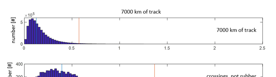 A A A Deriving parameters for the characterisation of the railway track quality in relation to environmental vibration Hielke Zandberg 1 ProRail Moreelsepark 3, Utrecht Agnes van Uitert 2 ProRail Moreelsepark 3, Utrecht Arnold Koopman 3 Level Acoustics & Vibration De Rondom 10, Eindhoven ABSTRACT Unevenness in track geometry, like longitudinal waves, track stiffness variations in transitions zones near bridges or culverts and irregularities like welds, insulated joints, switches and crossings, etc. induce dynamic forces into the wheel-rail interface of train and track. They are an important source for ground-borne vibrations. In the Netherlands, track unevenness is monitored to facilitate maintenance management using a Track Recording Car (TRC). Data of the TRC measuring campaigns is stored and available for stakeholders working in the field of rail maintenance or railway engineering. A database has been build using historical data of the TRC measurements dating back to 2013, together with meta data of track components such as insulated joints, switches, crossings, culverts, etc. To analyse the data, new parameters were defined how to best summarise PSD (Power Spectral Density) diagrams for characterising the track quality concerning environmental vibrations. This paper will show how these parameters can be used to compare track quality and quality of track components regarding environmental vibrations. The study analyses differences in track quality near transition zones like bridges, crossings and culverts in relation to vibration values. Results show that these parameters can give insight to railway professionals how to assess track quality and quality of track components in relation to vibration levels in dwellings nearby the track. 1. INTRODUCTION Surfaces of railway tracks are not entirely smooth. Irregularities like welds, insulated joints, switches and crossings, and track stiffness variations in transitions zones near bridges or culverts, induce dynamic forces into the wheel-rail interface. In the long run these forces introduce unevenness in track geometry like longitudinal waves. In the Netherlands and many other countries track (and 1 Hielke.Zandberg@prorail.nl 2 Agnes.vanUitert@prorail.nl 3 Arnold.Koopman@ levelav.nl sl 4) inter.noise 21-24 AUGUST SCOTTISH EVENT CAMPUS GLASGOW rail) unevenness is monitored to facilitate maintenance management using a Track Recording Car (TRC), mainly to determine the need for maintenance such as tamping of the track ballast. Wavelengths down to 3 m are measured according EN standard 13848 every six months. In this paper two of three expressed wavelengths ( λ ) ranges are considered: D1: 3 m < λ < 25 m, and D2: 25 m < λ < 70 m. Since 2021 also the D0 wavelength range D0: 1 m < λ < 5 m is measured. Data of these TRC measuring campaigns is stored and available for stakeholders working in field of rail maintenance or railway engineering. Railway traffic is an important source of ground-borne vibrations. Frequencies between 2 and 80 Hz are important for the human perception of vibrations. This corresponds with wavelength between 20 cm and 20 m for train speeds between 40 and 140 km/h. To characterise the quality of the track in more detail often power spectral density (PSD) estimation techniques are applied, which calculates the energy of a signal in relation to frequency (see i.e. Esveld [4], paragraph 16.12.3). In this case in relation to wavelength for a given track section. When complaints about rail vibrations are received from dwellings nearby a railway track, PSD diagrams are also produced from the TRC data to analyse track quality. There is a need to characterise track quality in relation to environmental vibration levels caused by passing trains on a larger scale. TRC data could then also be used to determine locations with possible risks for complaints. Different type of track components could also be compared in relation to the vibration emission. Therefore a study was conceived to develop parameters how to best summarise PSD diagrams of TRC data. These parameters should also be able to describe track unevenness and quality of track components in relation to environmental vibrations. Track components like crossings, bridgeheads, insulation joint, etc. contain track stiffness variations in longitudinal direction causing dynamic forces in the rail wheel interface and over time track unevenness, which will in turn emphasise dynamic forces and thus in time cause a further increase of the track unevenness. When vibration quality parameters are applied to historical TRC data, track quality and quality of different track components can more easily be analysed in relation to vibration emission. Vibration quality parameters can also be used as output in vibration emission models for railway tracks. This will help to get a better insight the vibration emission of track components or help to improve track design or track maintenance in relation to vibrations. Last but not least, vibration quality parameters can also be used as input for vibration propagation models, like those used for environmental assessment studies. 2. DESCRIPTION OF THE DATABASE For this study a database was built merging historical data of the TRC measurements back to 2013 with Prorail meta data of track components such as: insulated joints, switches, crossings, culverts, bridgeheads, etc. These meta data consists of, next to coordinates, information such as: brand, type, year of installation, etc. TRC data in the EN 13848 D1 and D2 wavelength range were collected in the database. Due to a spatial resolution of 25 cm and 7000 4 km of measured track, this resulted in approximately 28 million datapoints for each measuring campaign. In total, data from 13 measuring campaigns could be stored in a database covering 7 years of measurements. This data could be merged with metadata of track components using a ProRail unique identifier earmarking each track branch between two swi